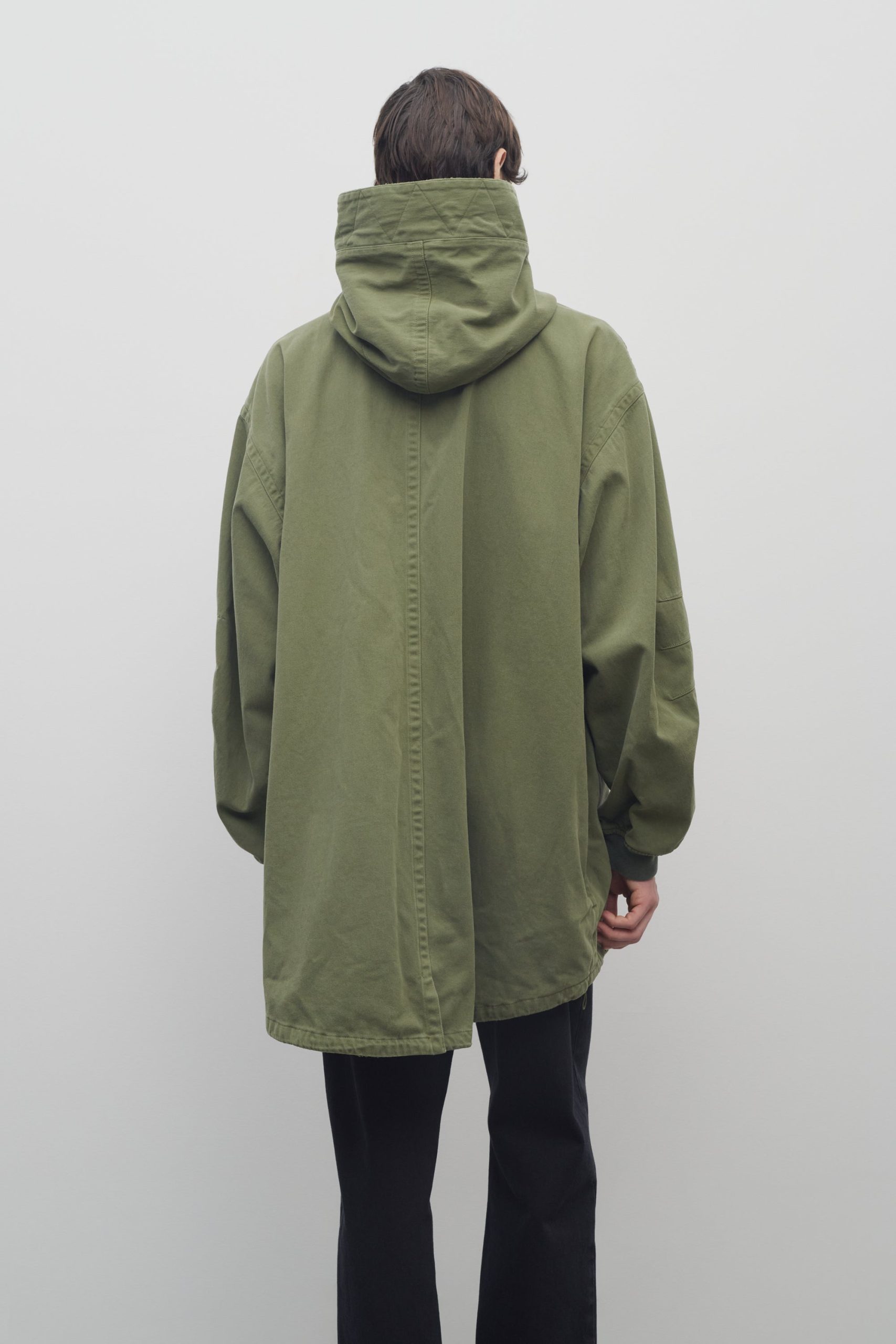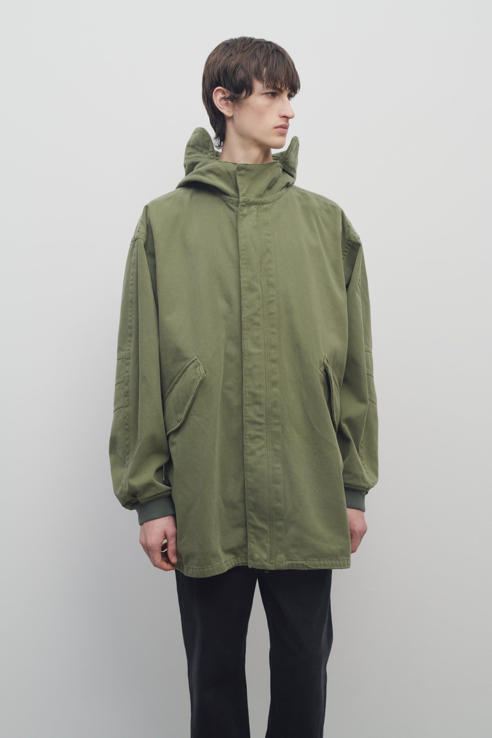 Relaxed hooded parka in durable washed cotton with ribbed cuffs. front flap pockets. and concealed front placket with snap and zipper closure.