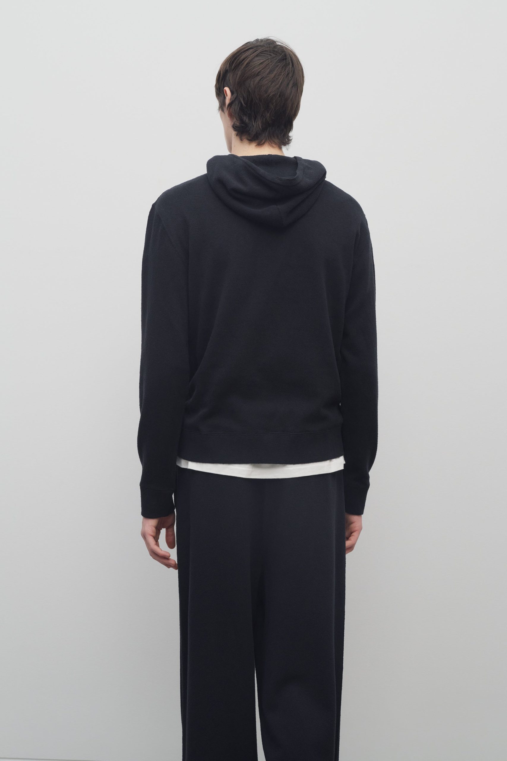 Hooded sweatshirt in stonewashed silk jersey with drawstring hood. front pouch pocket. and ribbed cuffs and hem.