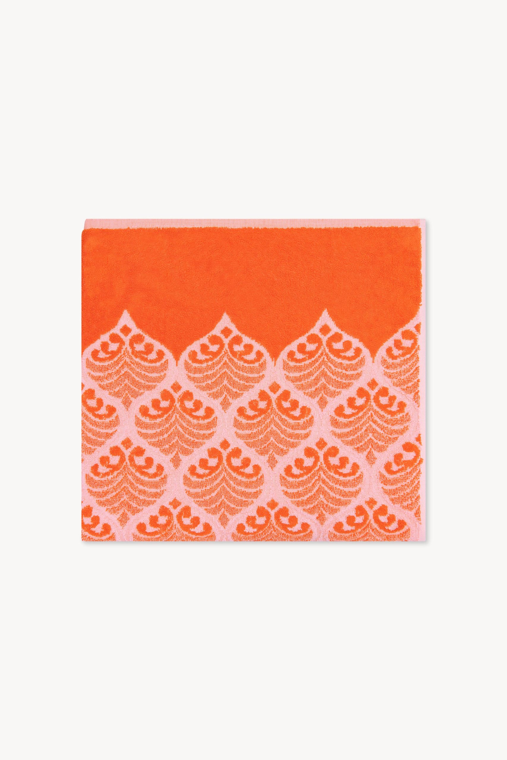 Elegant large towel in soft yarn-dyed cotton with ornamental pattern detailing.