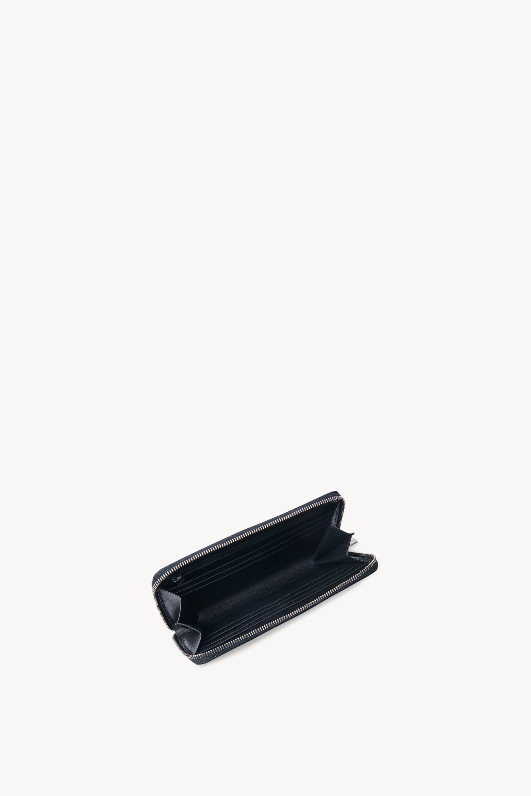 Rectangular wallet in smooth nappa leather with gusseted side panels. interior card slots. and zipper closure.