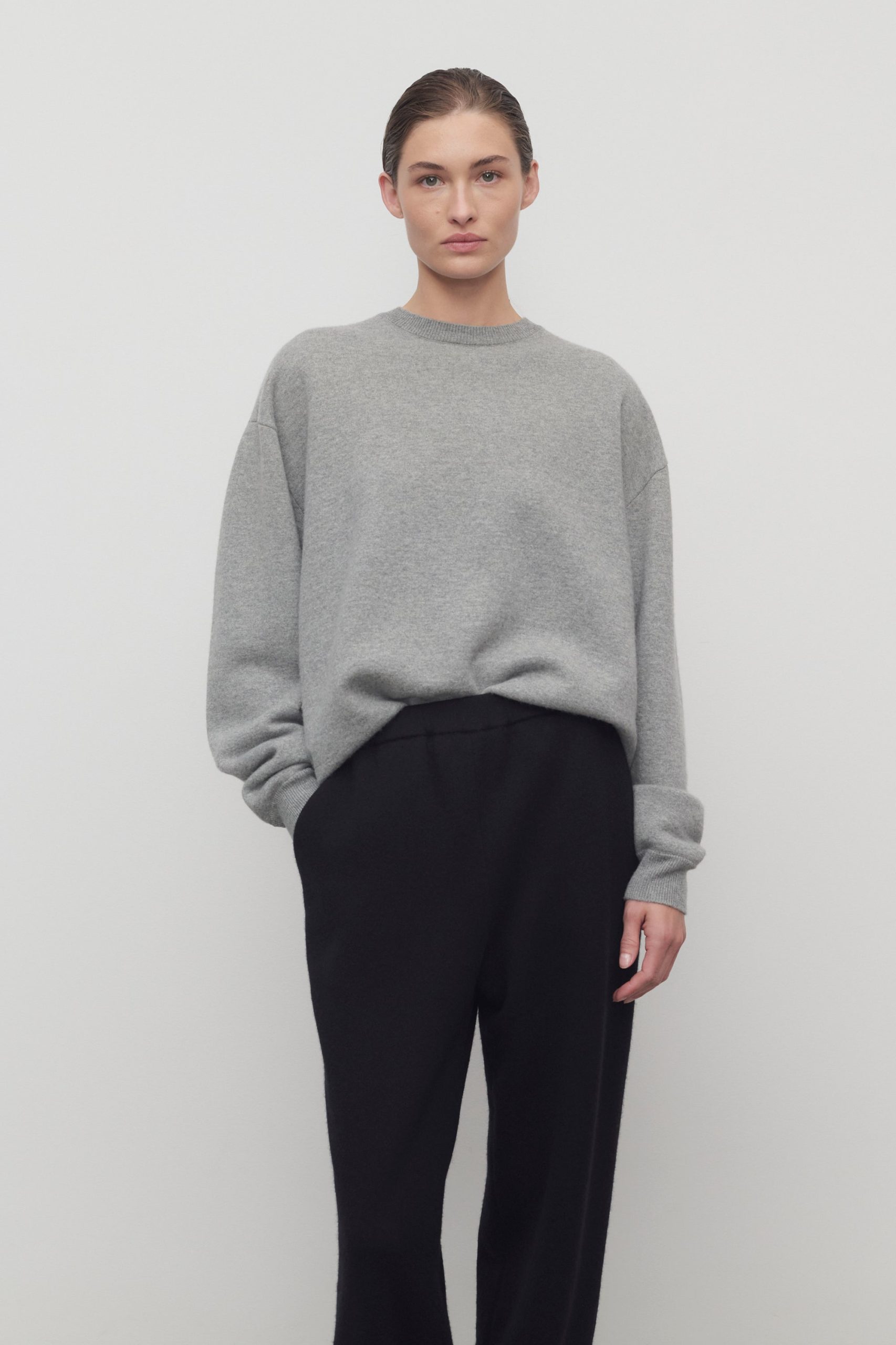 Classic crewneck sweater in ultrafine cashmere with relaxed fit. looped terry interior. and ribbed neckline. cuffs. and hem.