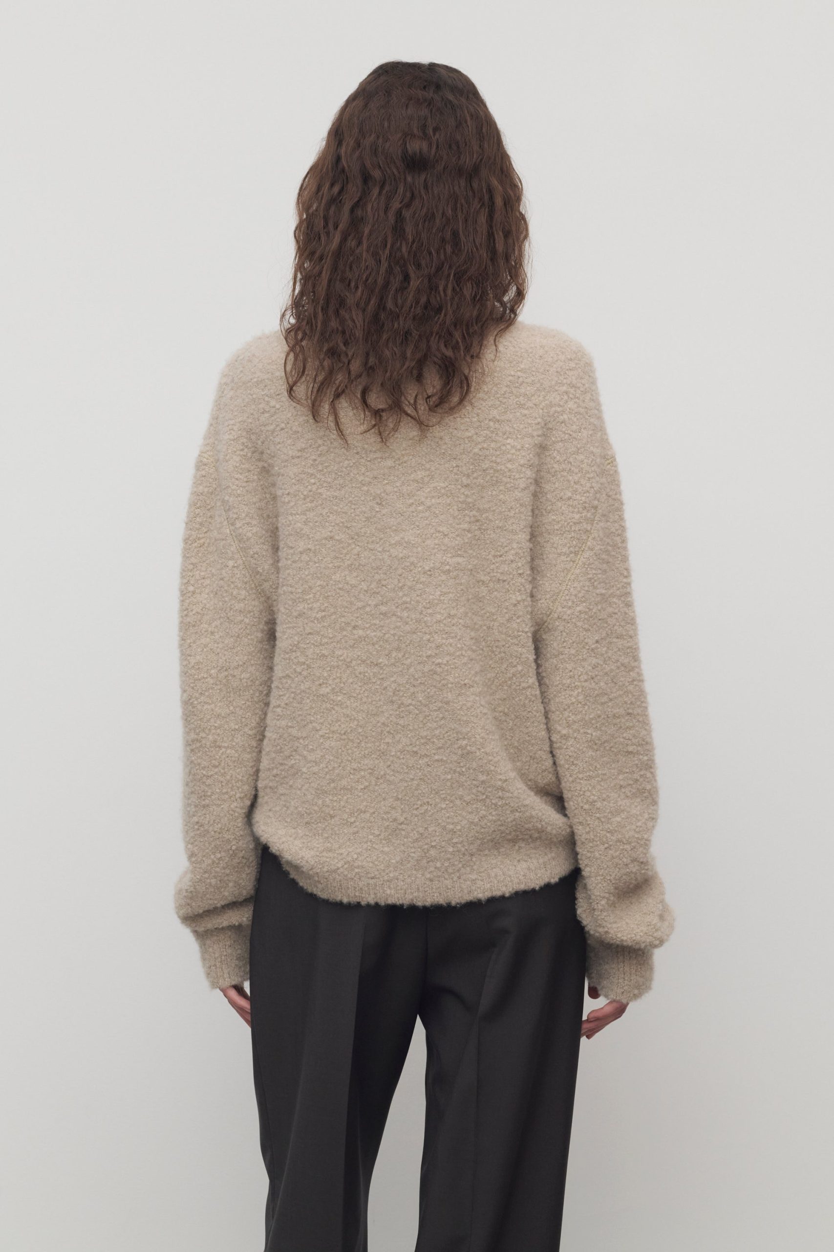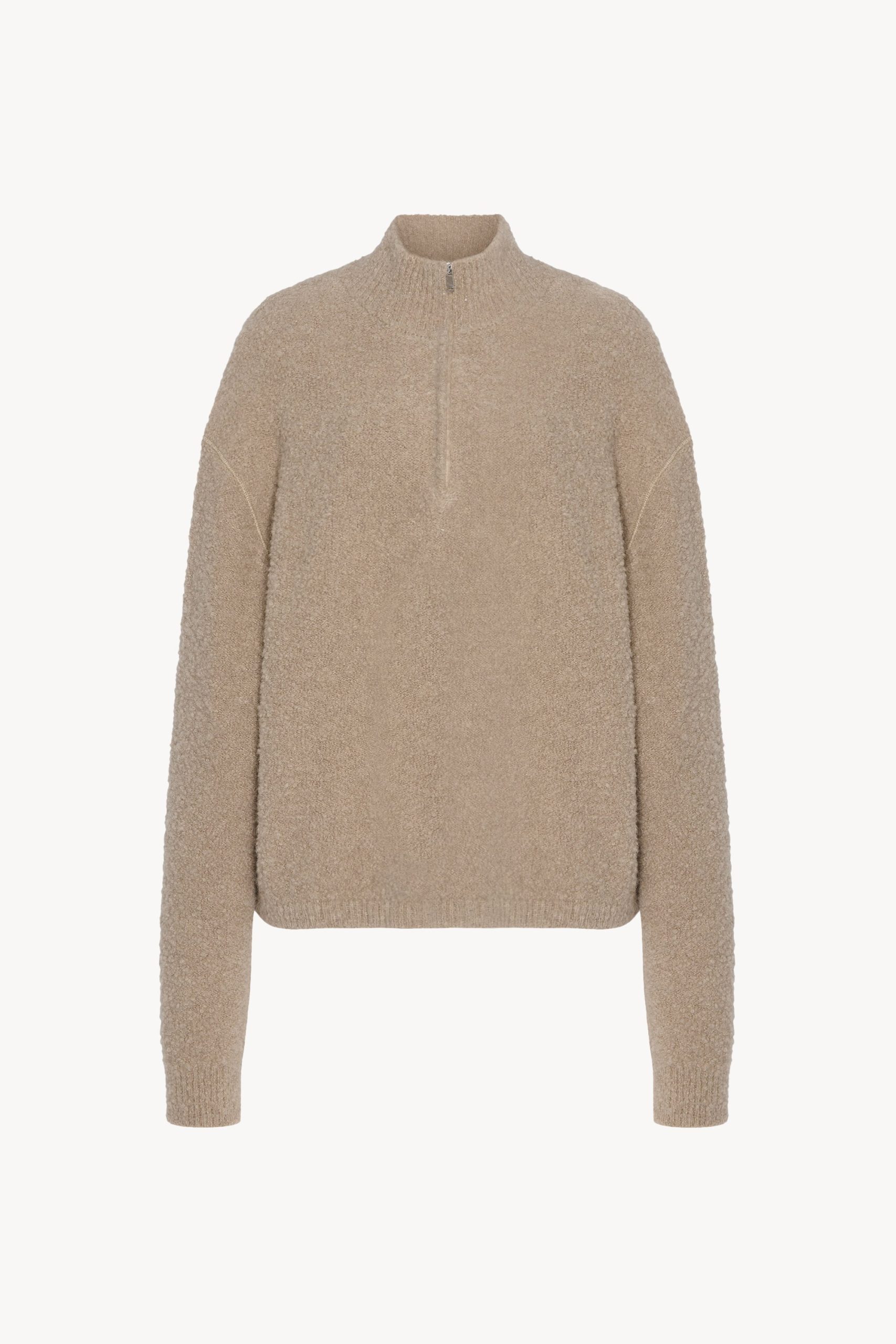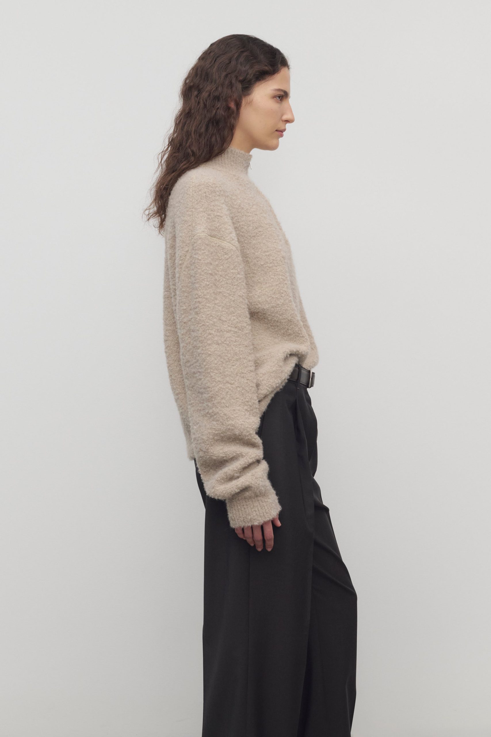 Boxy turtleneck sweater in textured alpaca and cashmere bouclé with front half-zip closure. topstitched armholes. and ribbed neckline. cuffs. and hem.