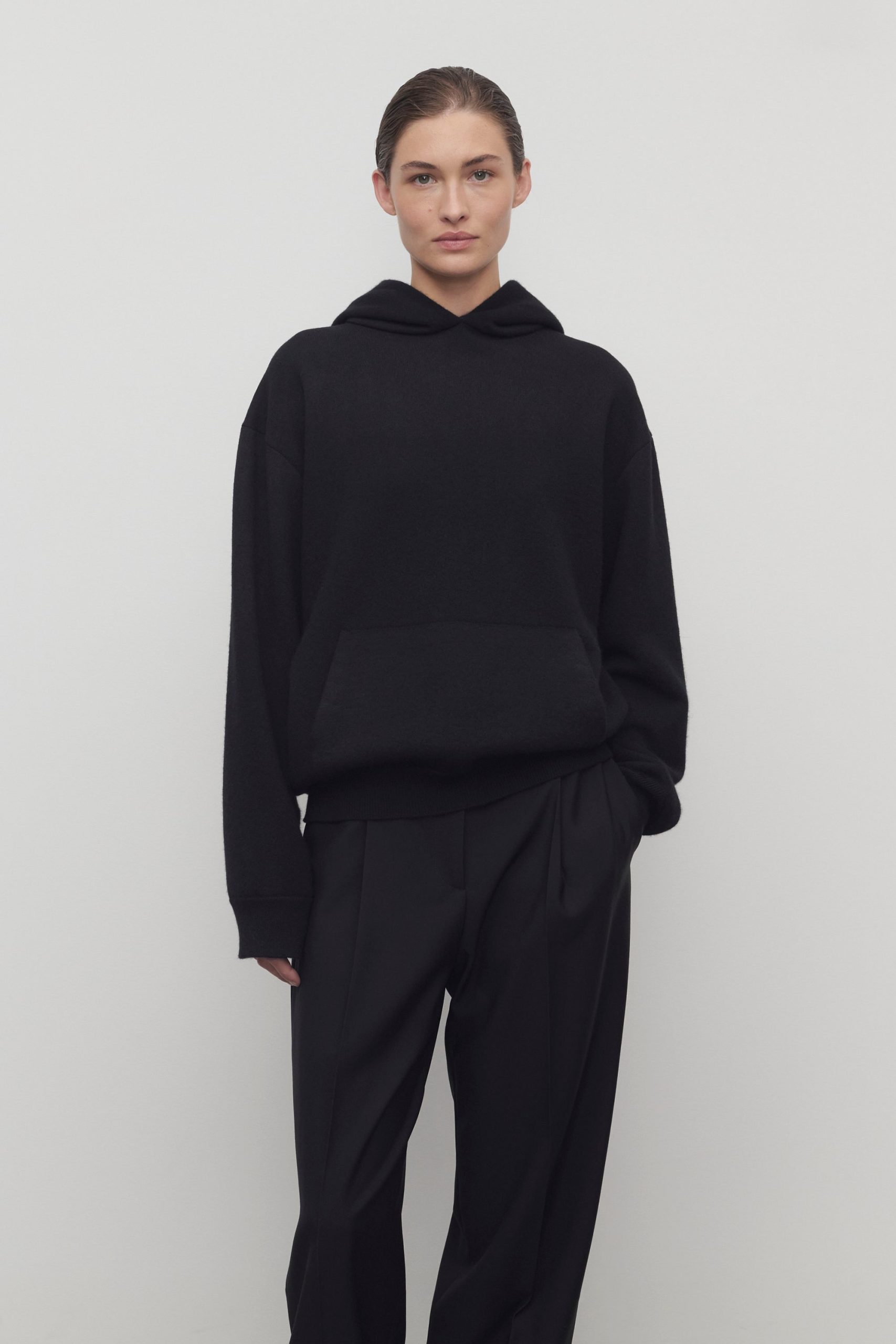 Relaxed hooded sweater in ultrafine cashmere with looped terry interior. front pouch pocket. and ribbed cuffs and hem.