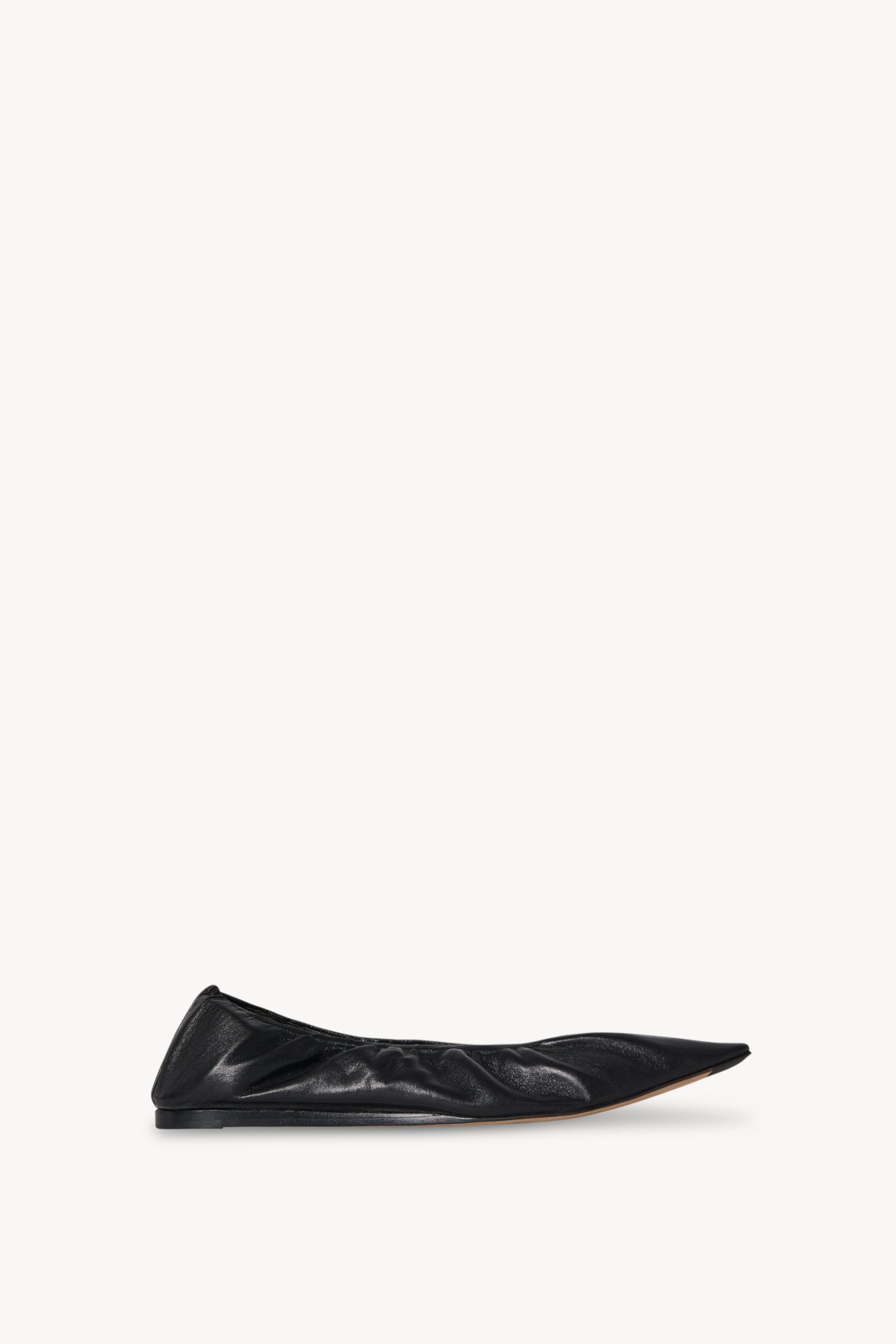 Minimal flat shoe in soft lambskin leather with pointed toe. soft elastic trim. and leather sole.