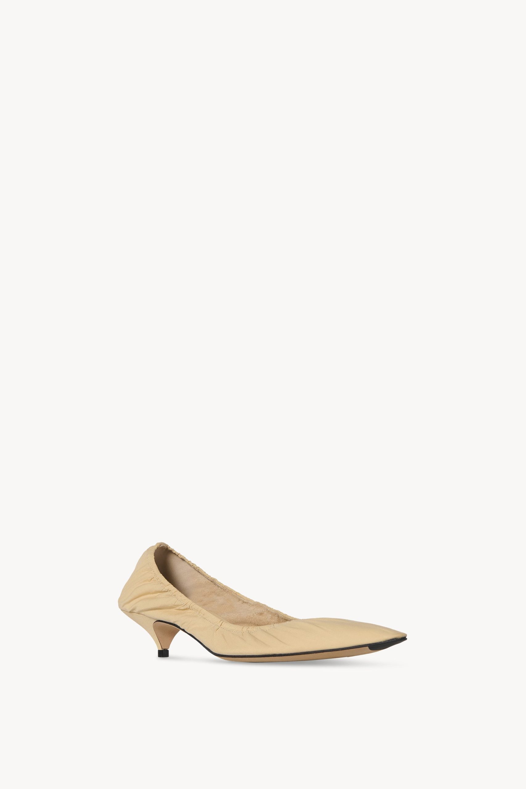 Kitten heel in washed cotton poplin with pointed toe. soft elastic trim. and leather sole.