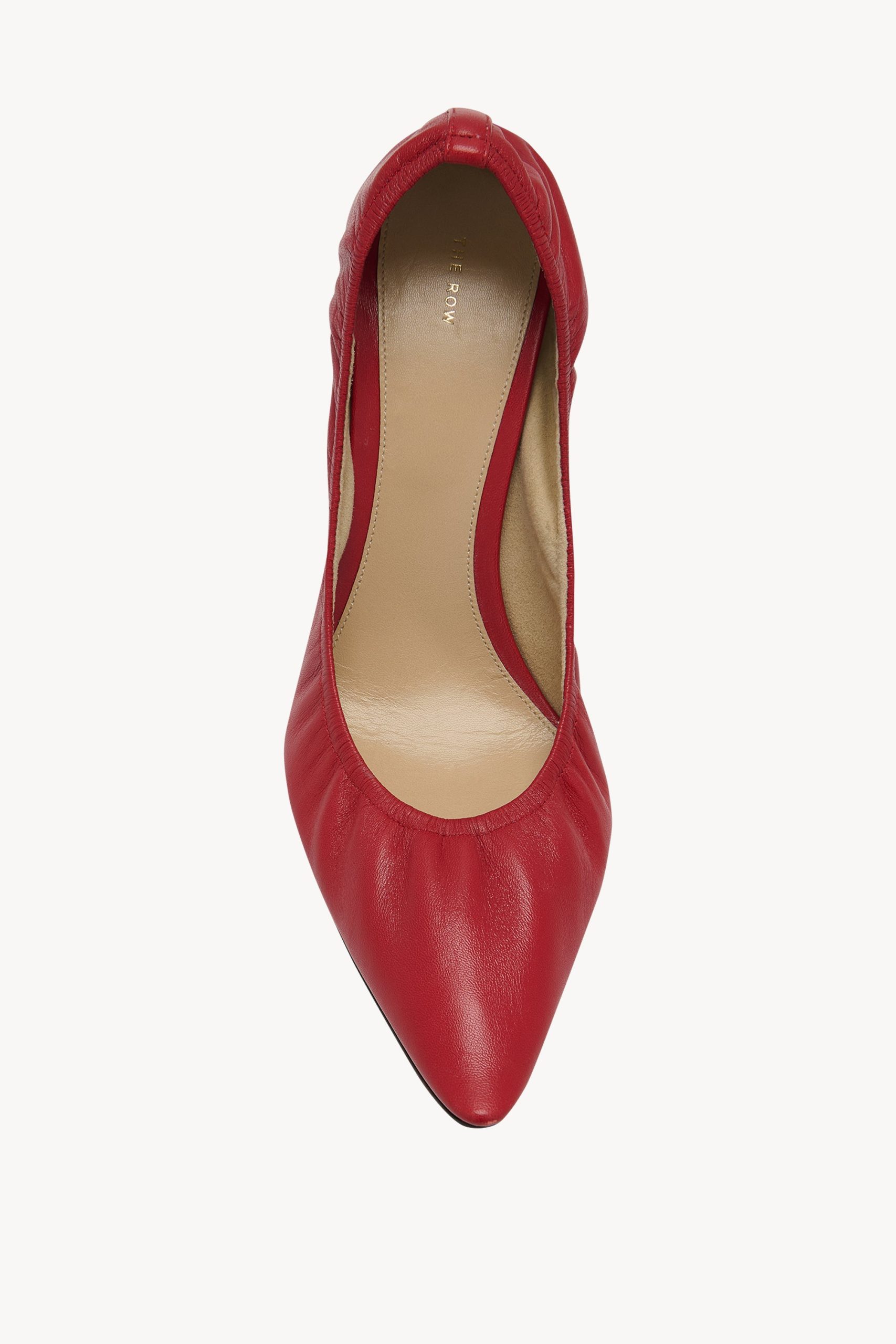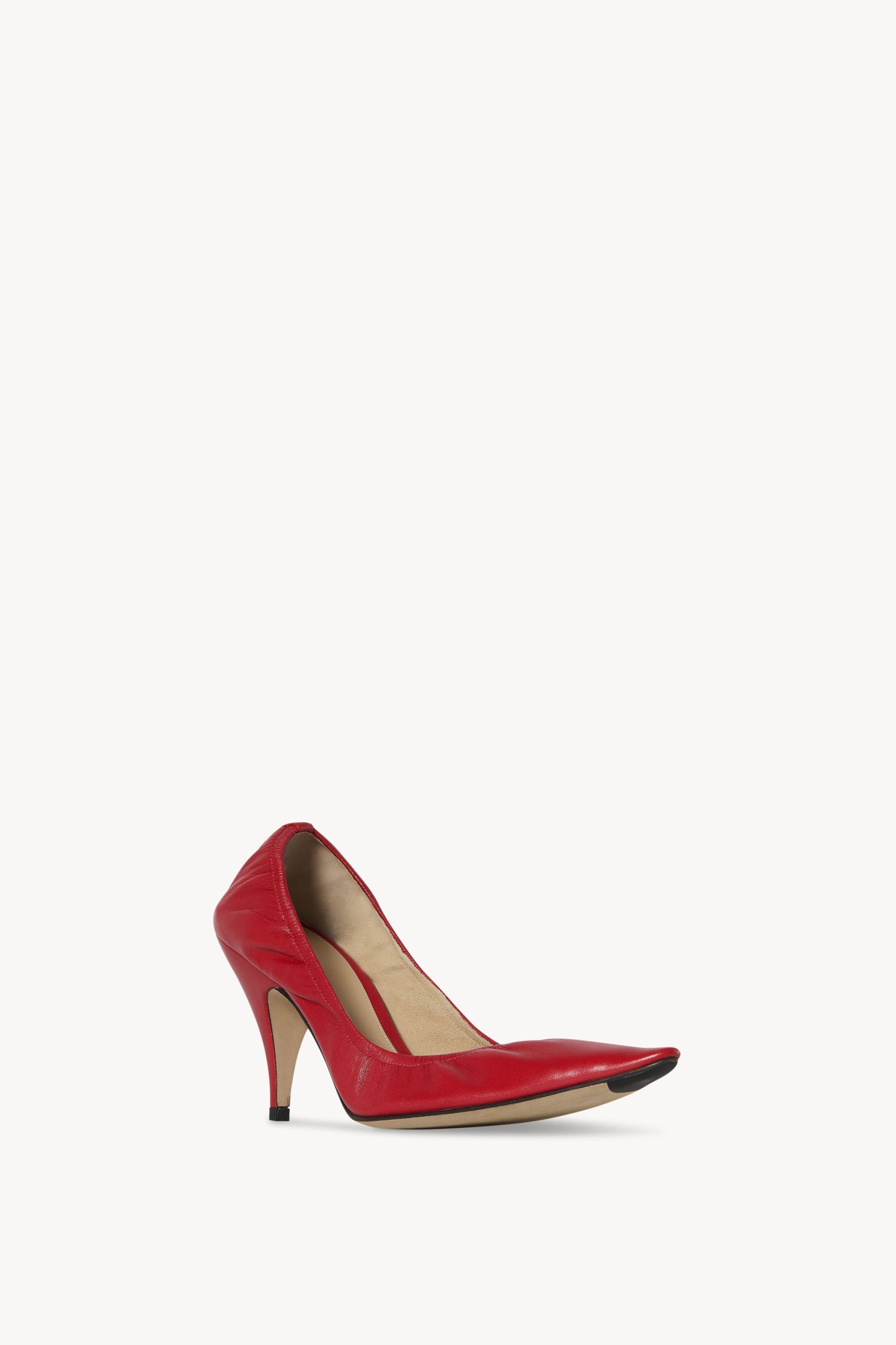 High heel shoe in soft lambskin leather with pointed toe. soft elastic trim. and leather sole.