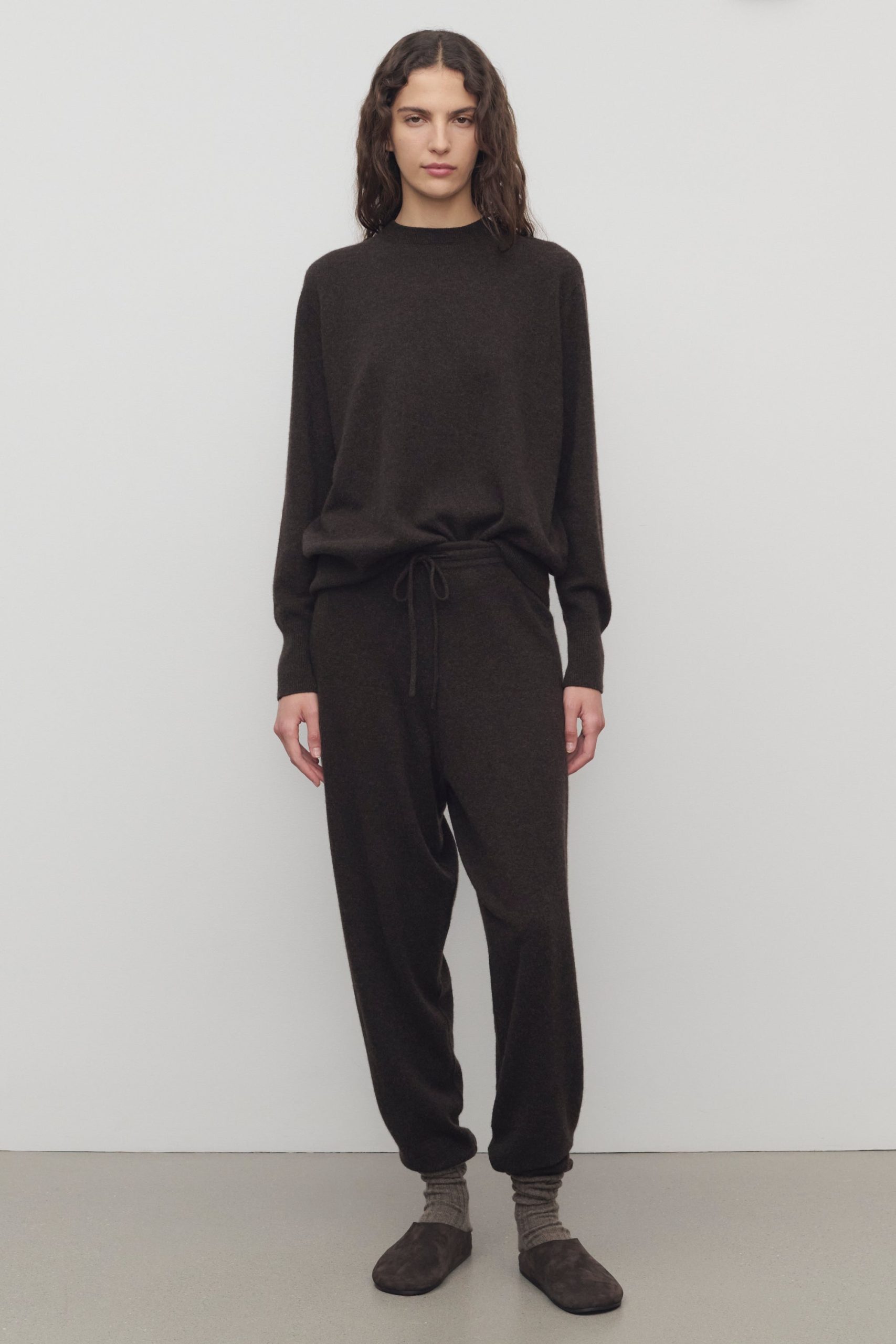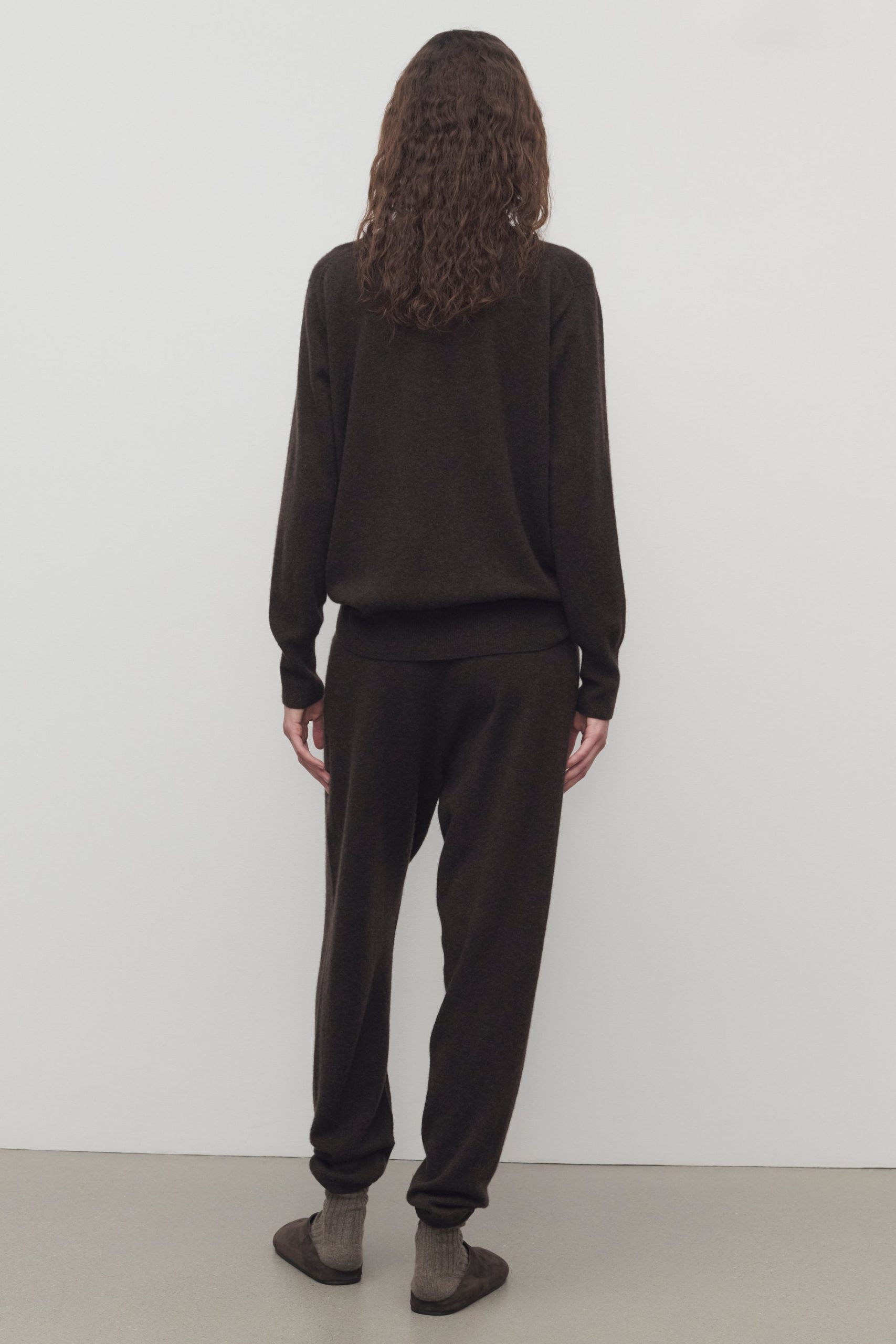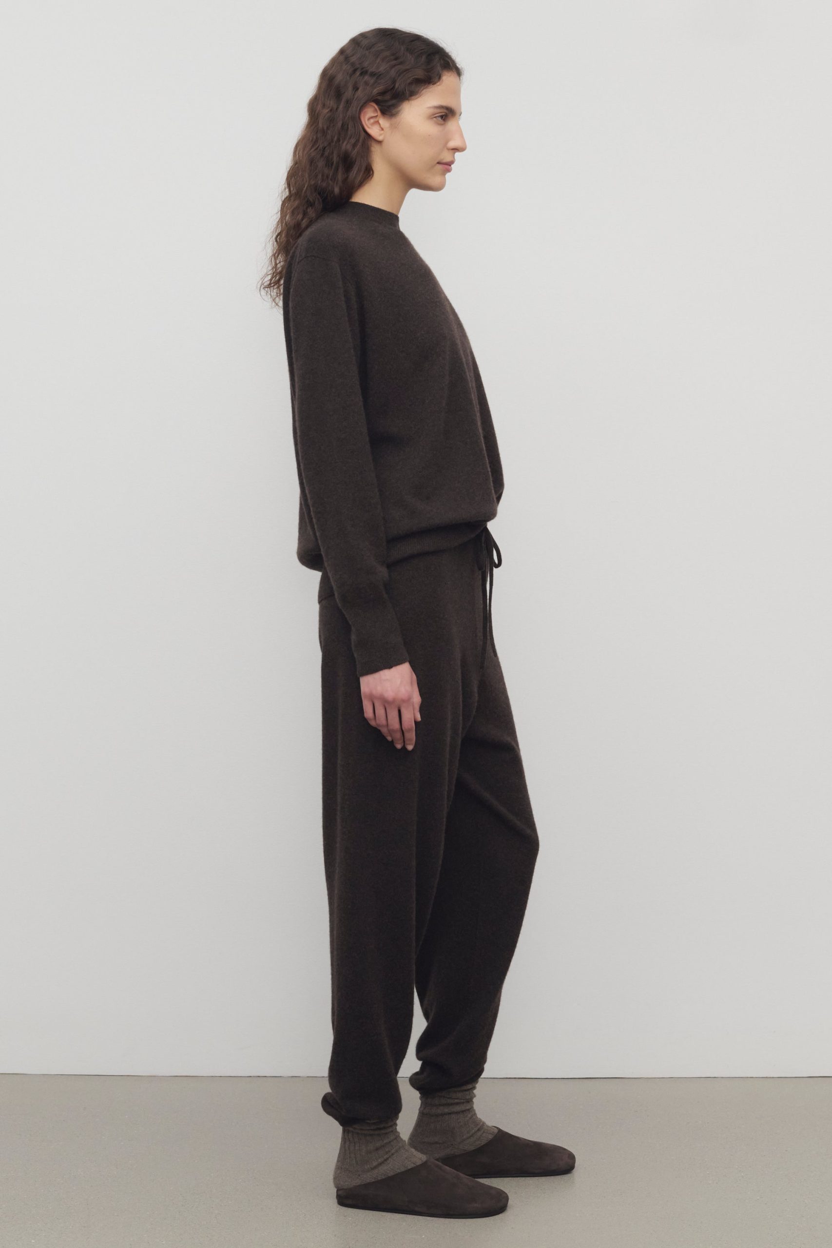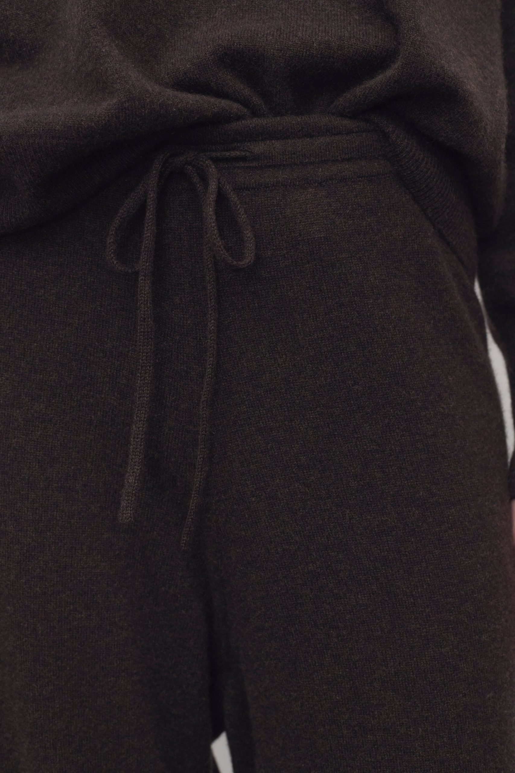 Mid-rise jogger pant in soft cashmere with slightly tapered leg and drawstring waist.