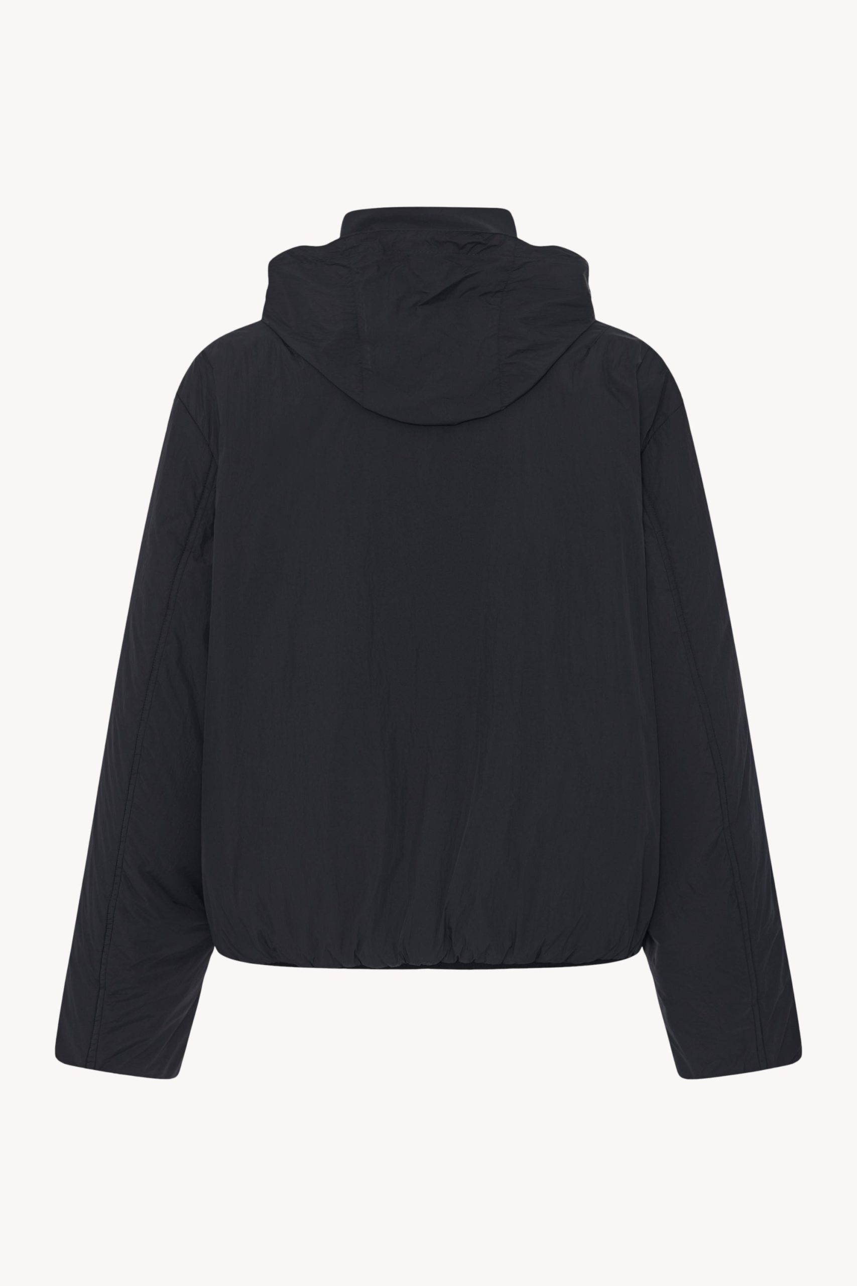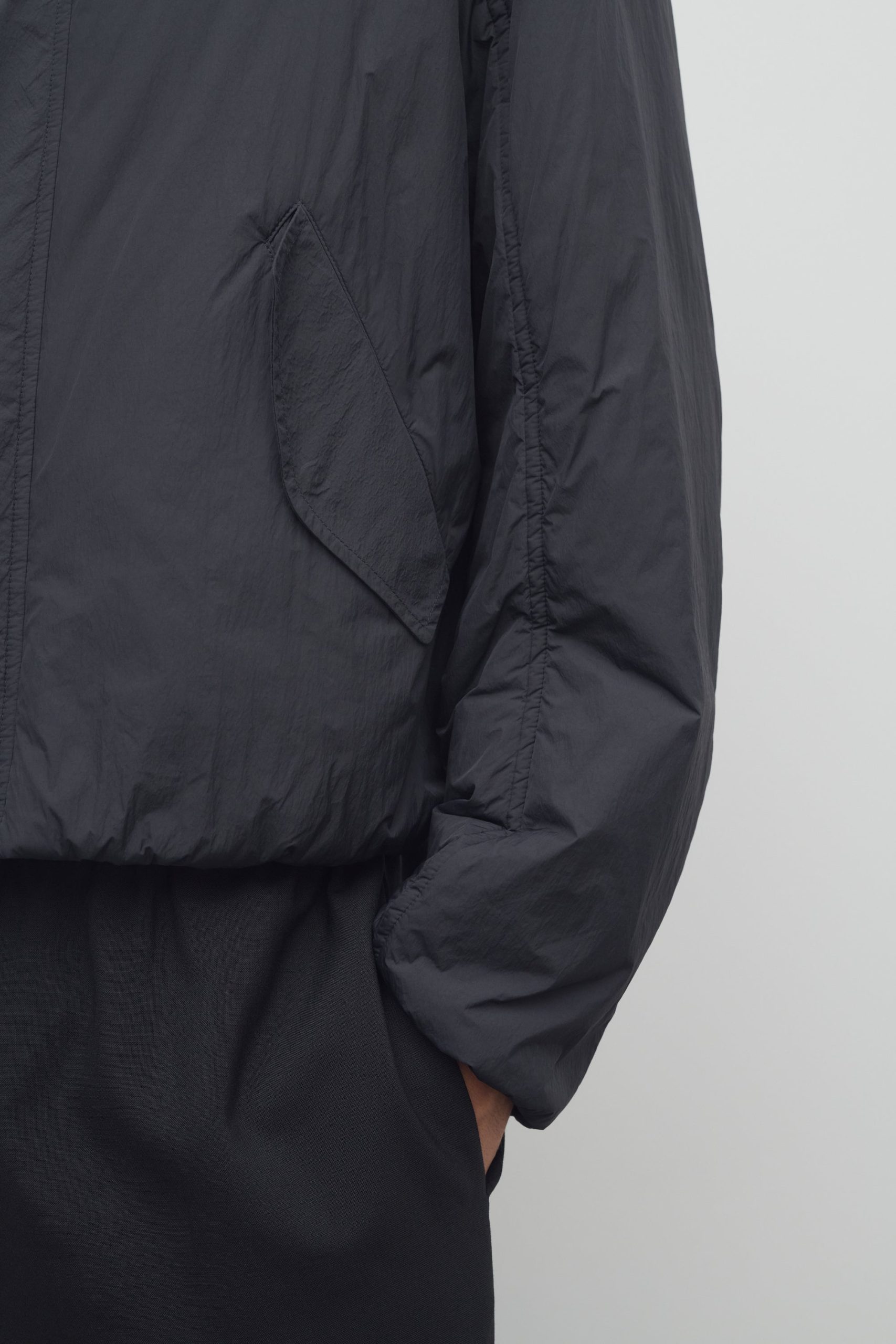 Technical bomber jacket in lightweight water repellent nylon with elasticated hood and cuffs. slanted front flap pockets. and concealed front placket with snap and zipper closure.