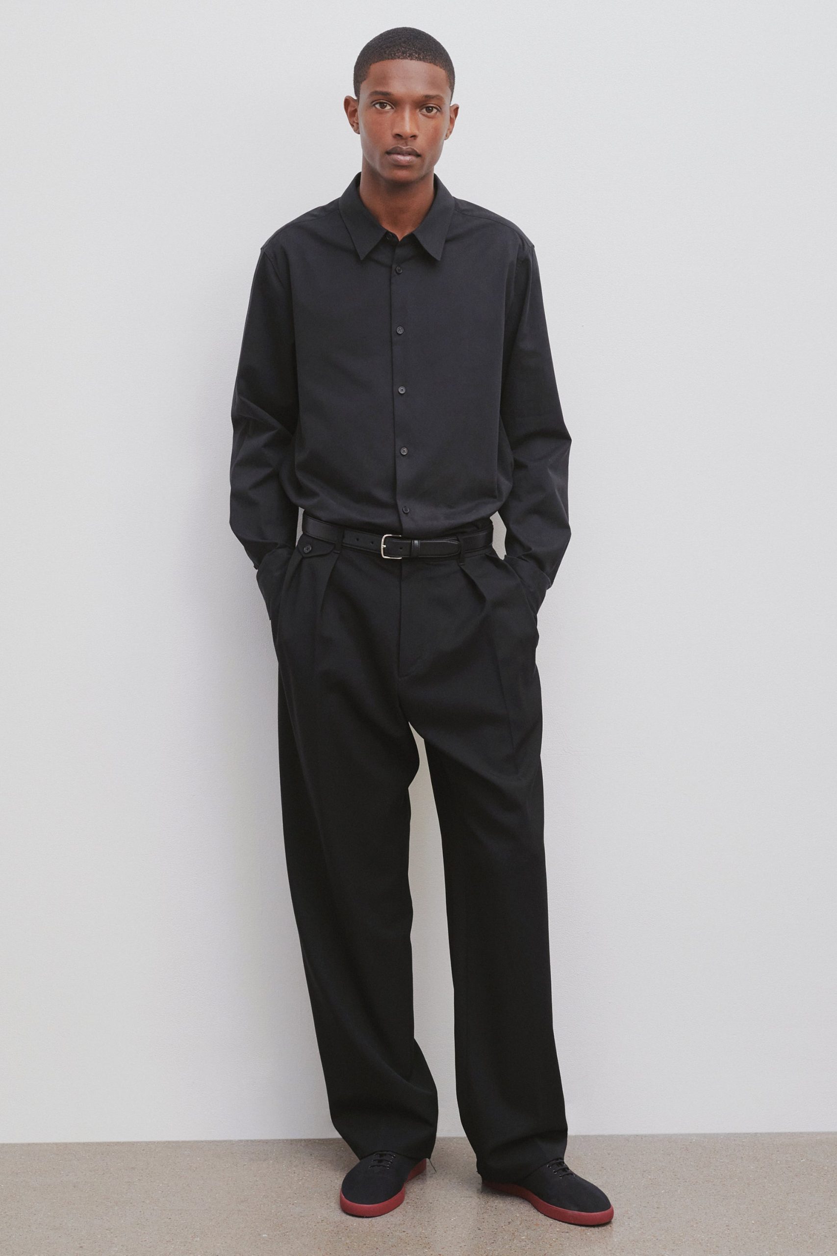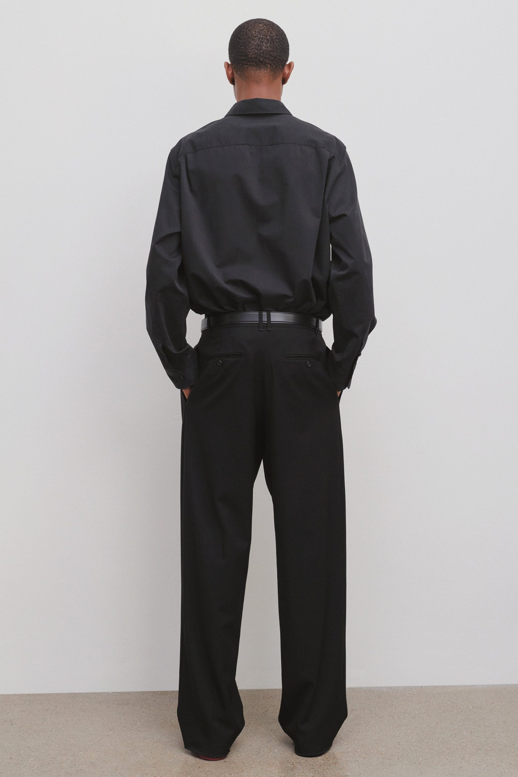 Mid-waisted pant in soft wool gabardine with double pleated front. side seam pockets. button-down back pockets and triangular coin pocket.