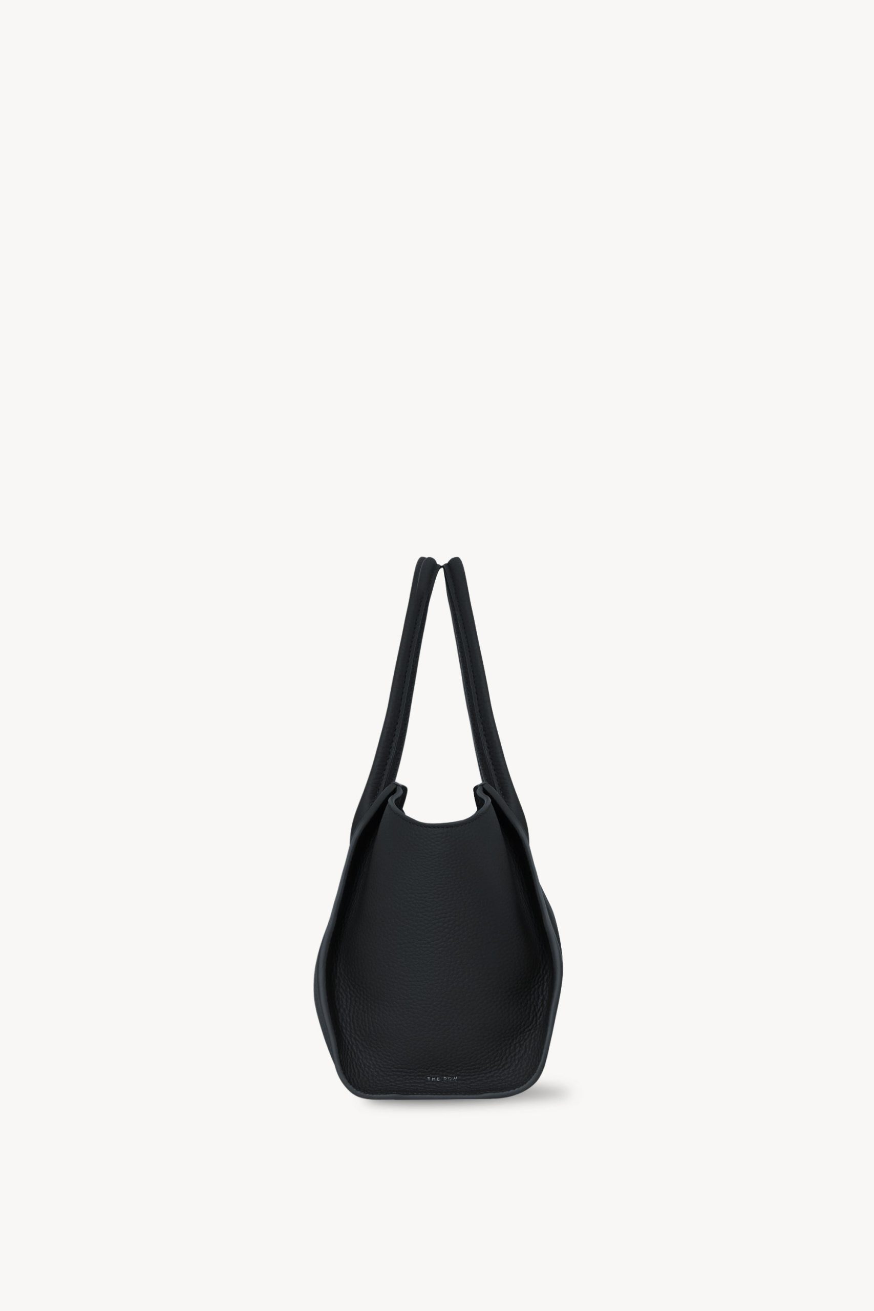 Softly structured tote bag in matte grained calfskin leather with tubular handles. gusseted side panels. and top zipper closure.