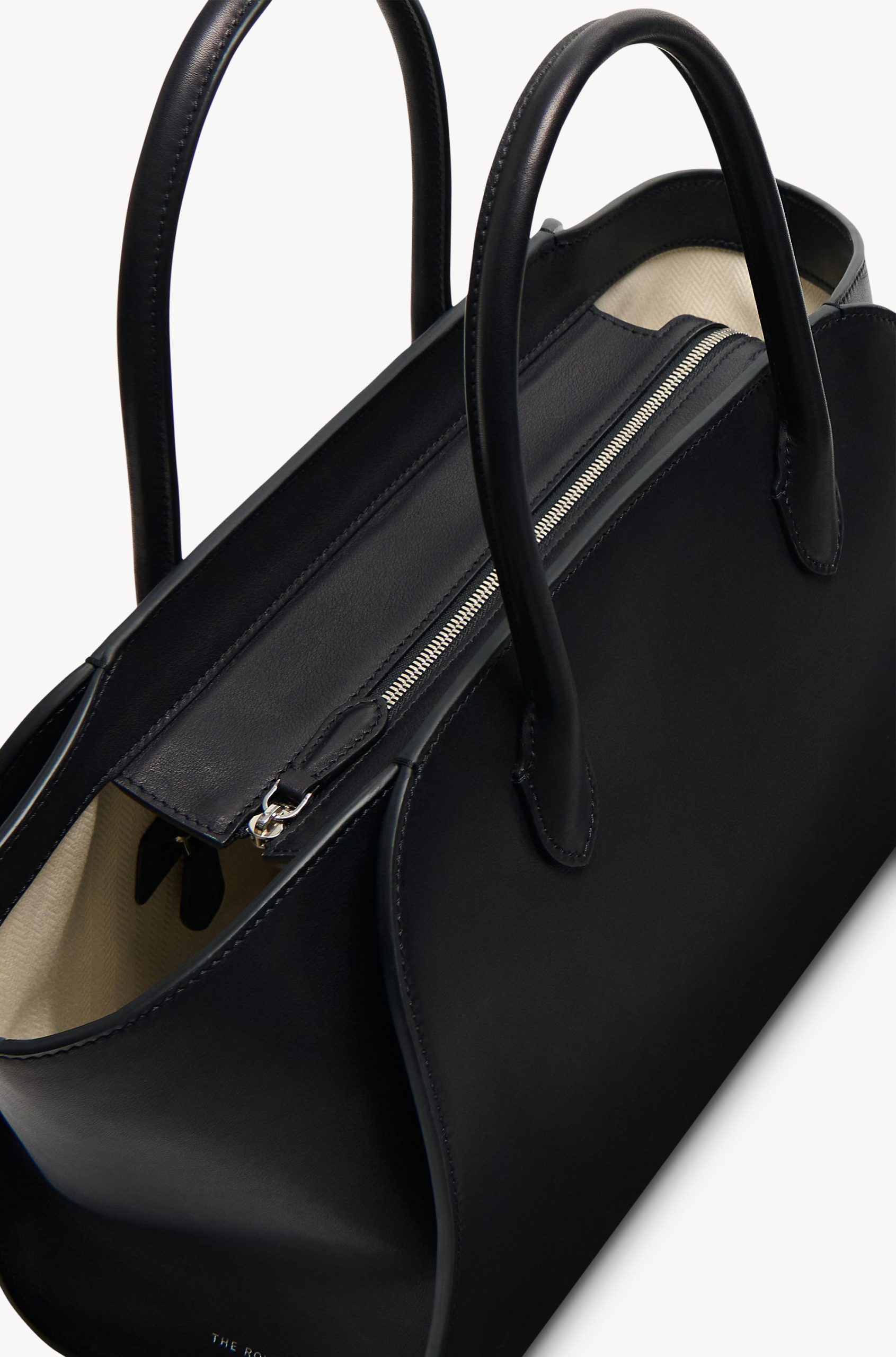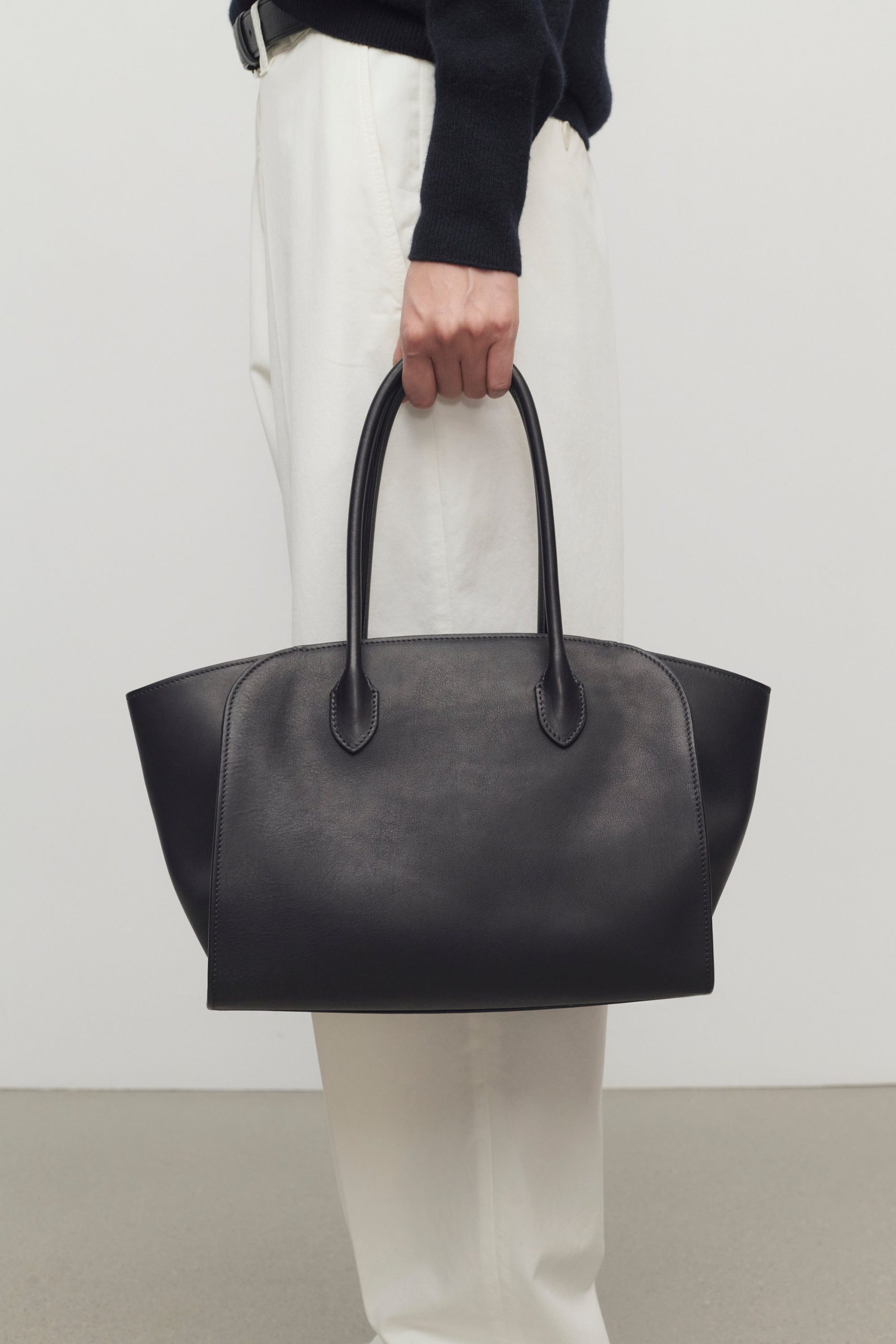 Softly structured tote bag in polished saddle leather with tubular handles. gusseted side panels. and top zipper closure. Untreated and drum-dyed. the leather develops character with time and use.