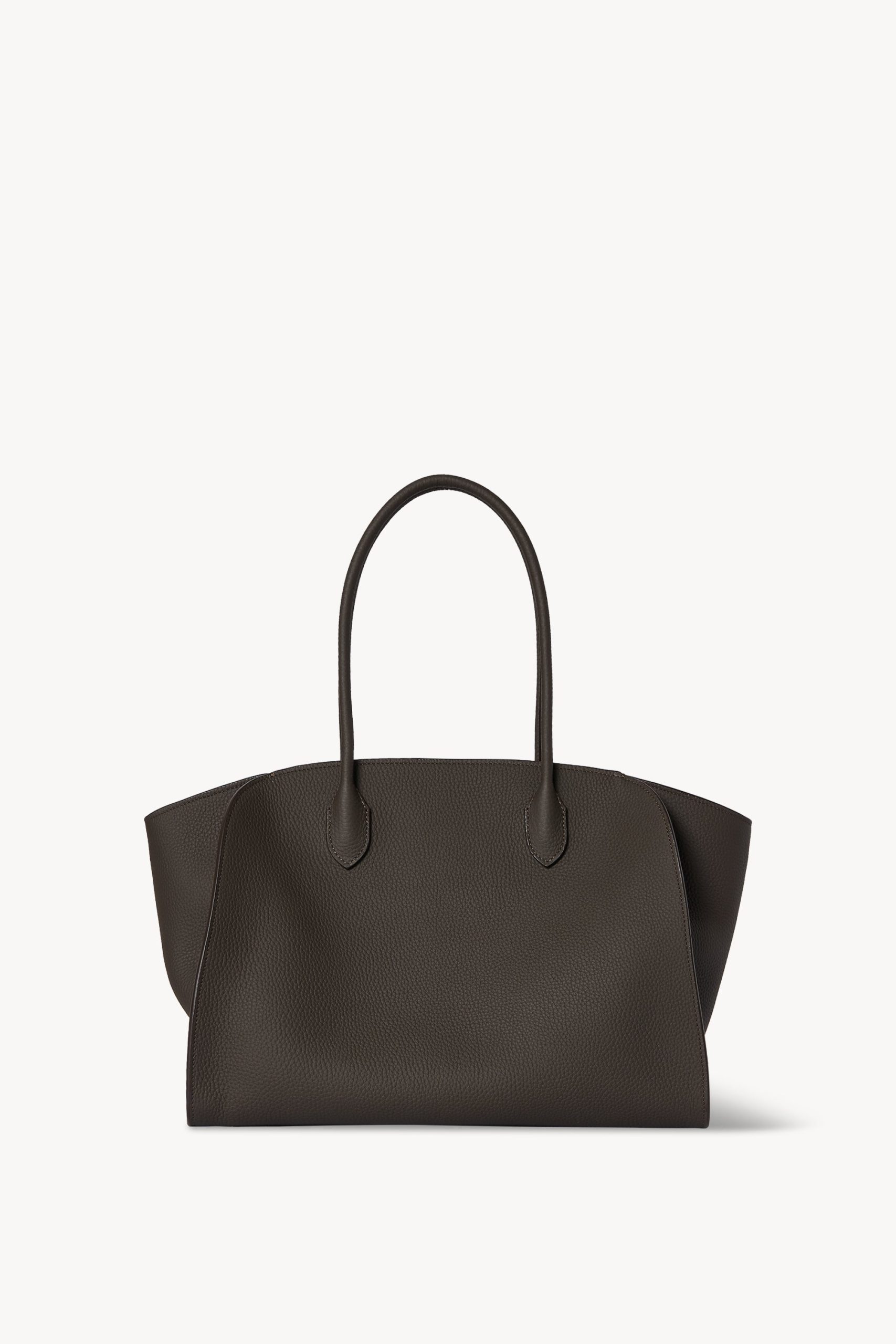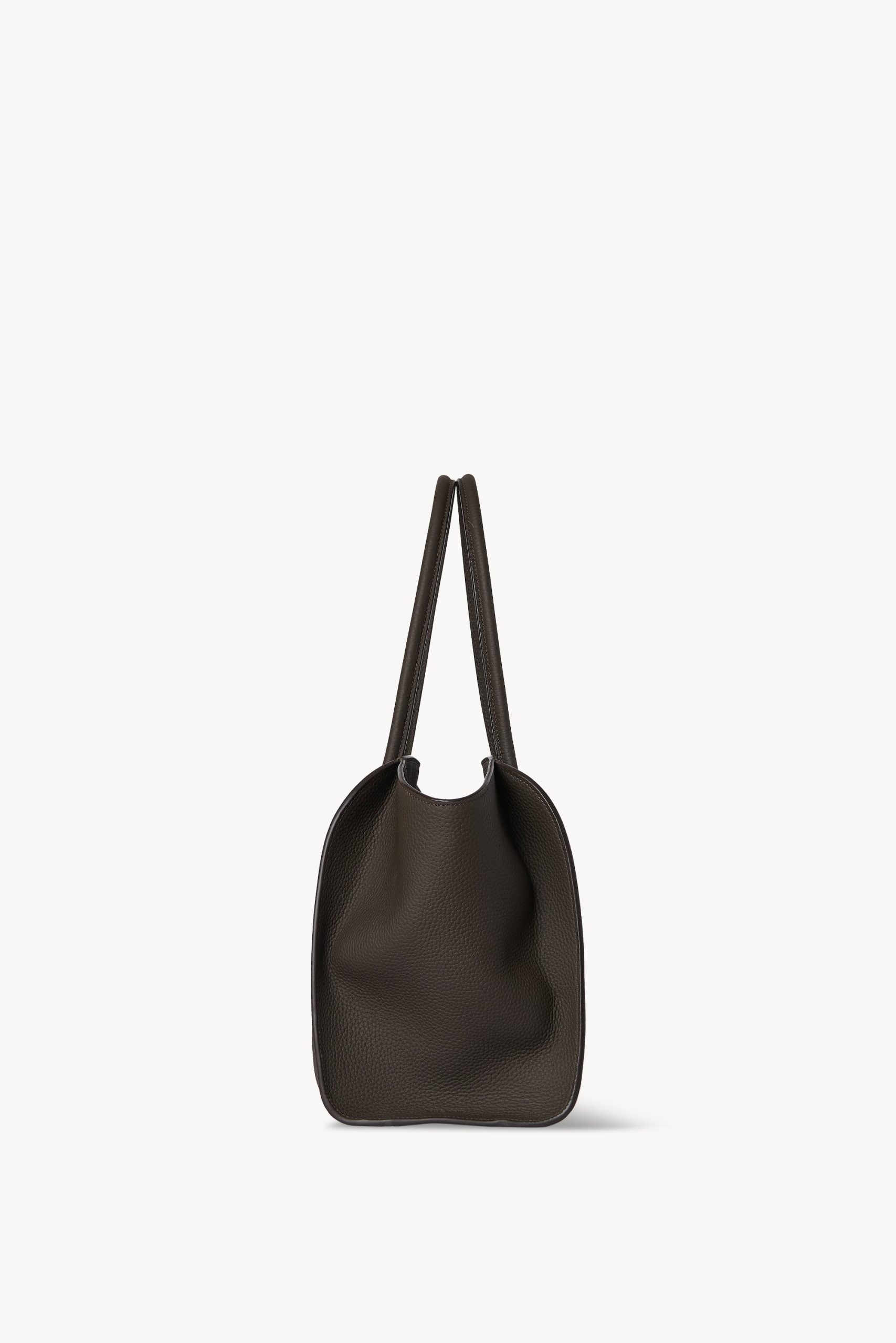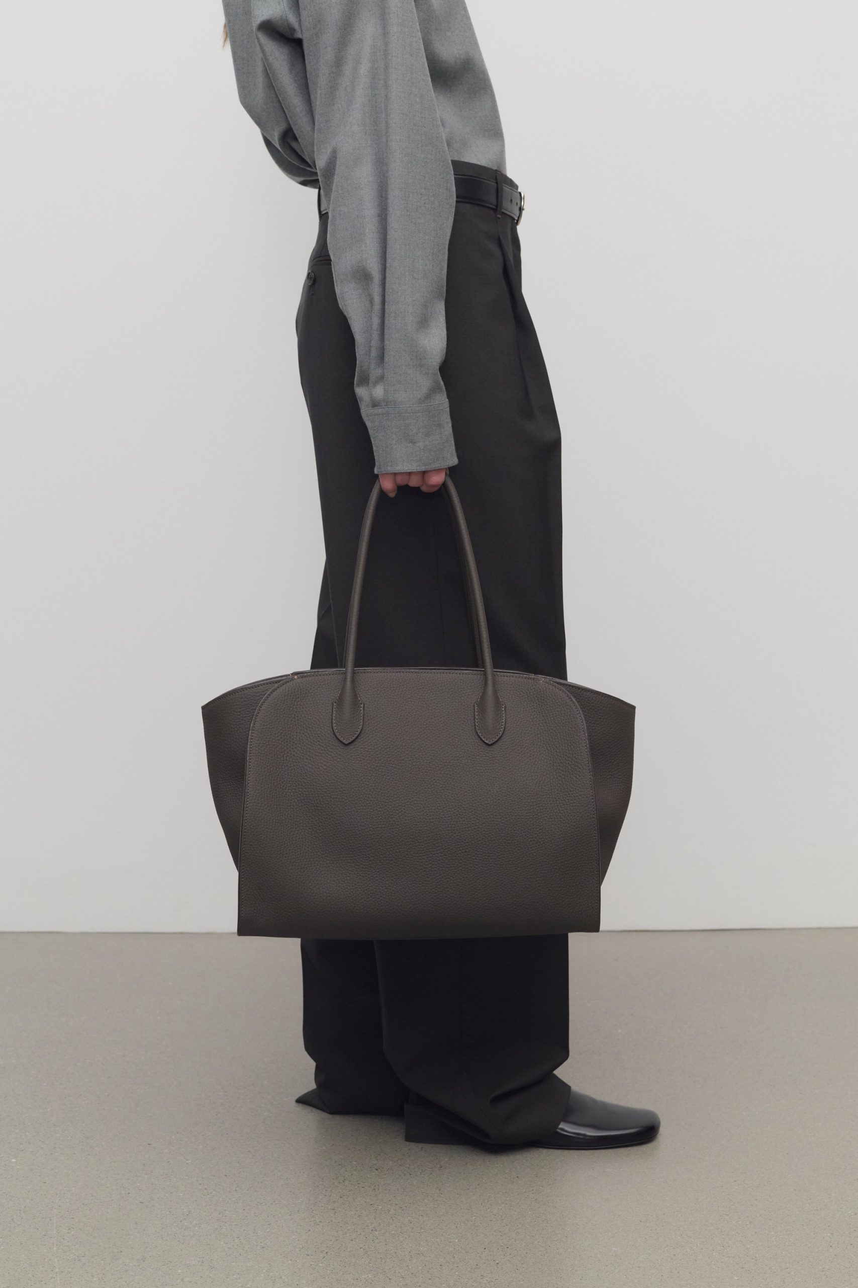 Softly structured tote bag in matte grained calfskin leather with tubular handles. gusseted side panels. and top zipper closure.