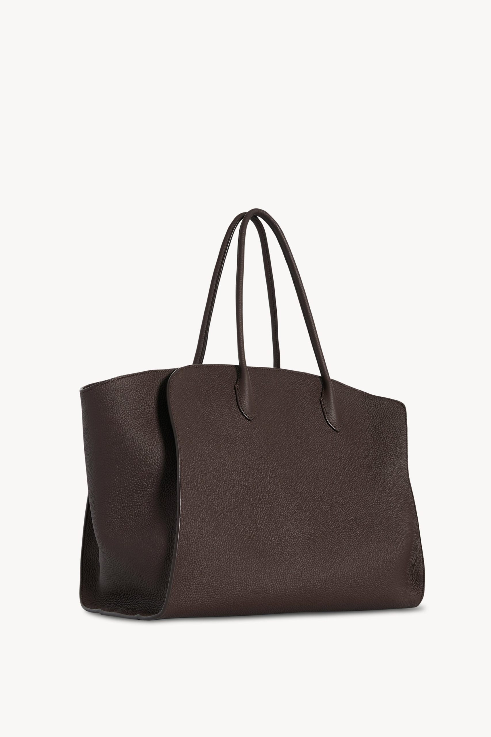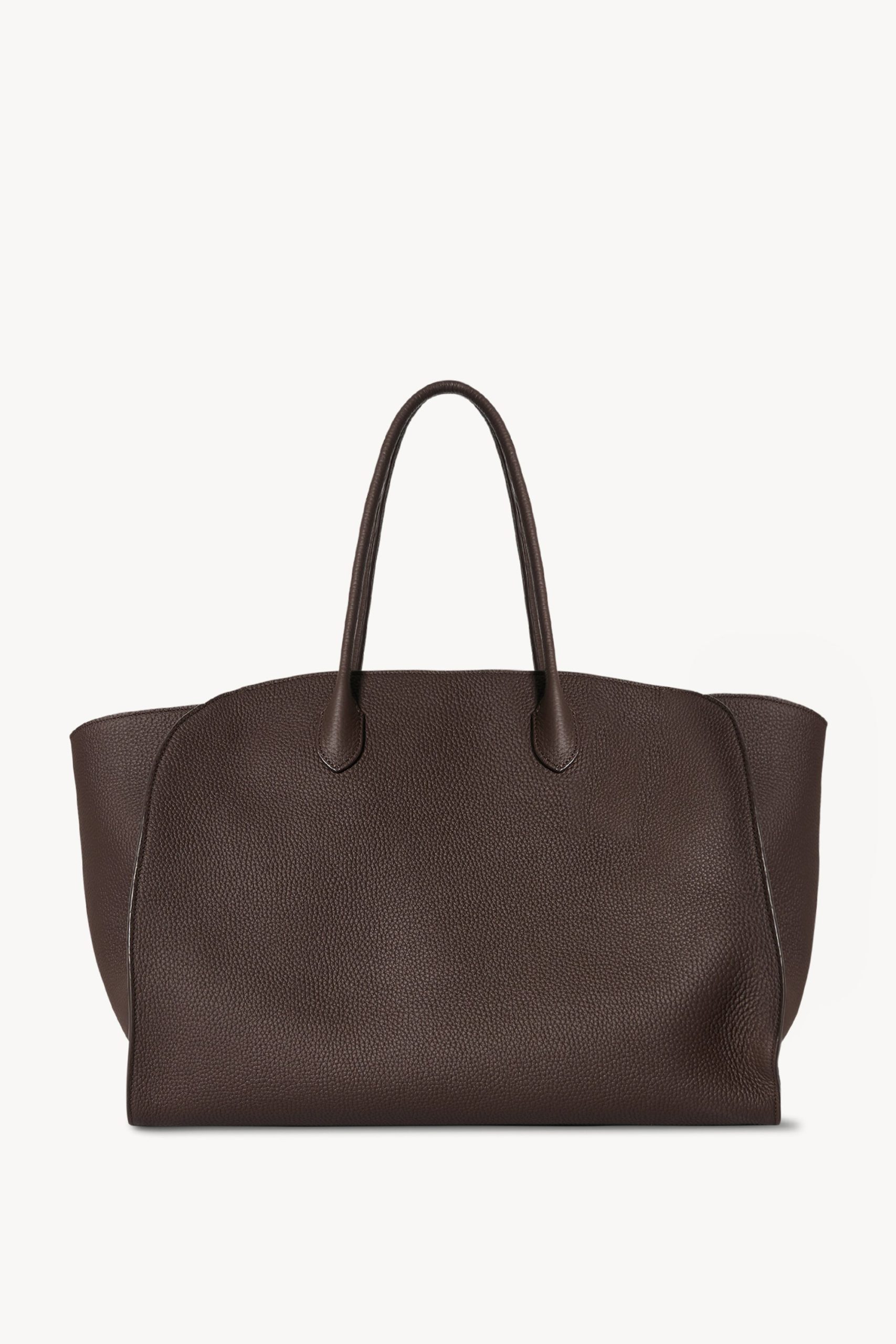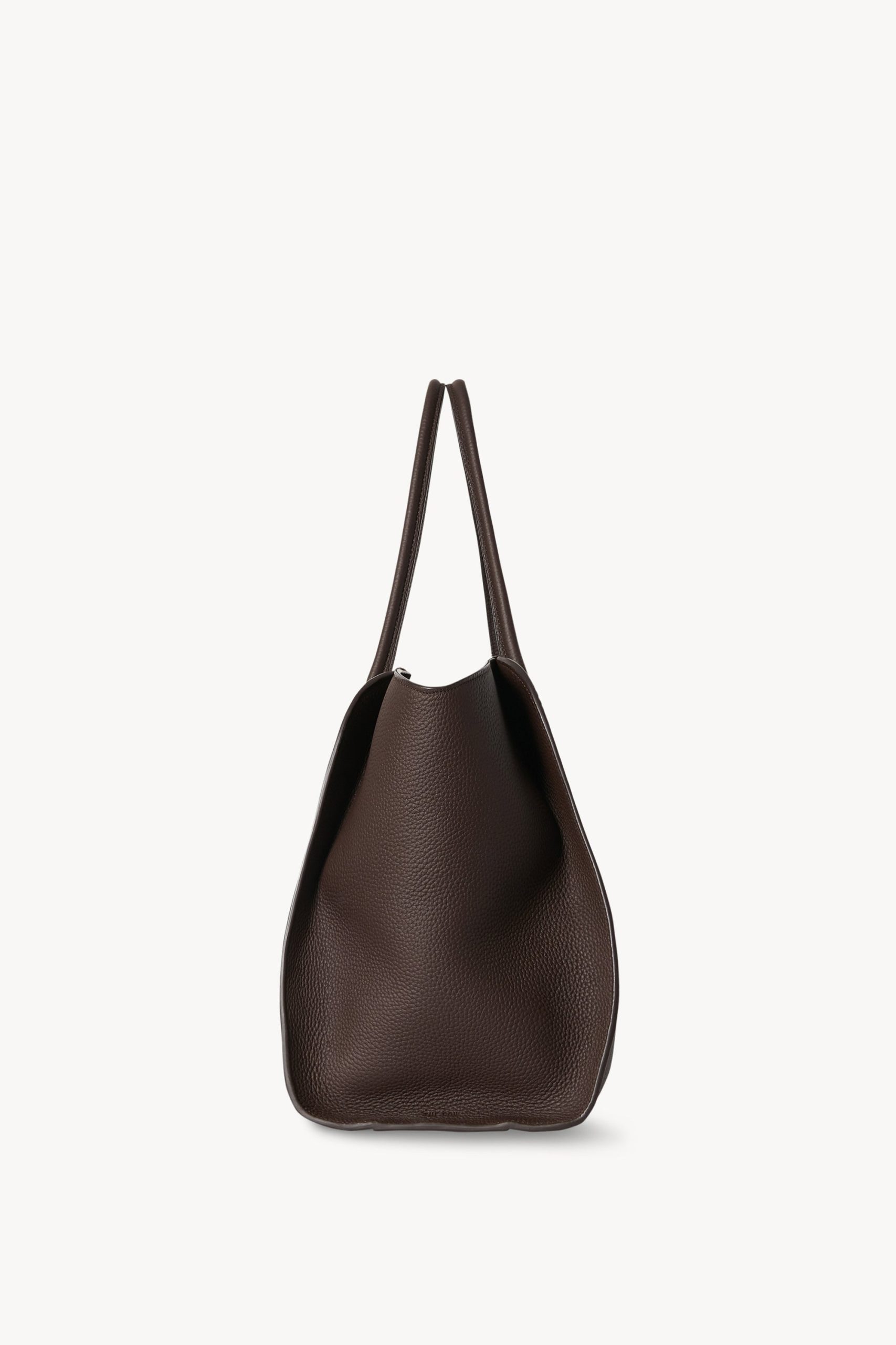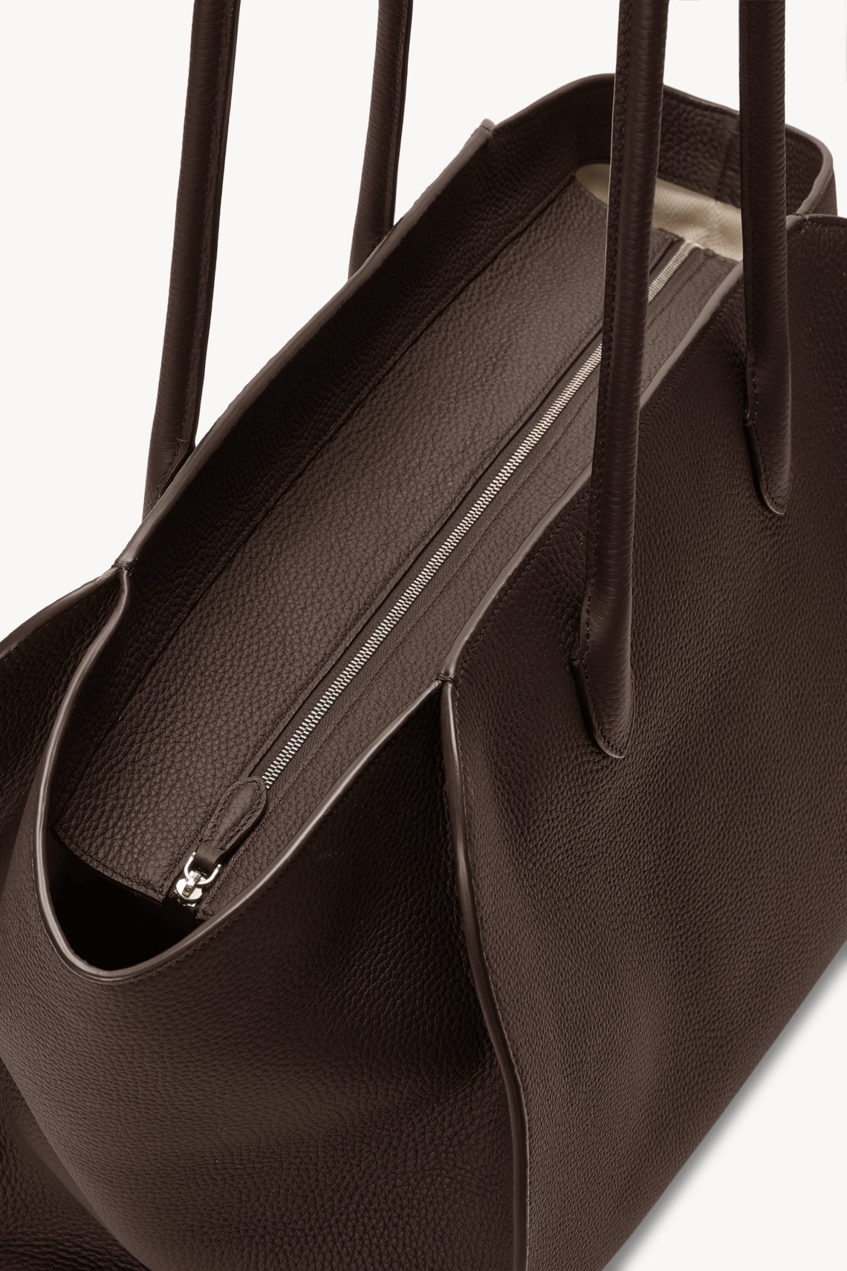 Softly structured tote bag in matte grained calfskin leather with tubular handles. gusseted side panels. and top zipper closure.