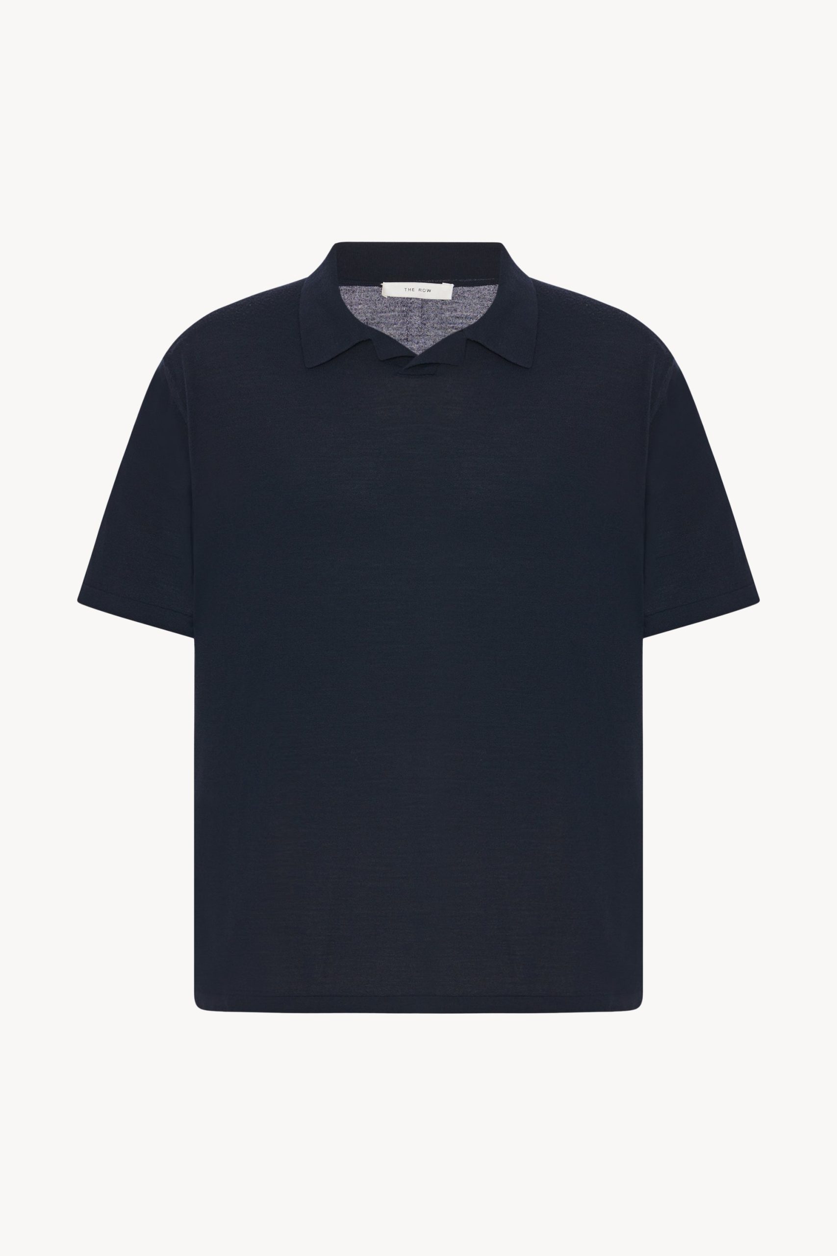 Short-sleeved polo top in ultrafine wool knit with slim fit. buttonless front tab. and signature center back detail.