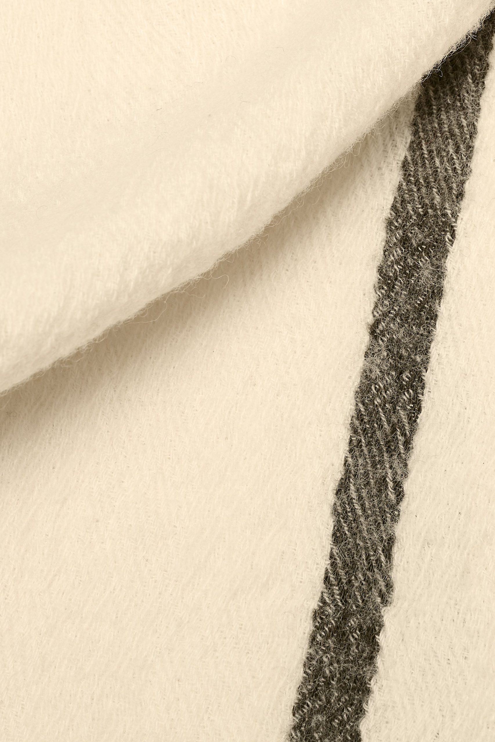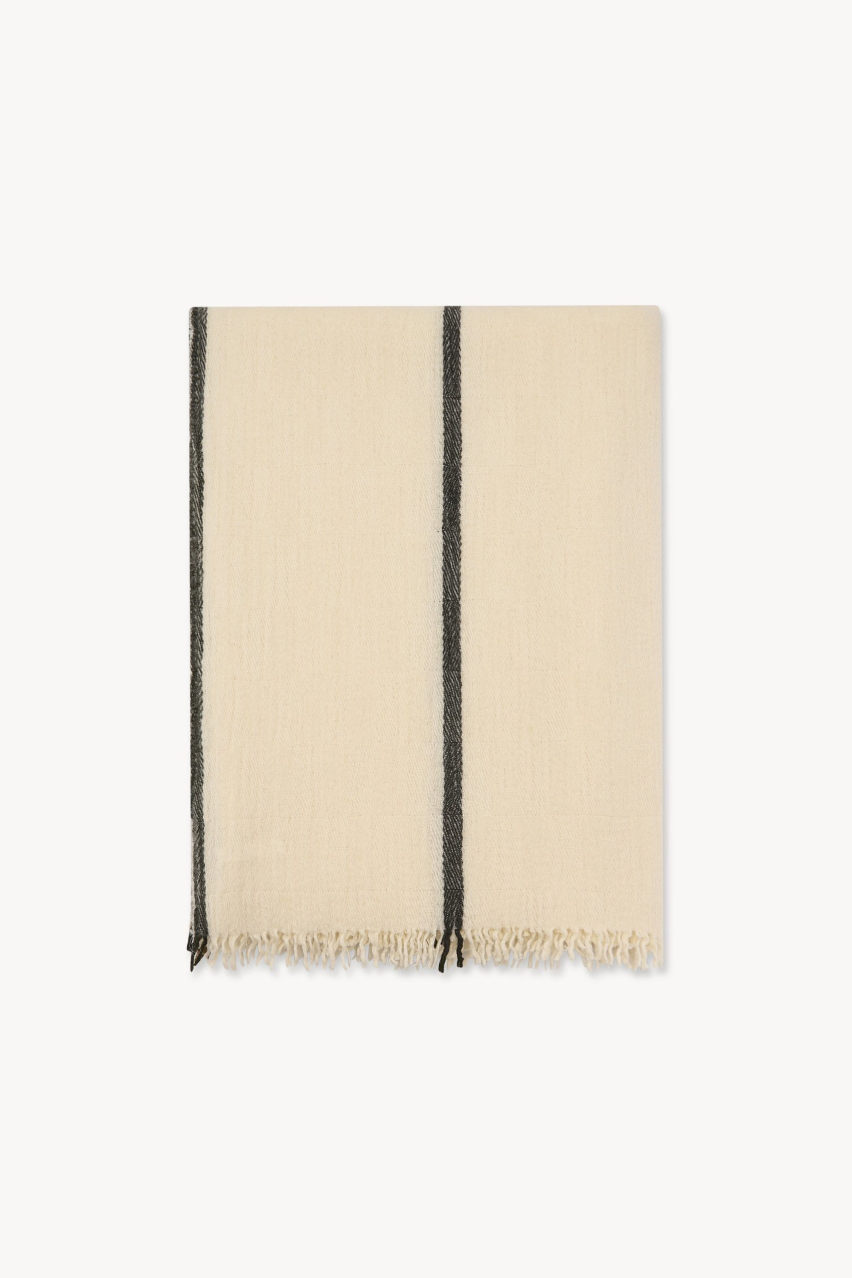 Wide lightweight scarf in boiled virgin wool with contrast stripe motif and fringed finish.