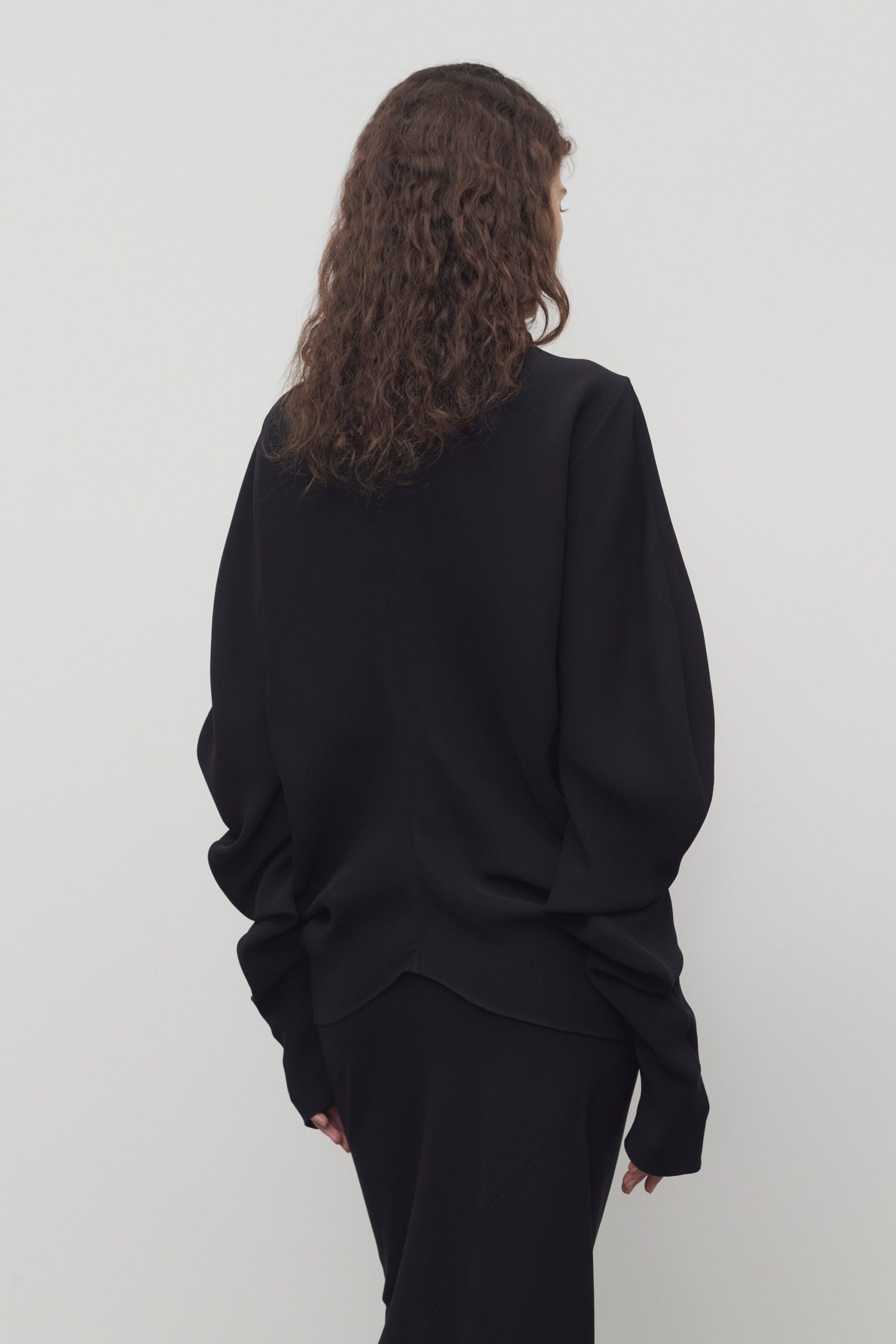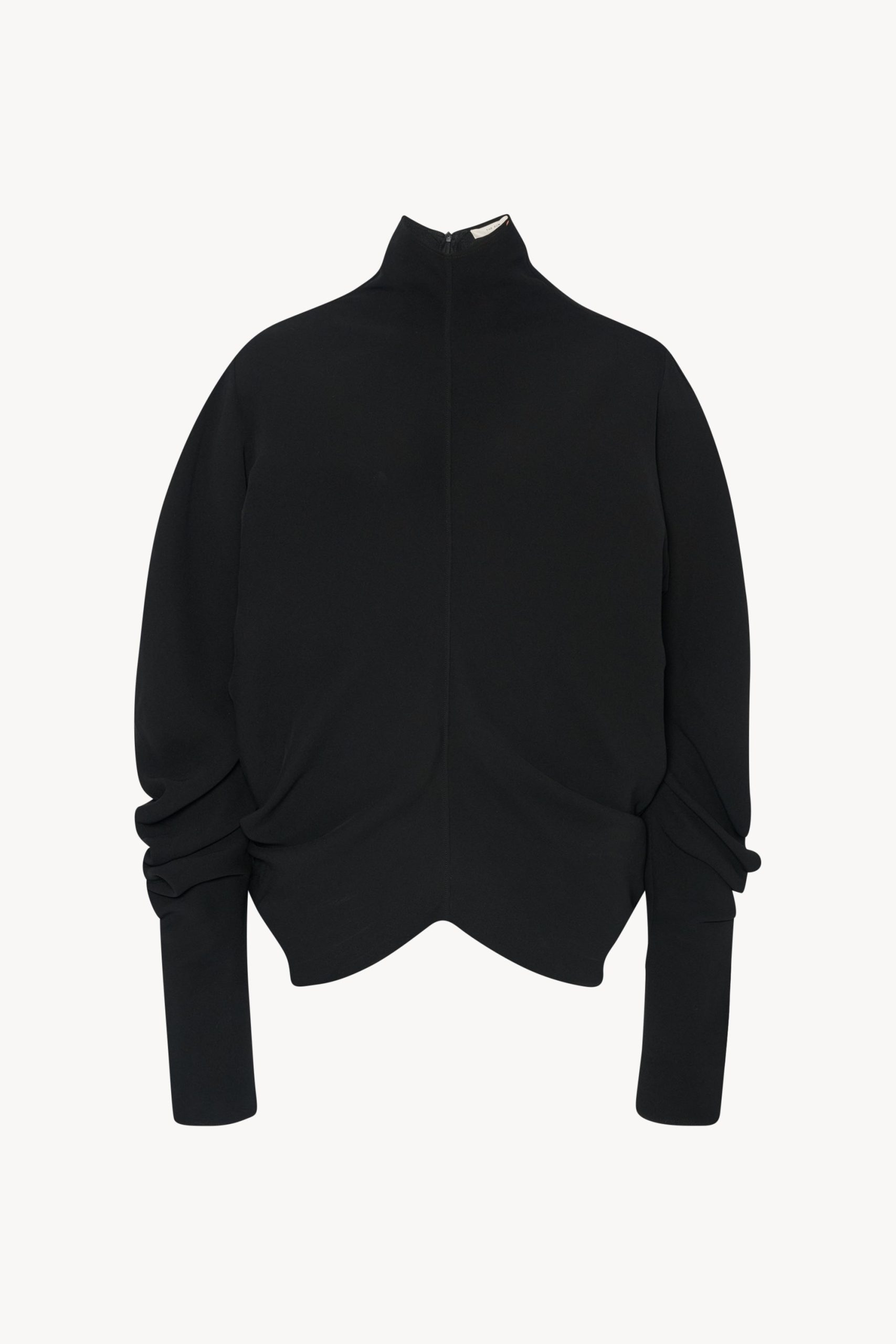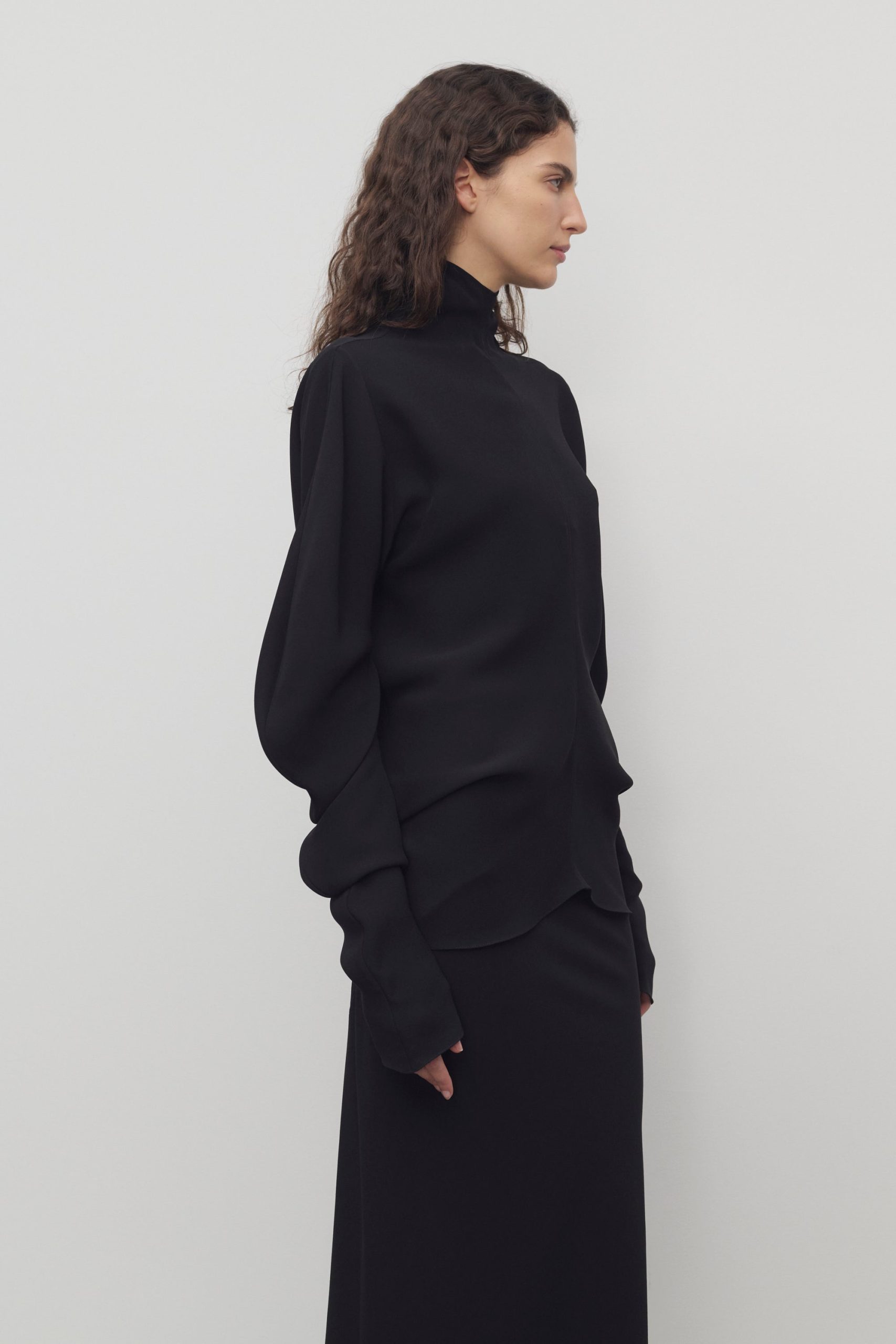 Sculptural long-sleeved top in crisp. lightweight silk with high neckline. gathered draping. and concealed back zipper closure.