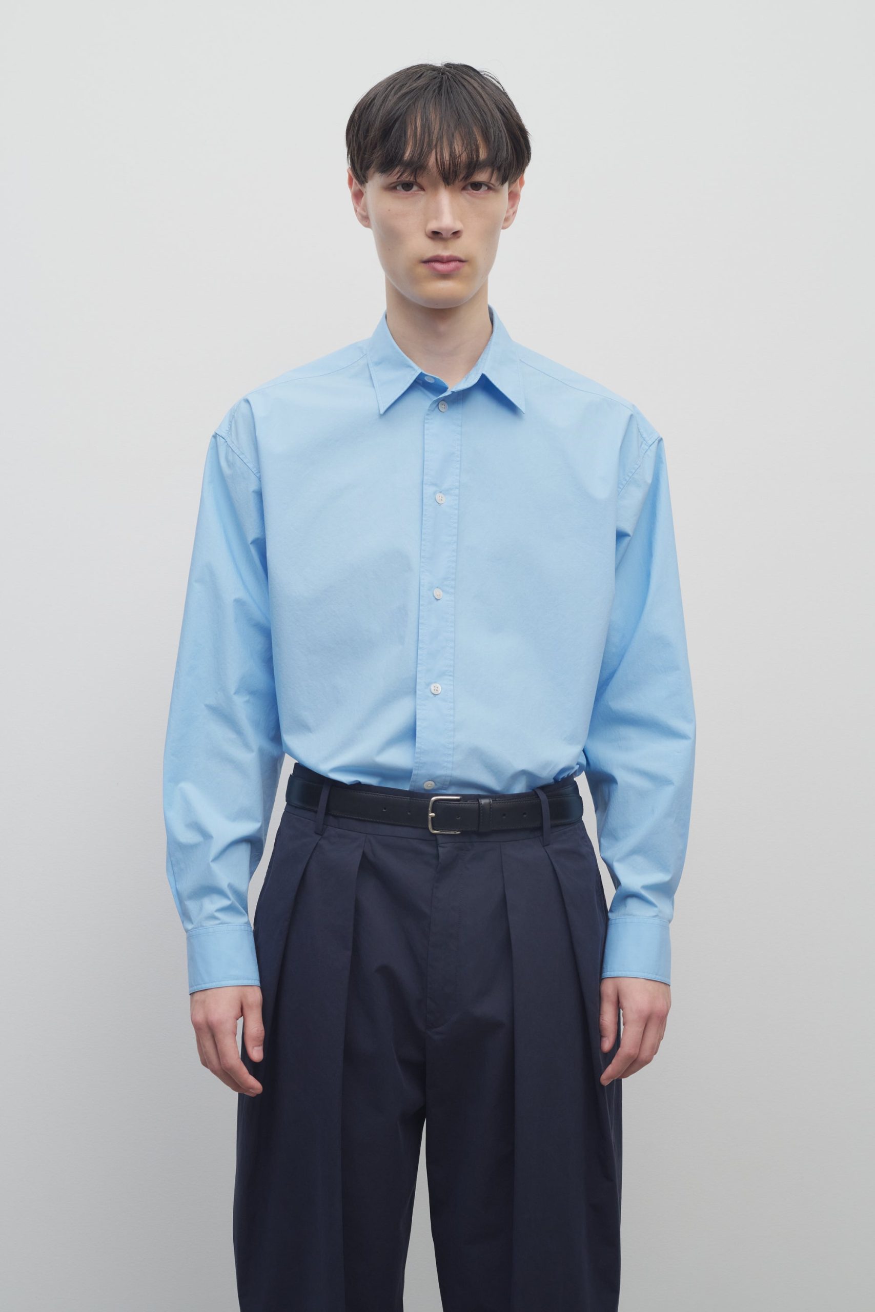 Classic button-up shirt in washed cotton poplin with slim back yoke. curved hem. and exposed front placket with mother-of-pearl buttons.