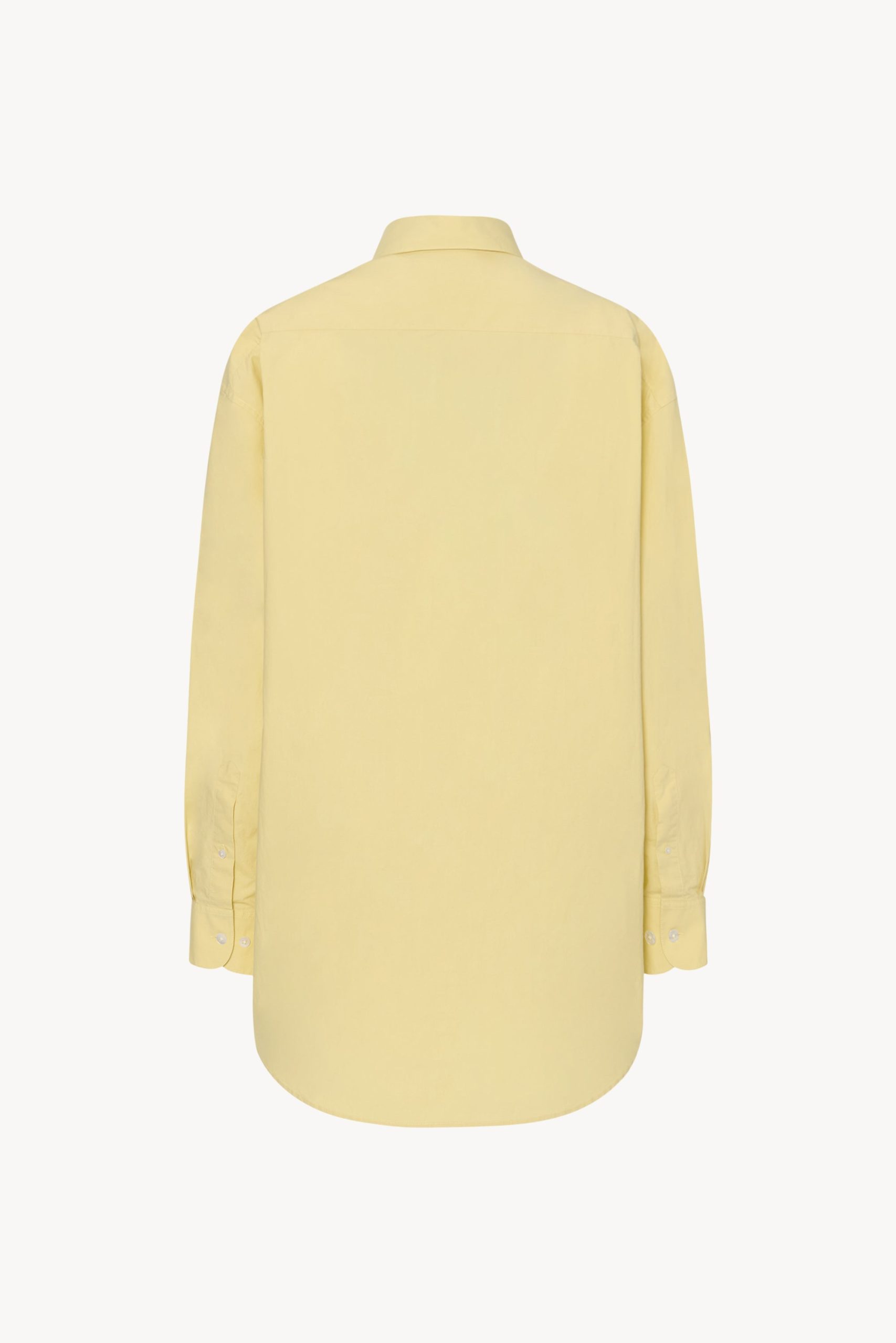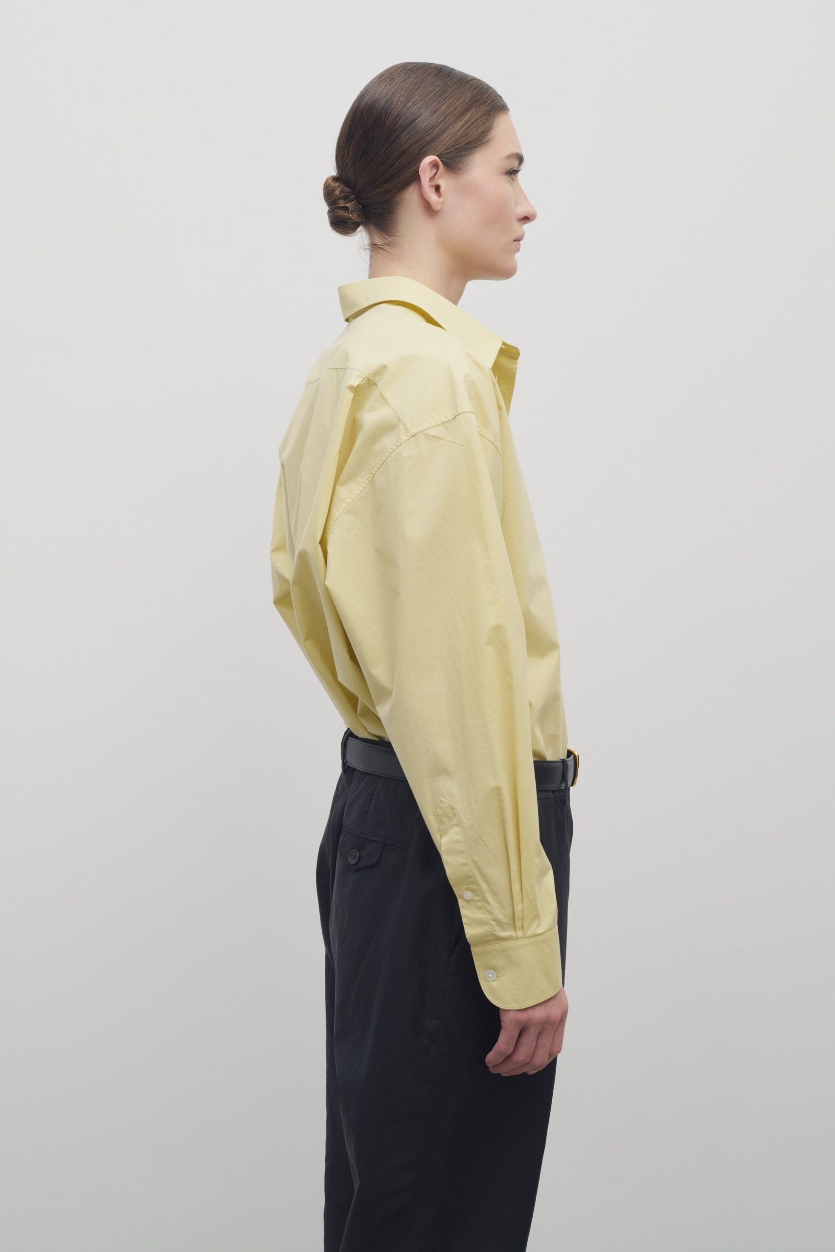 Classic button-up shirt in washed cotton poplin with curved hem. slim back yoke. and exposed front button placket.