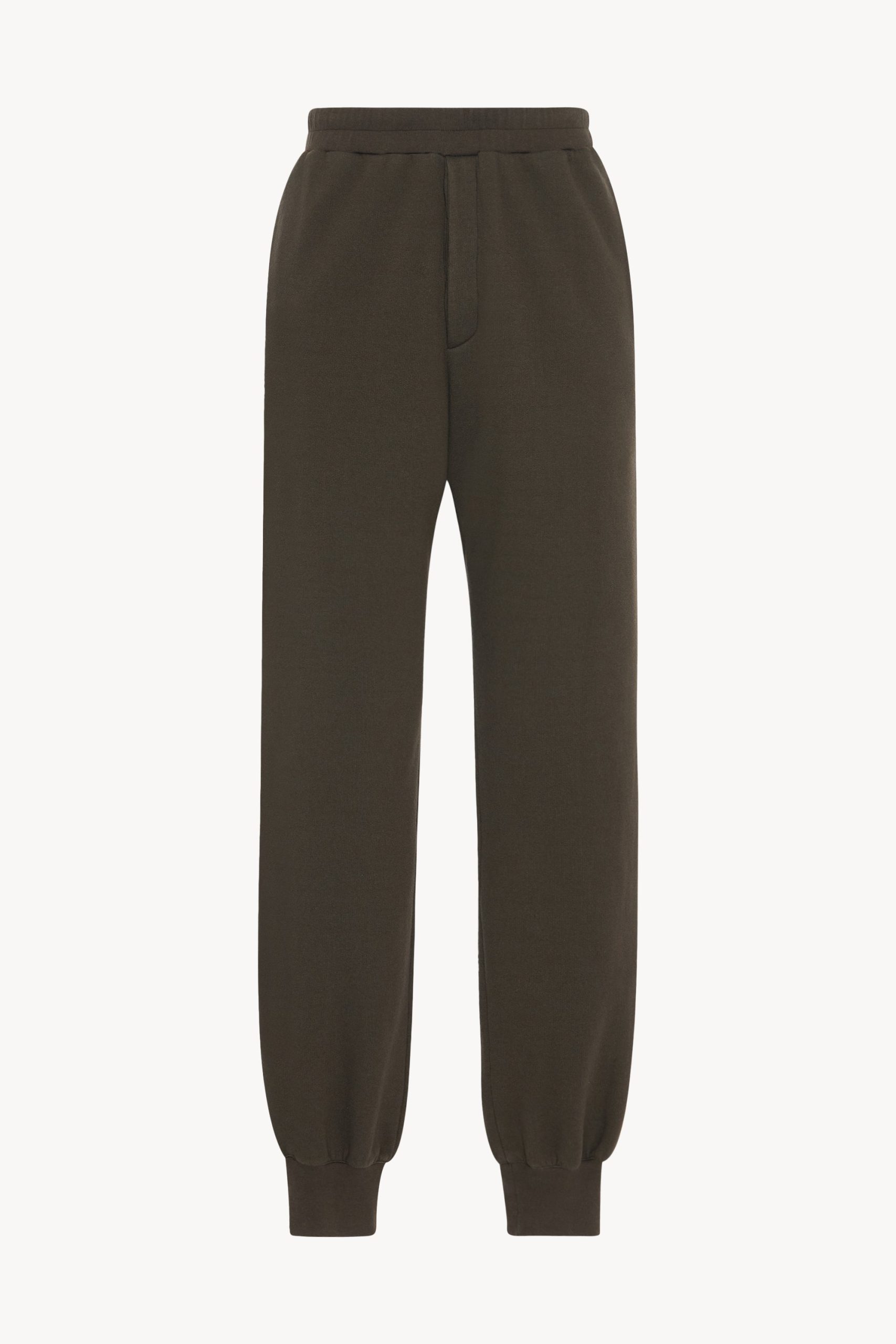Mid-rise jogger pant in cotton and cashmere French terry with straight leg. side seam pockets. and gathered elastic cuffs and waistband.