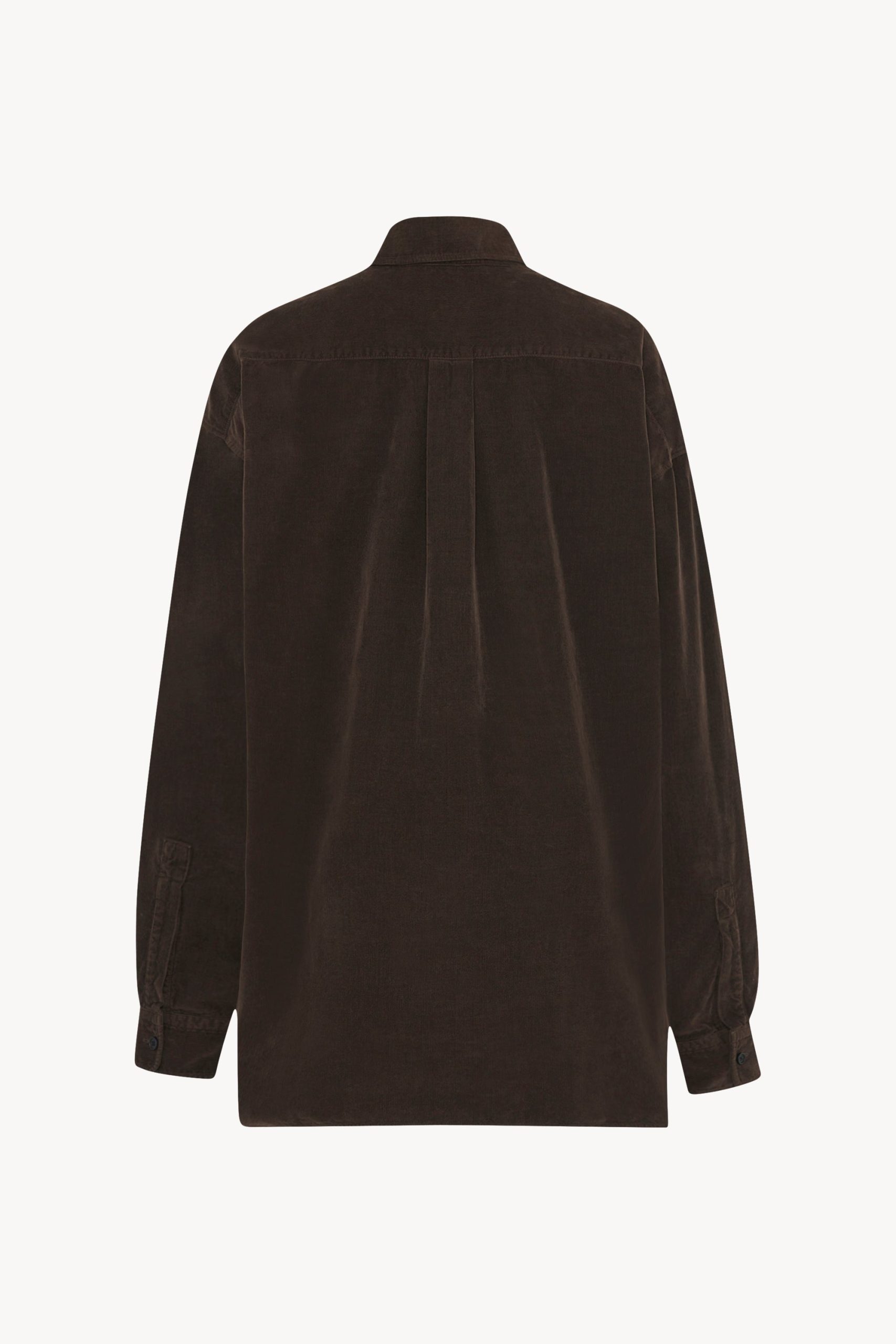 Relaxed button-up shirt in Japanese pinwale corduroy with front patch pocket. slim back yoke with side pleats. and exposed front placket with mother-of-pearl buttons.