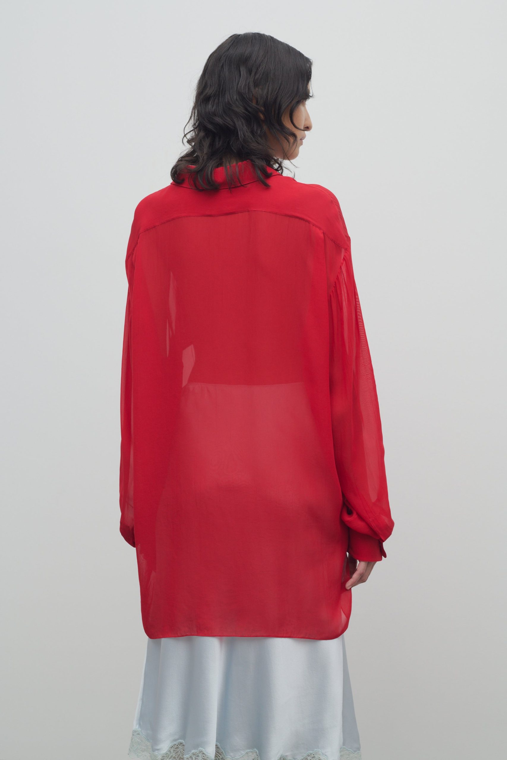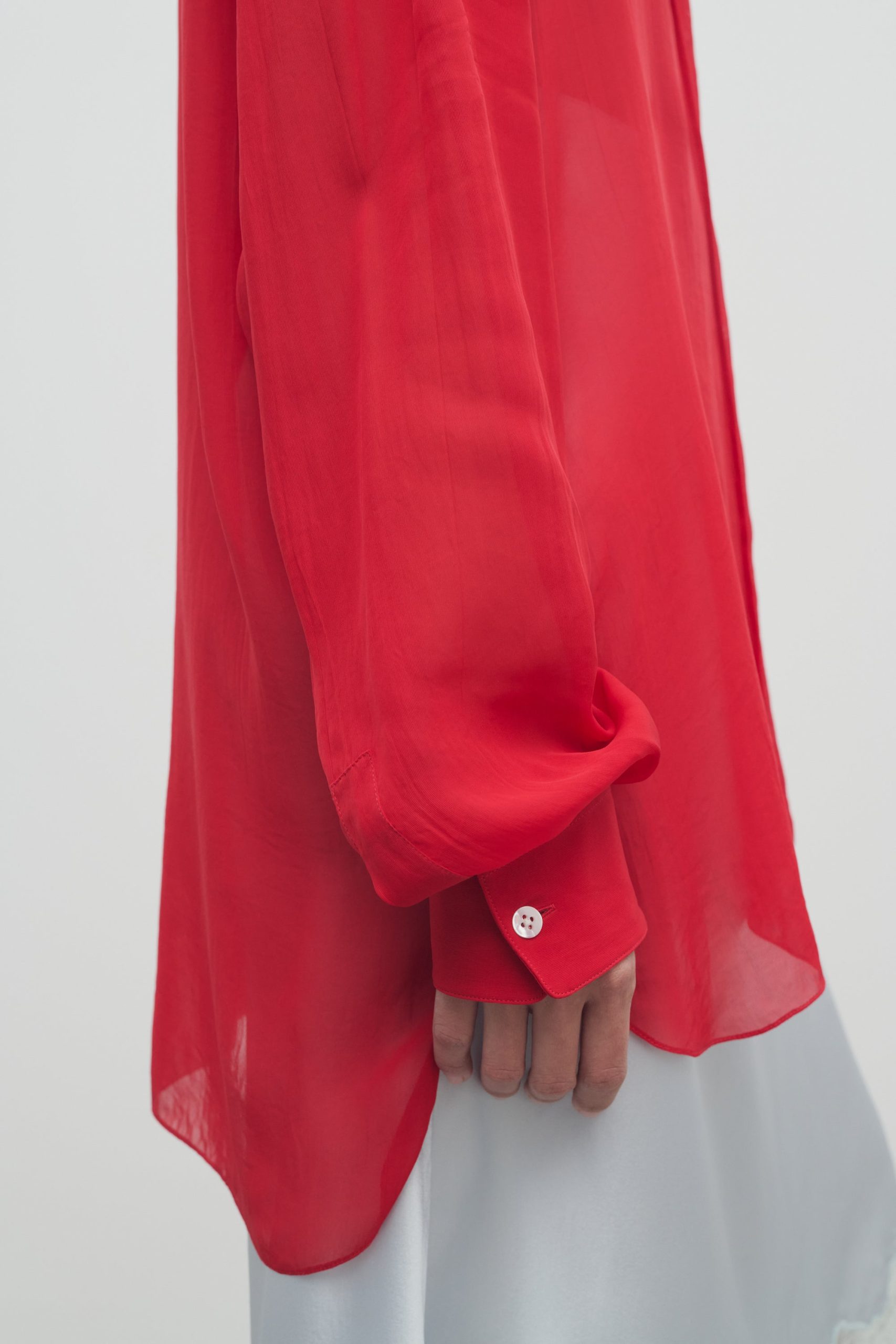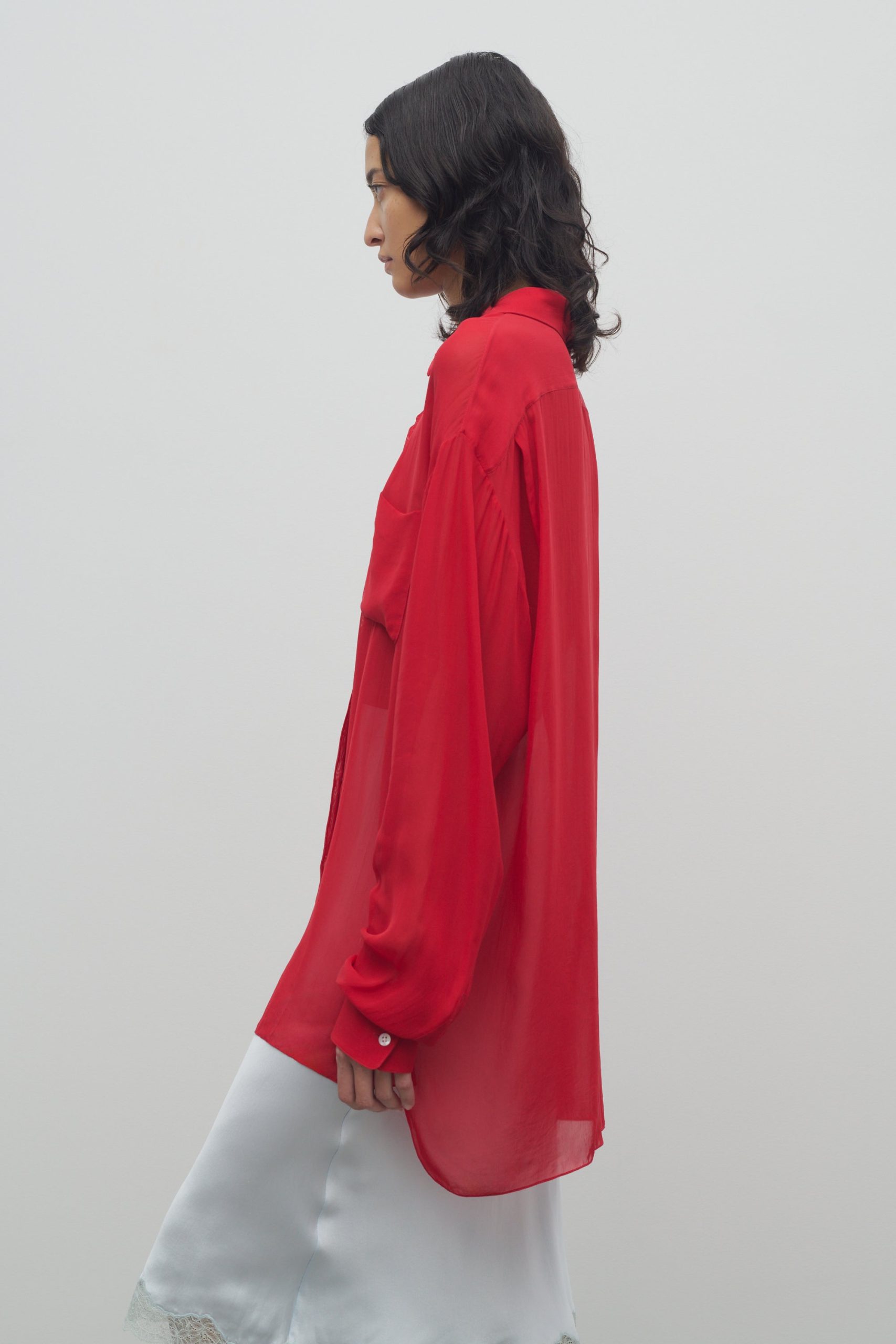 Relaxed button-up shirt in featherlight cupro with front patch pocket. slim back yoke with side pleats. and exposed front placket with mother-of-pearl buttons.