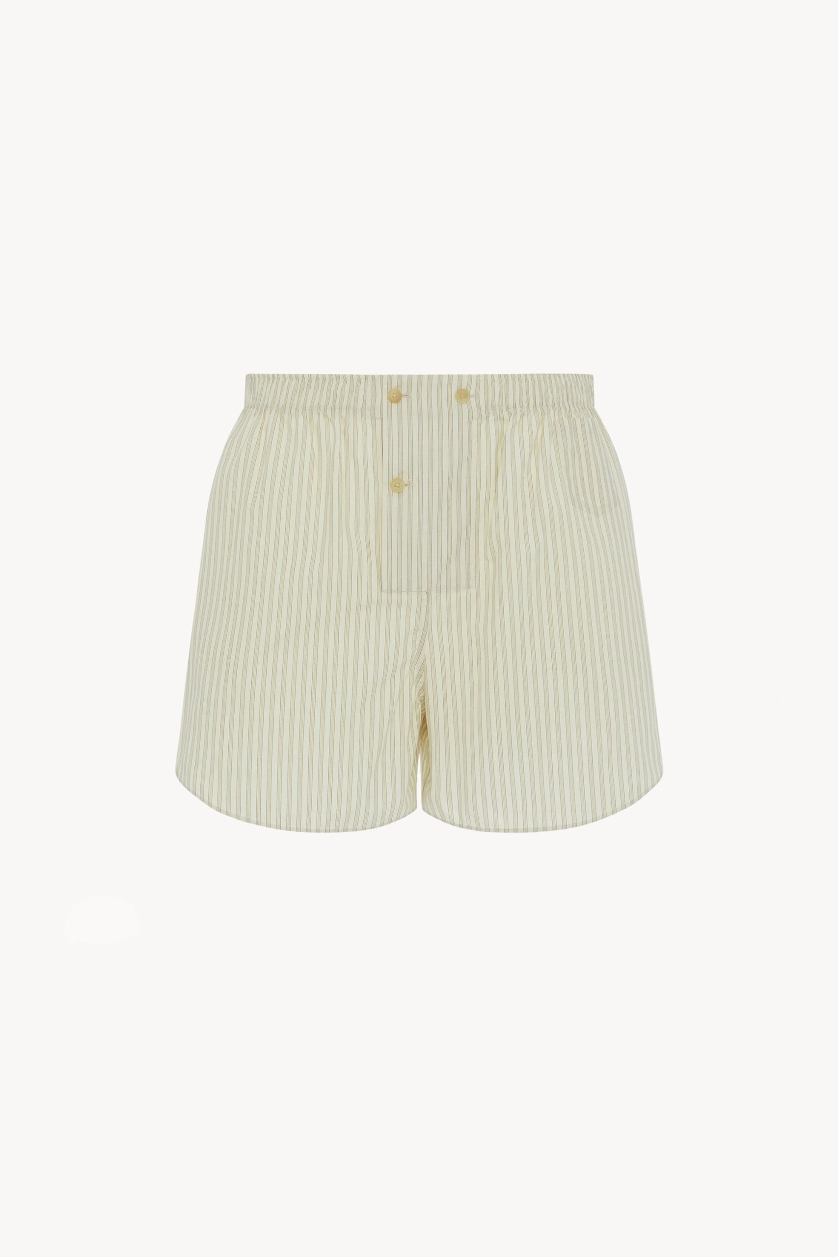 Mid-rise boxer short in washed organic cotton poplin with single back patch pocket. elasticated waistband. and front horn button closure.