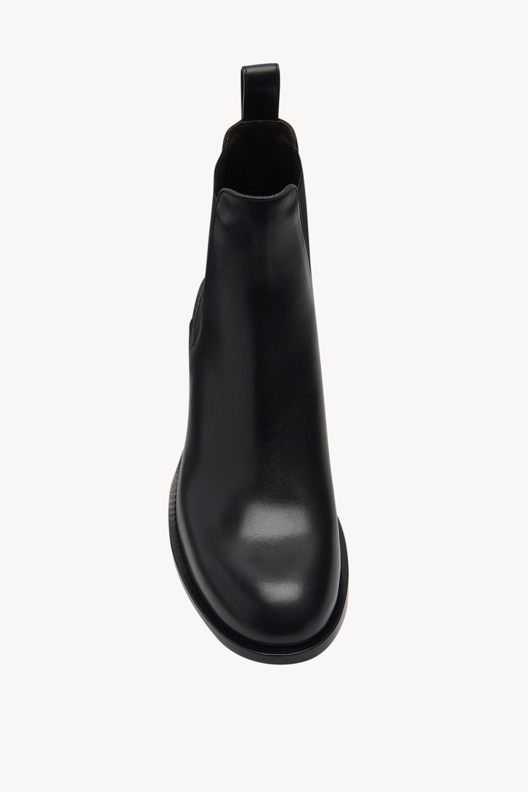 Heeled Chelsea boot in polished calfskin leather with round toe. elasticated side panels. and stacked leather heel.