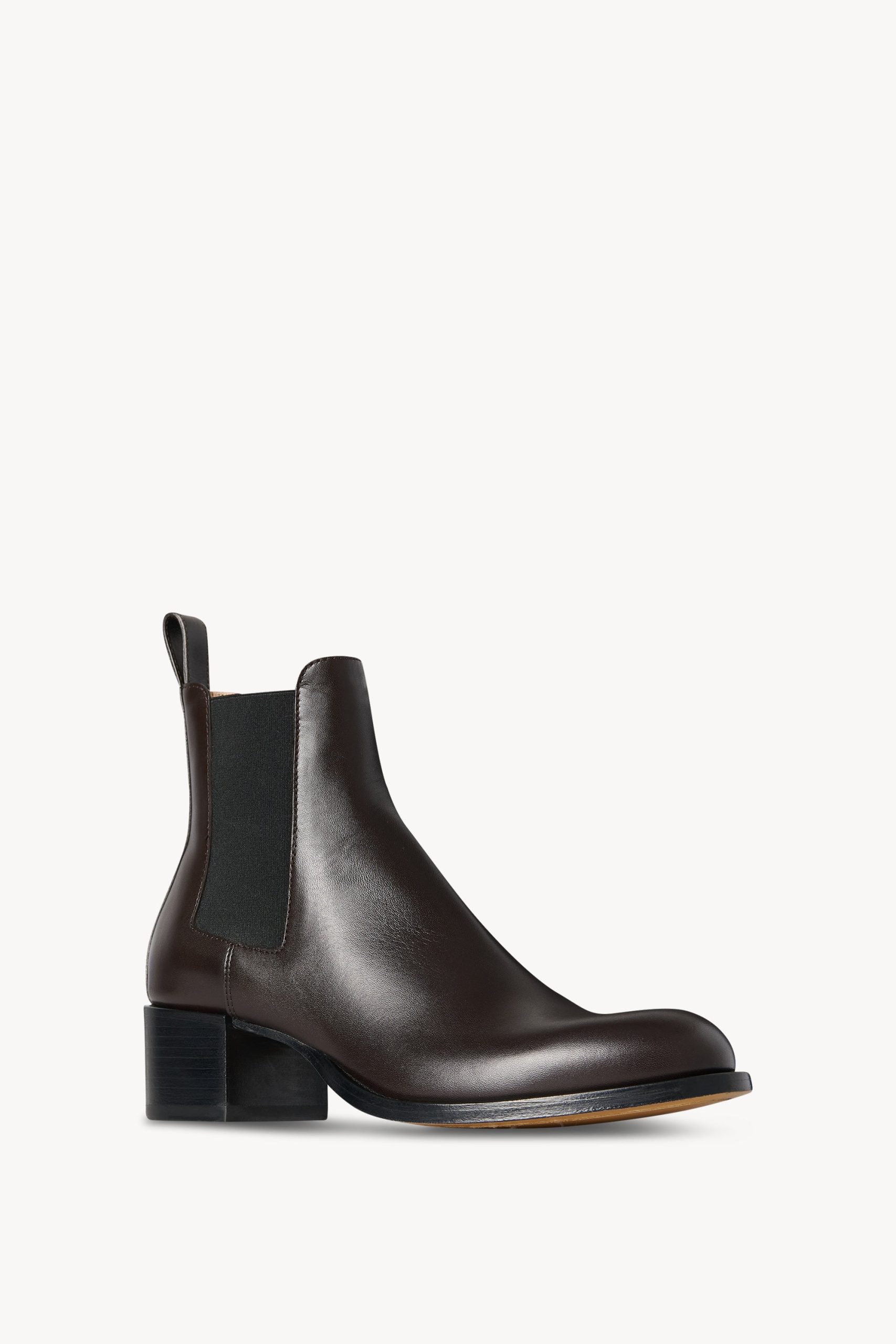 Heeled Chelsea boot in polished calfskin leather with round toe. elasticated side panels. and stacked leather heel.
