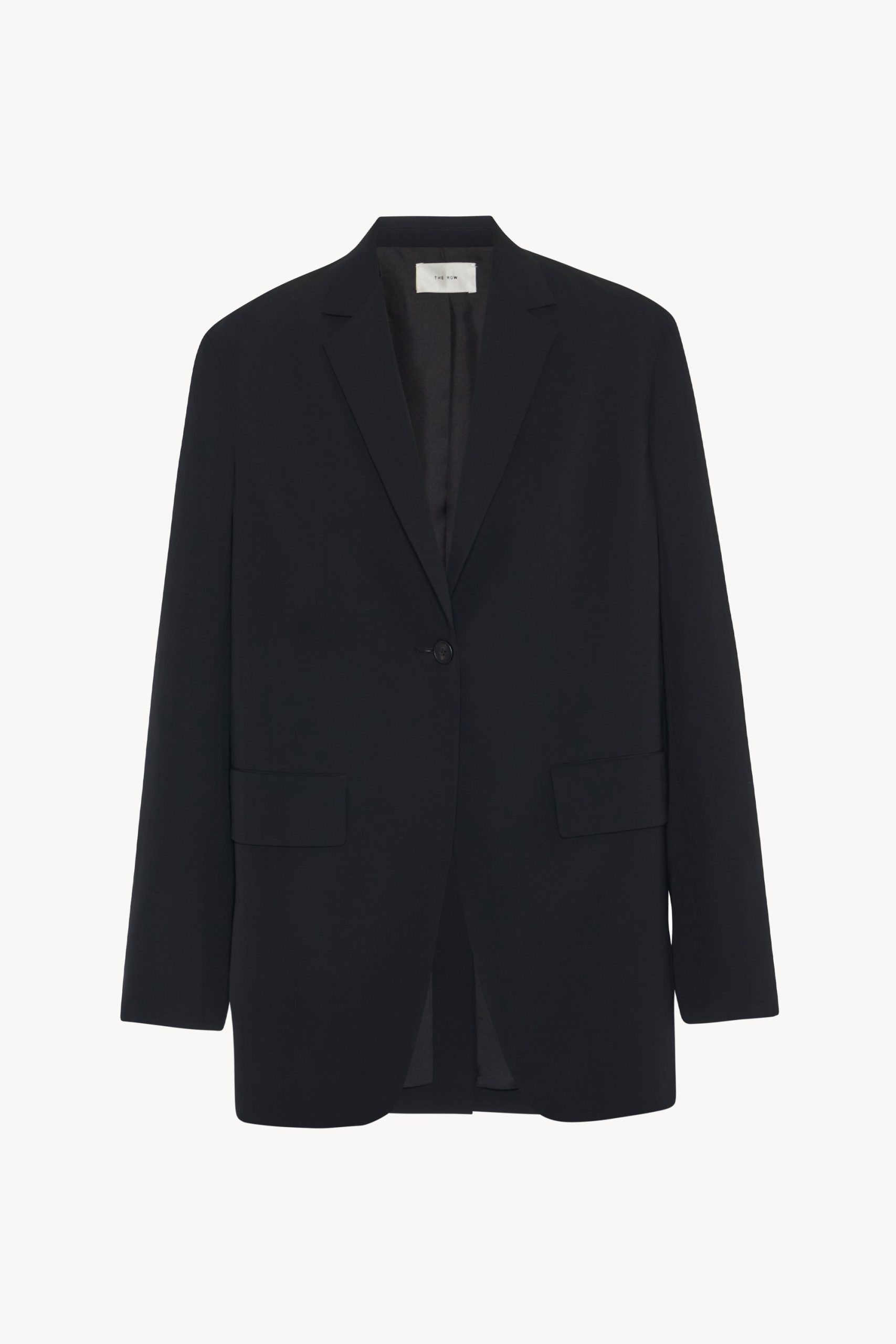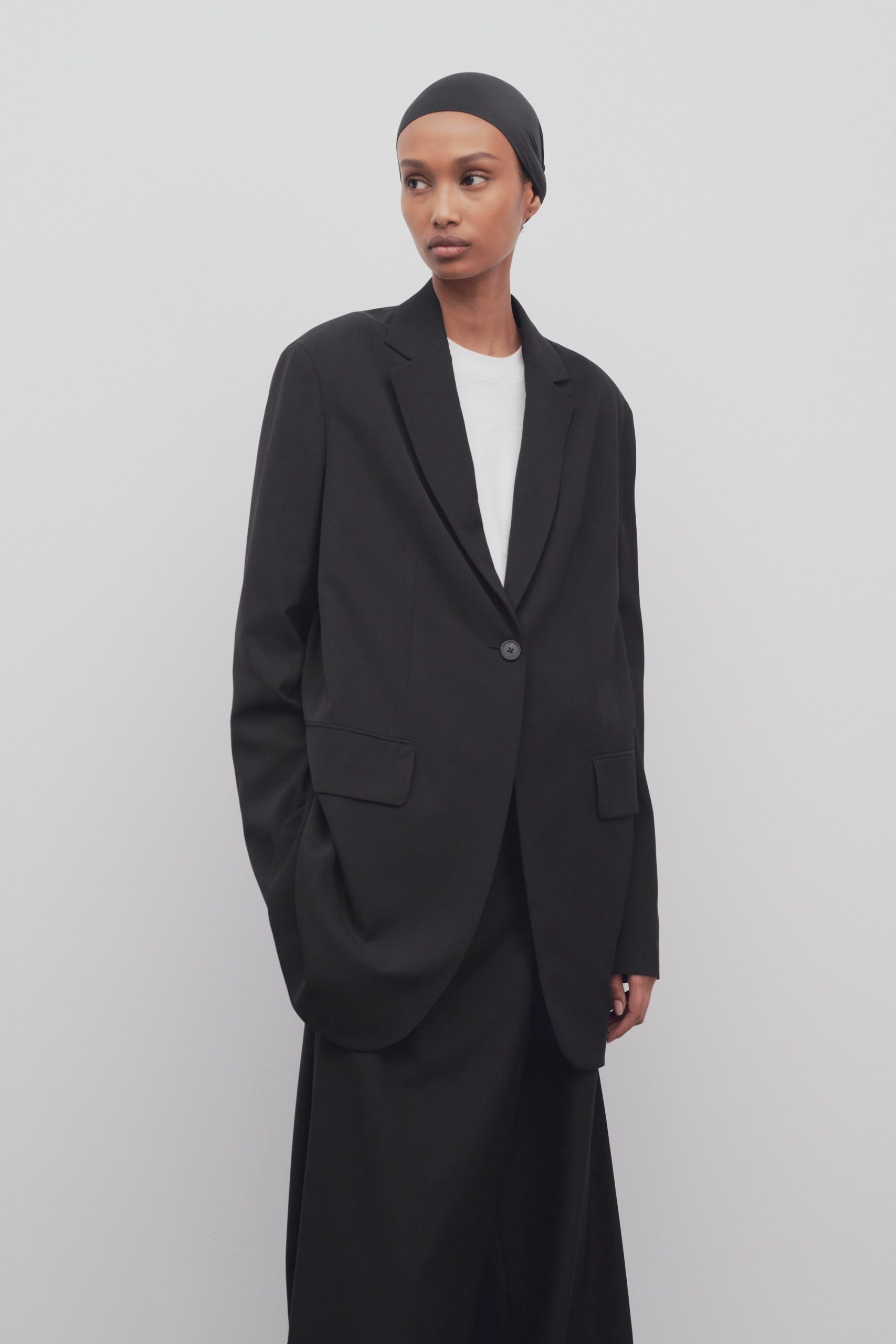 Oversized single-breasted tailored jacket in lightweight viscose and virgin wool with hand-pick stitched notch lapel. front flap pockets and back vent.