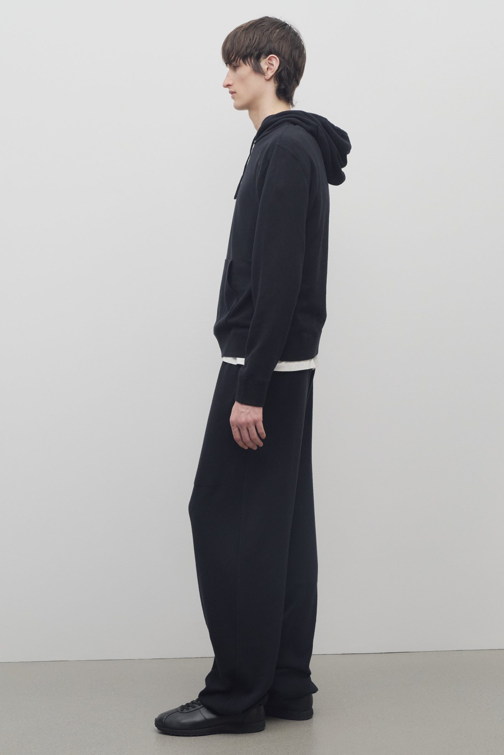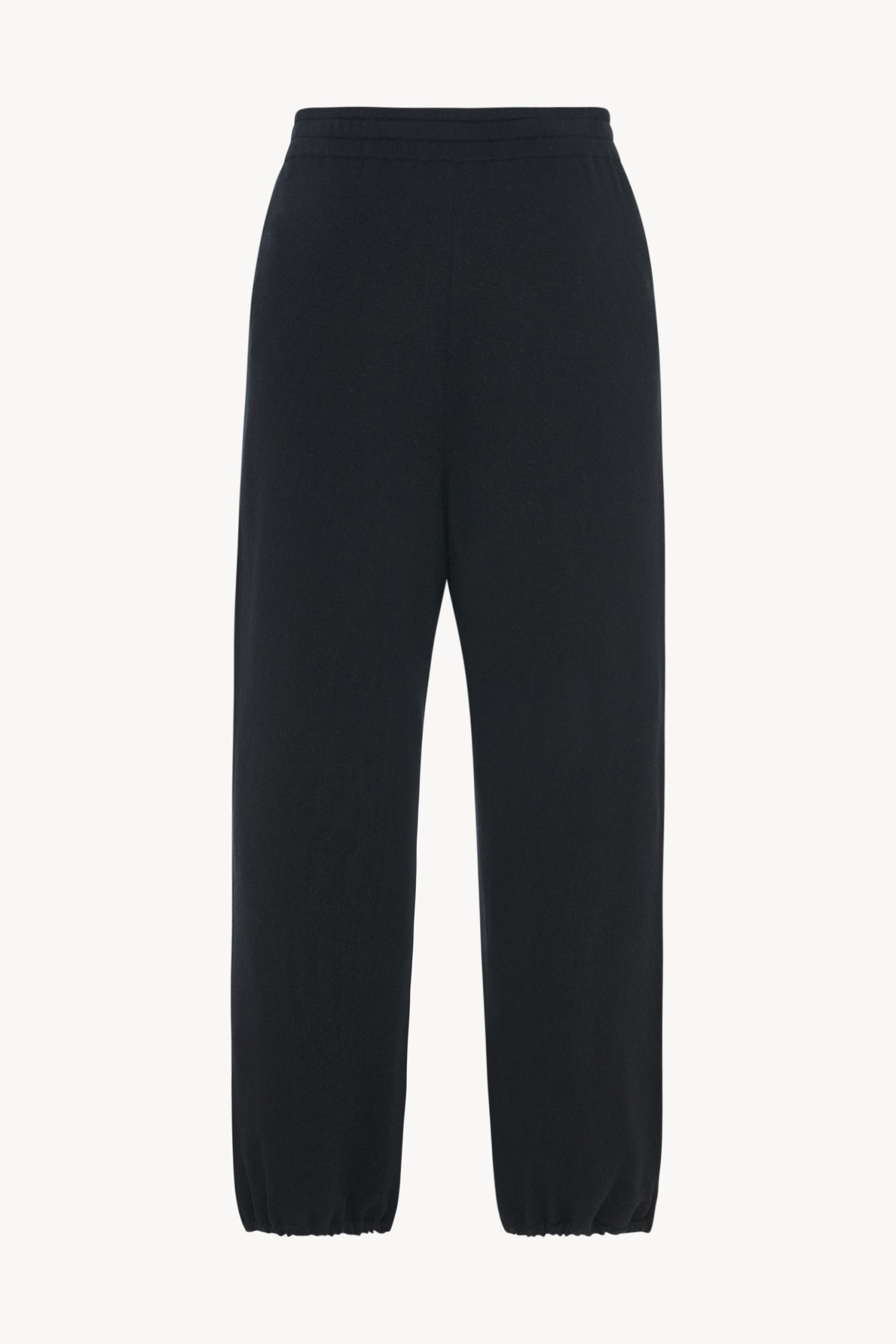 Mid-rise jogger pant in stonewashed silk jersey with straight leg. side seam pockets. and gathered elastic cuffs and waistband.