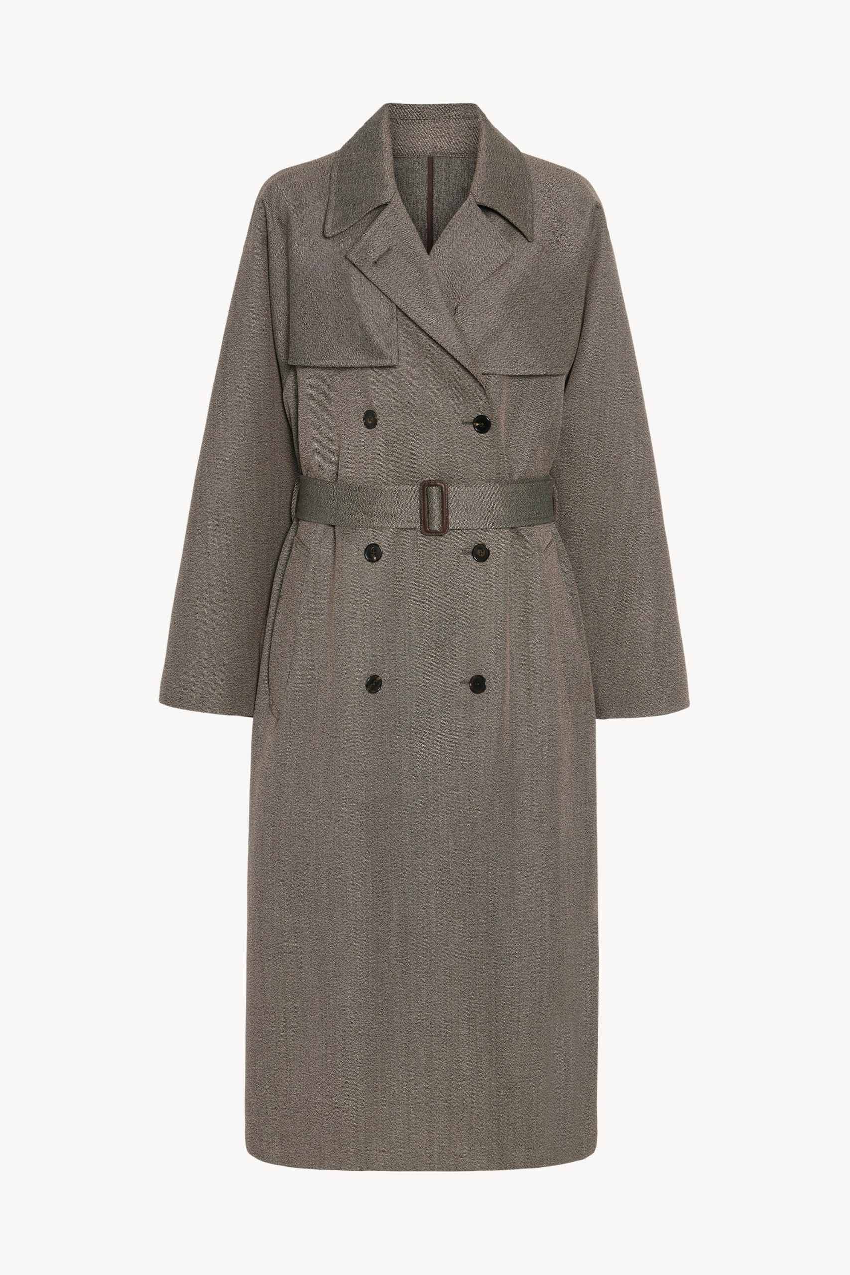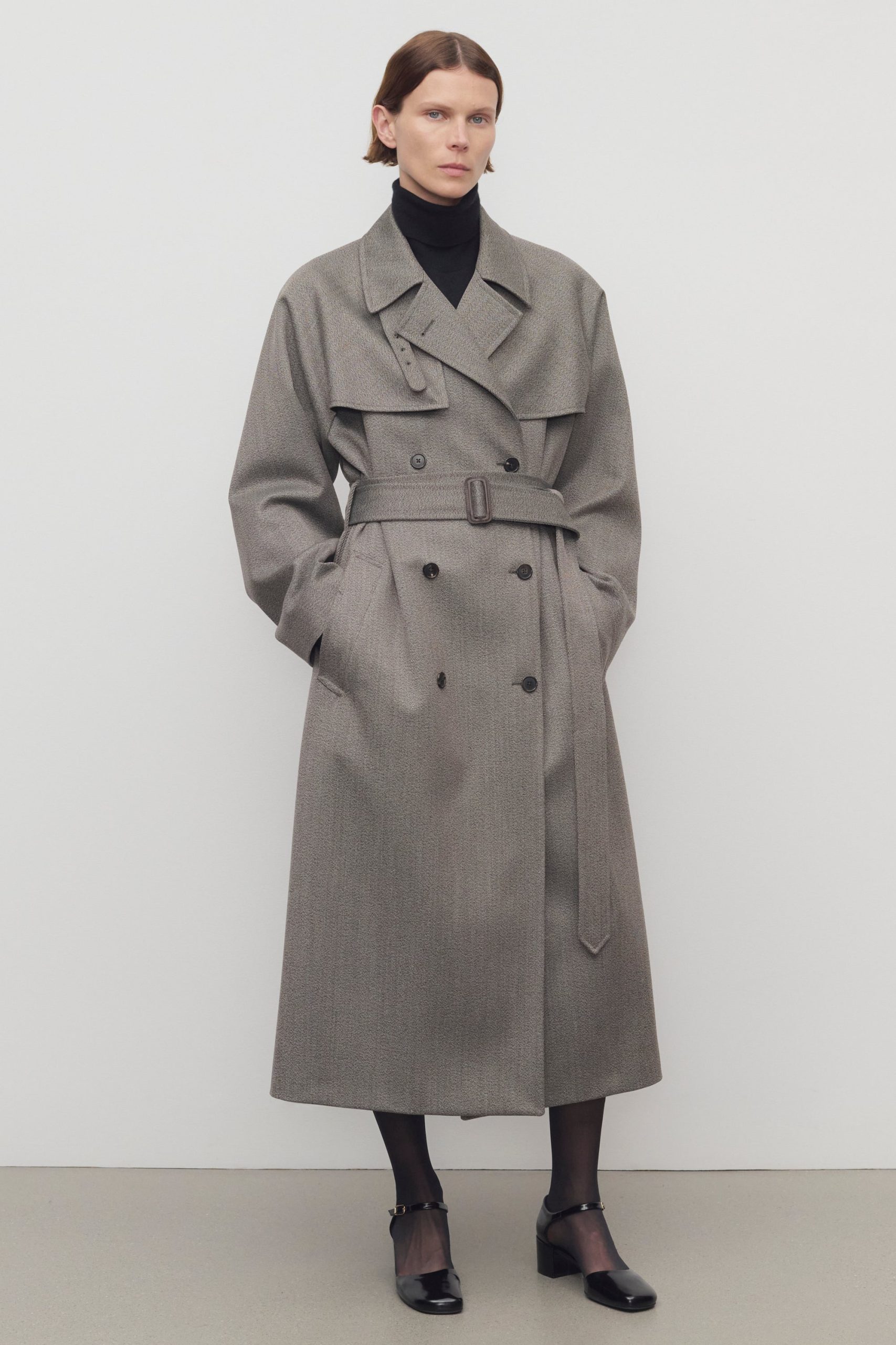 Oversized double-breasted trench coat in sleek virgin wool gabardine with slant welt pockets. horn button closure. and removable belt with buckle.
