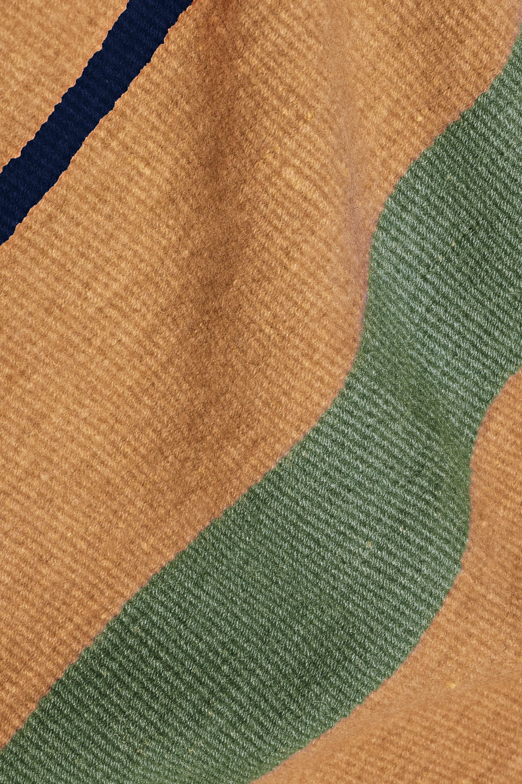 Wide woven scarf in textured silk and cashmere with contrast stripe motif and fringed finish.