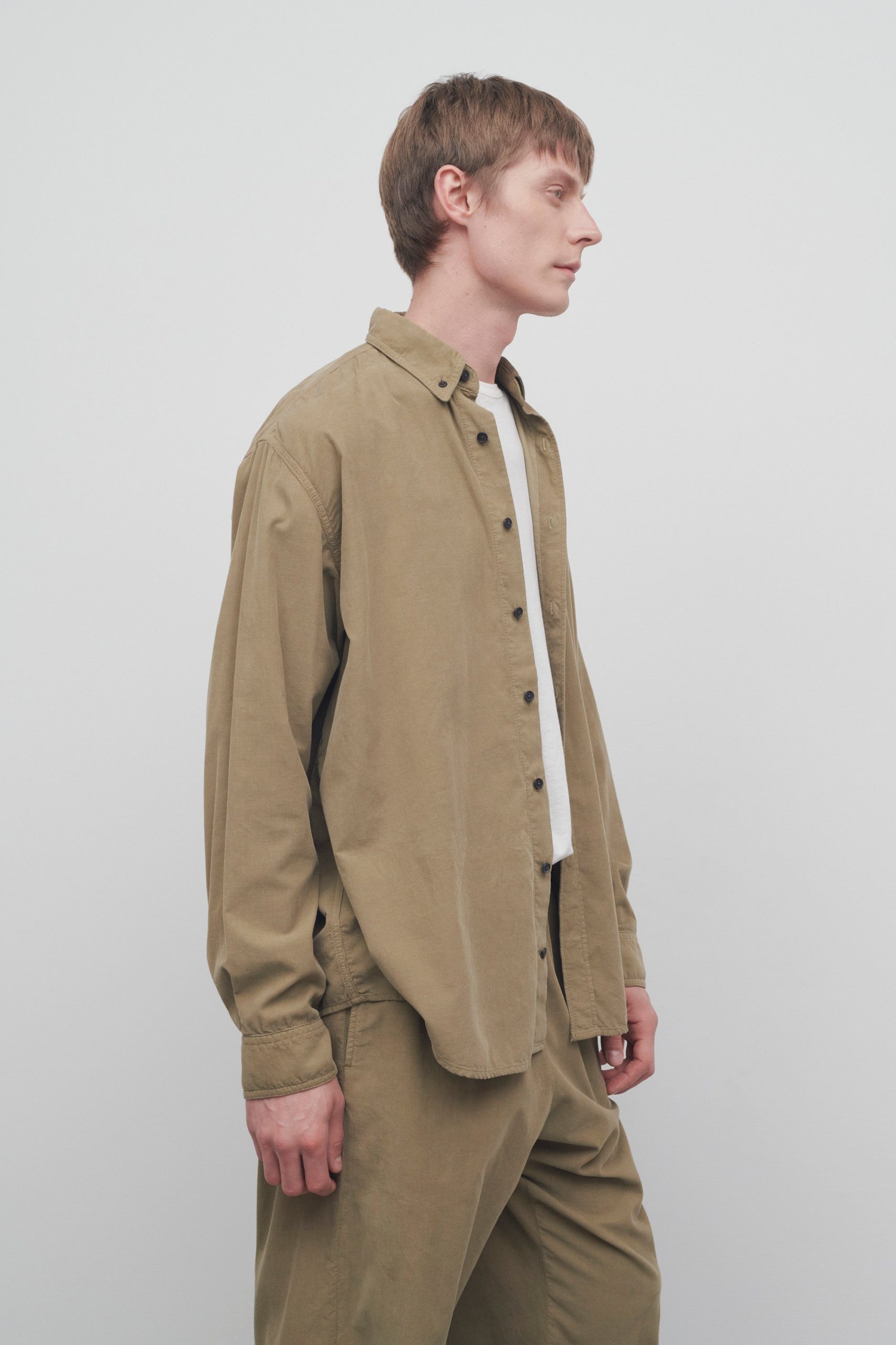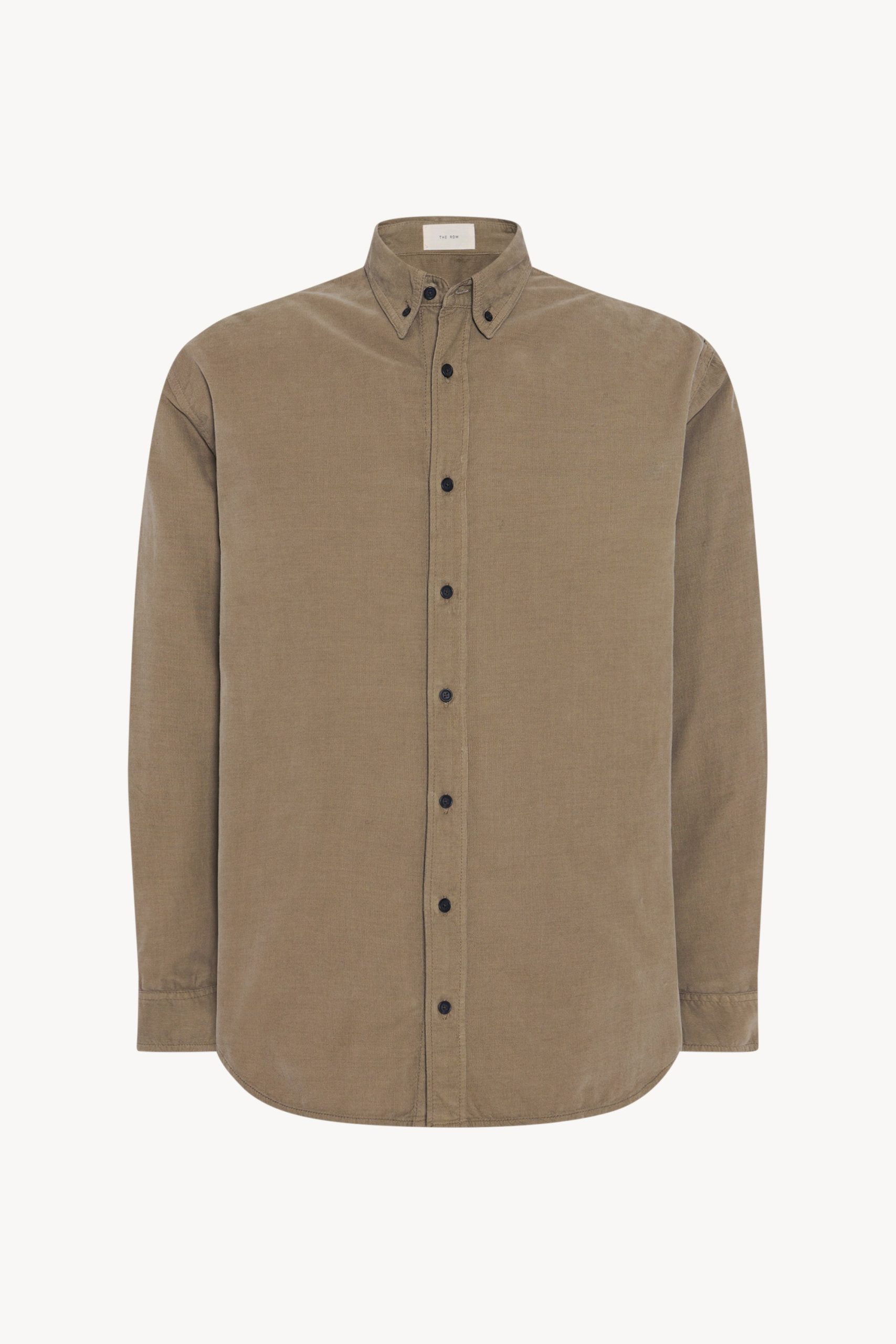 Tailored button-down shirt in light cotton corduroy with exposed placket. horn button closure. and curved hem.