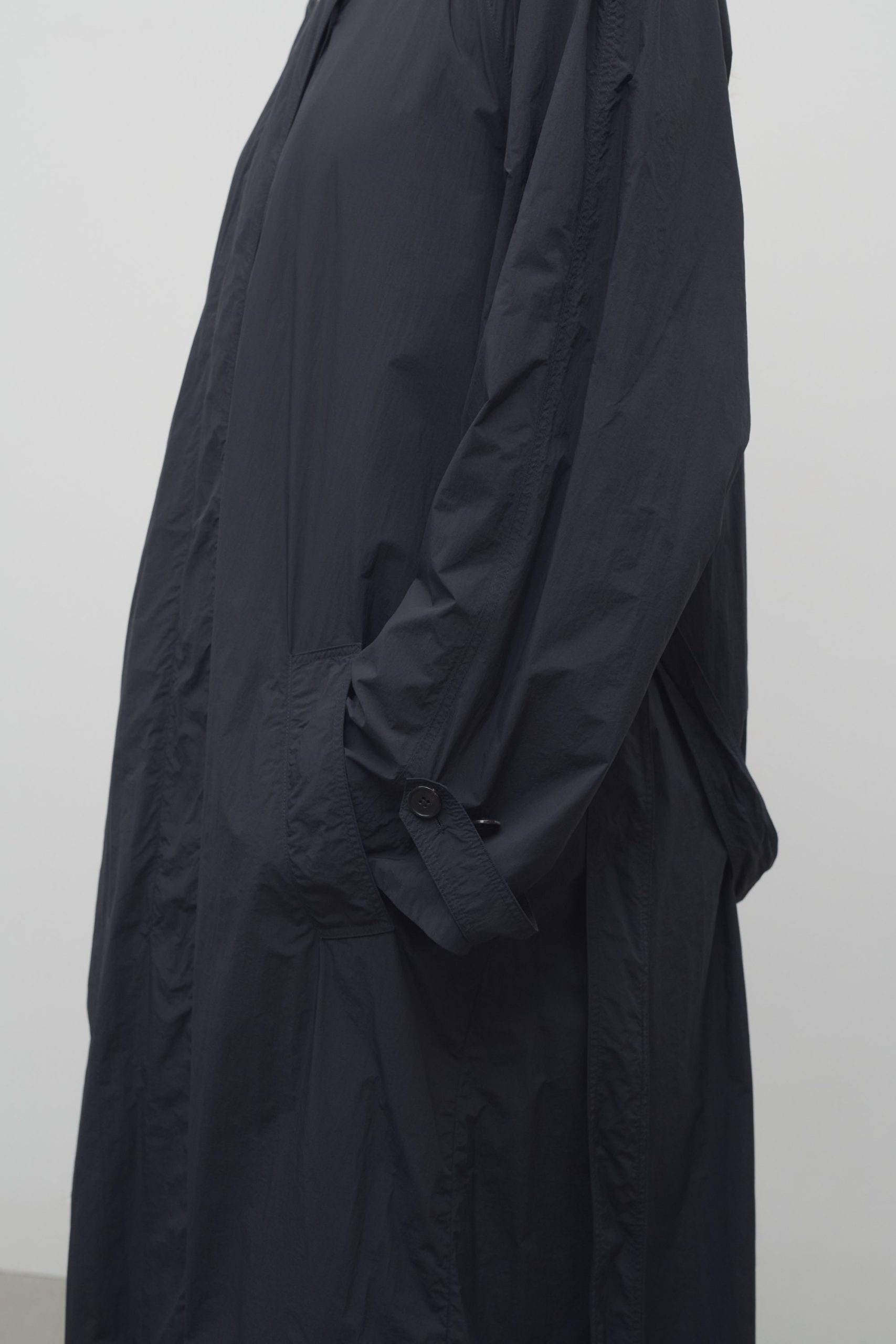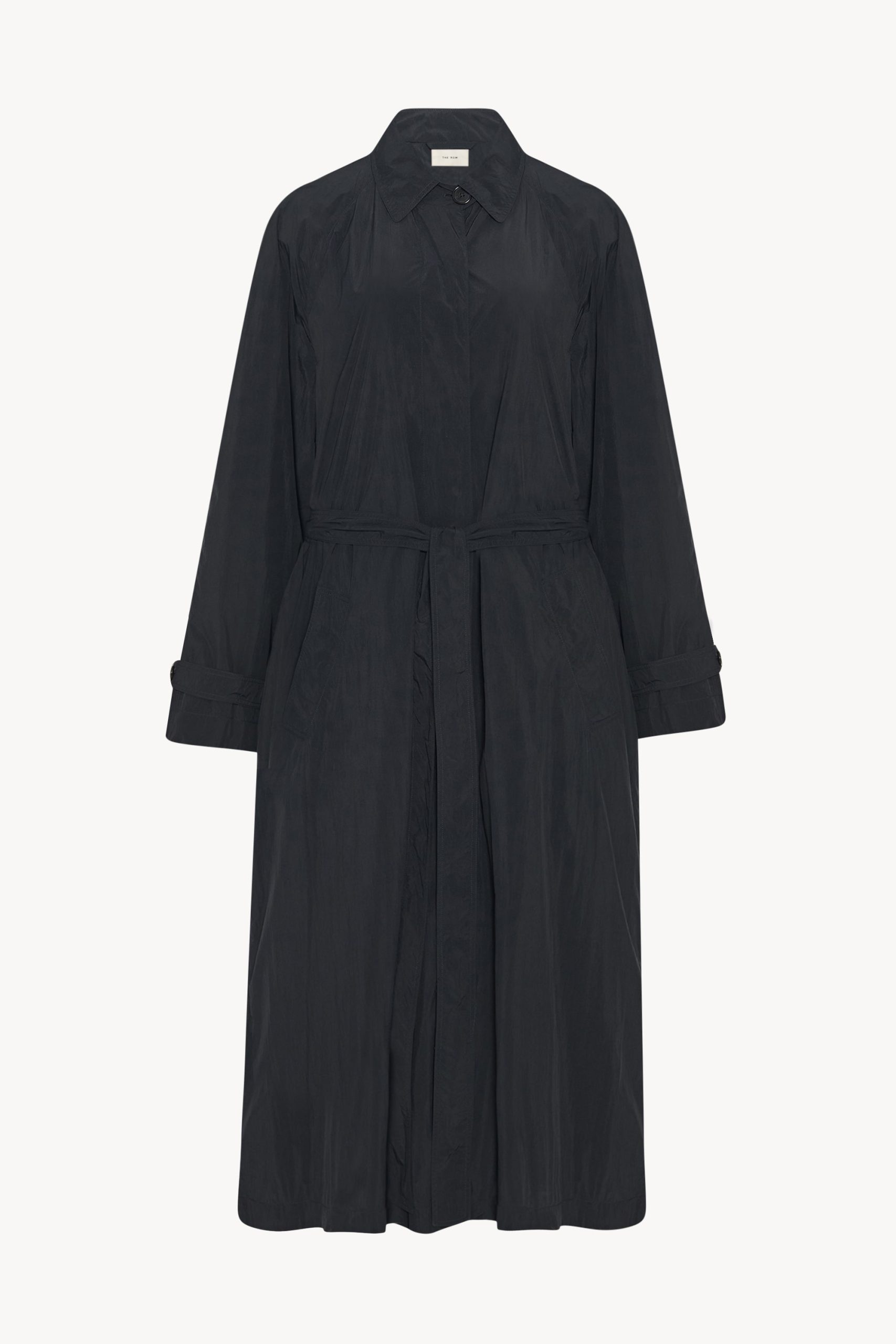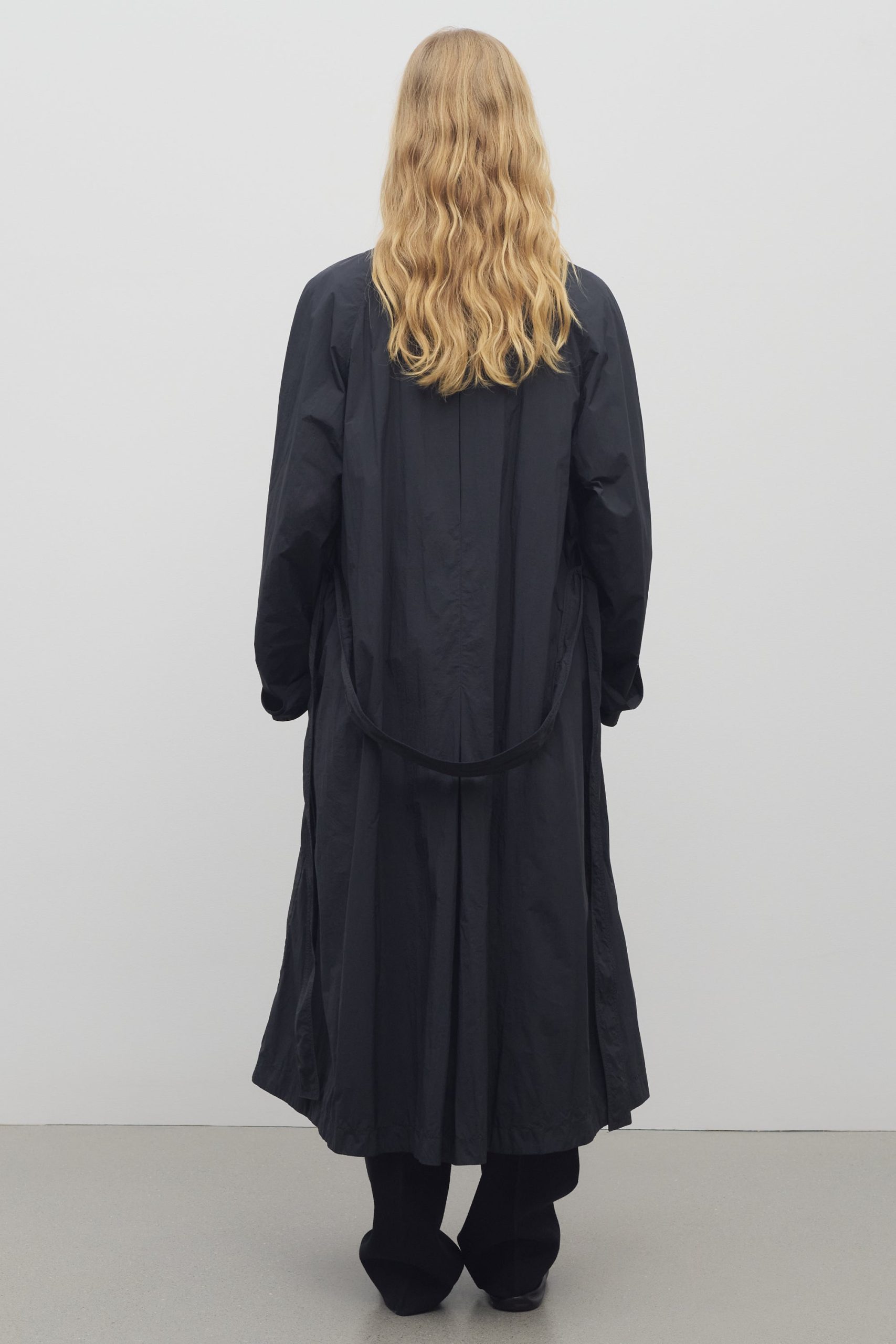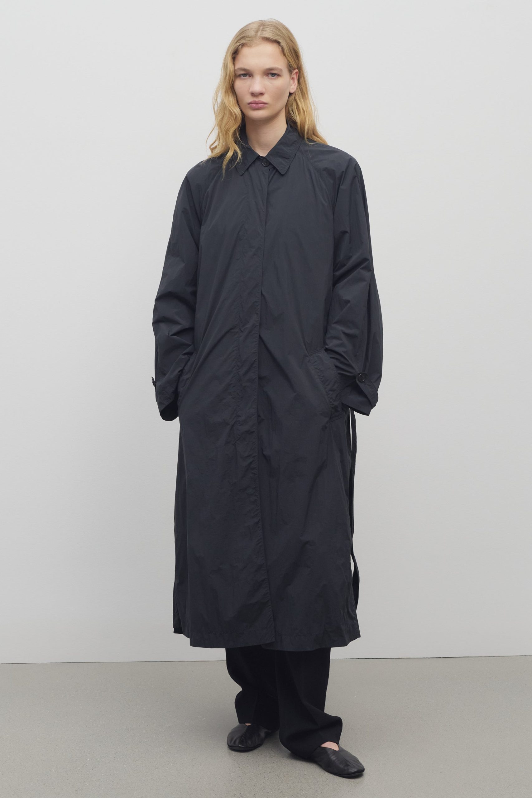 Ankle-length trench coat in water-repellent nylon with self belt. front welt pockets. and concealed front placket with horn button closure.