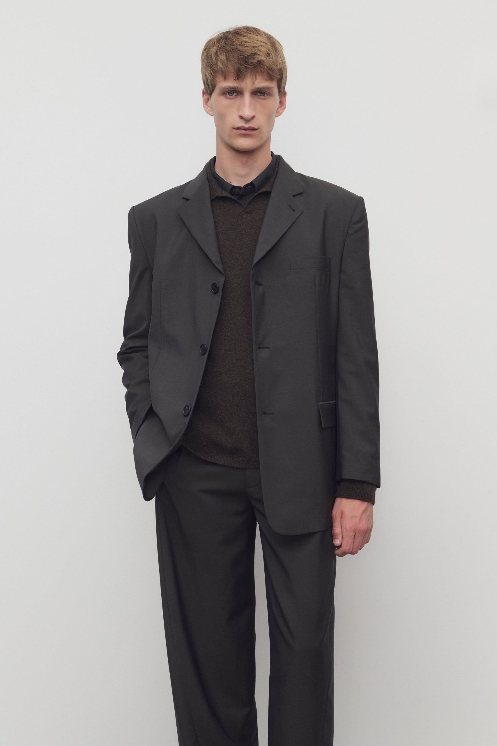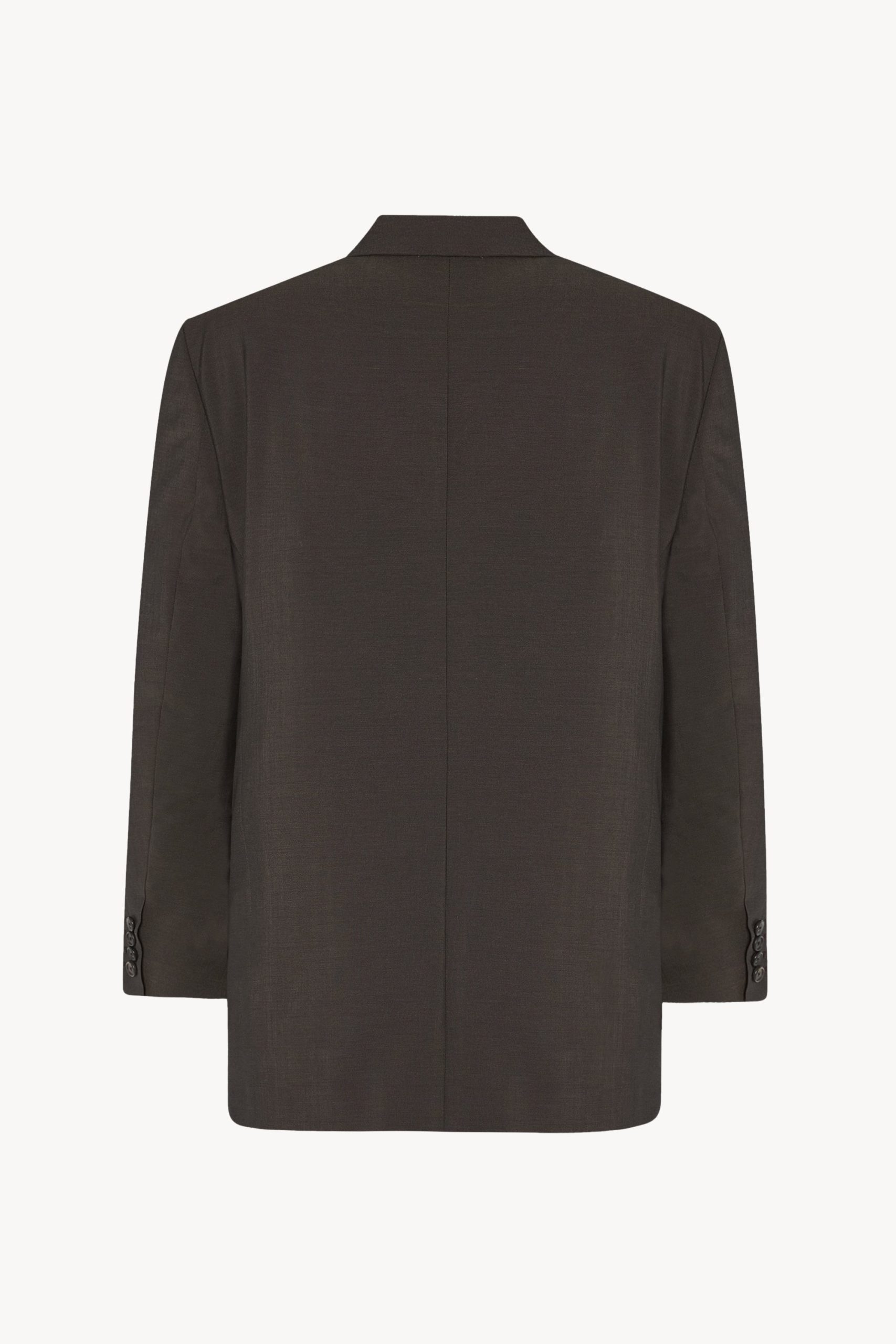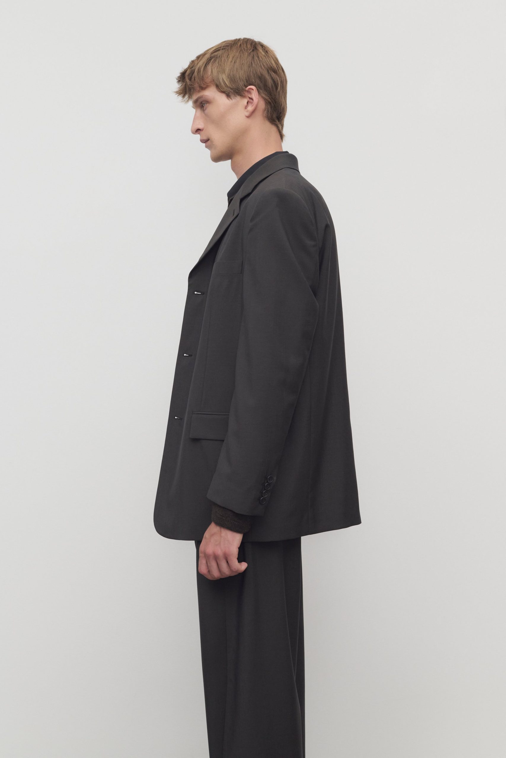 Single-breasted tailored jacket in lightweight virgin wool and mohair with notch lapel. front flap pockets. and front button closure.