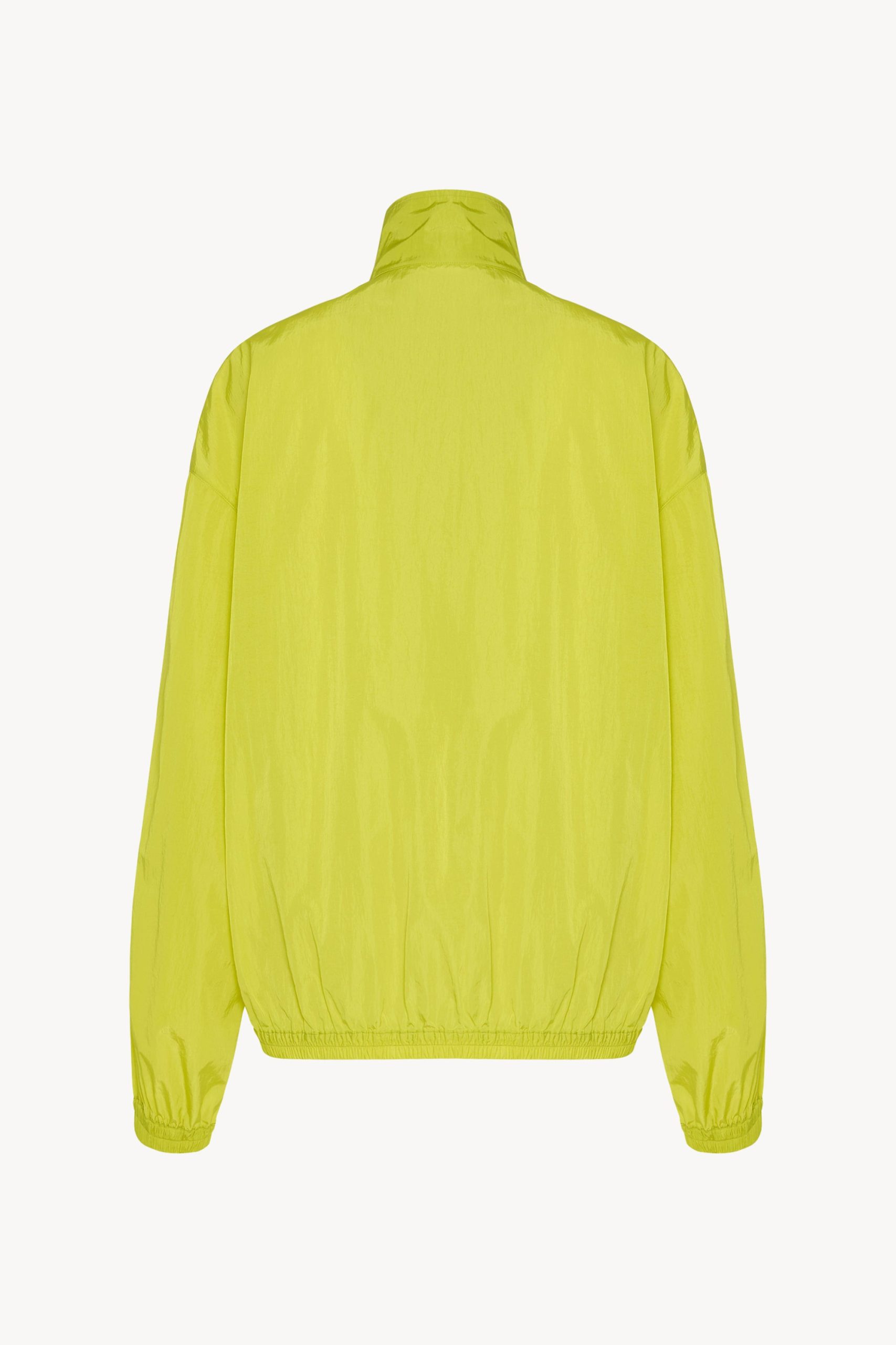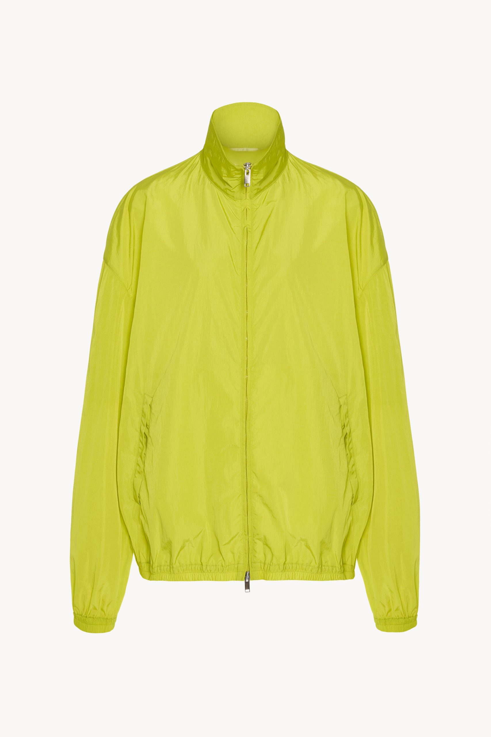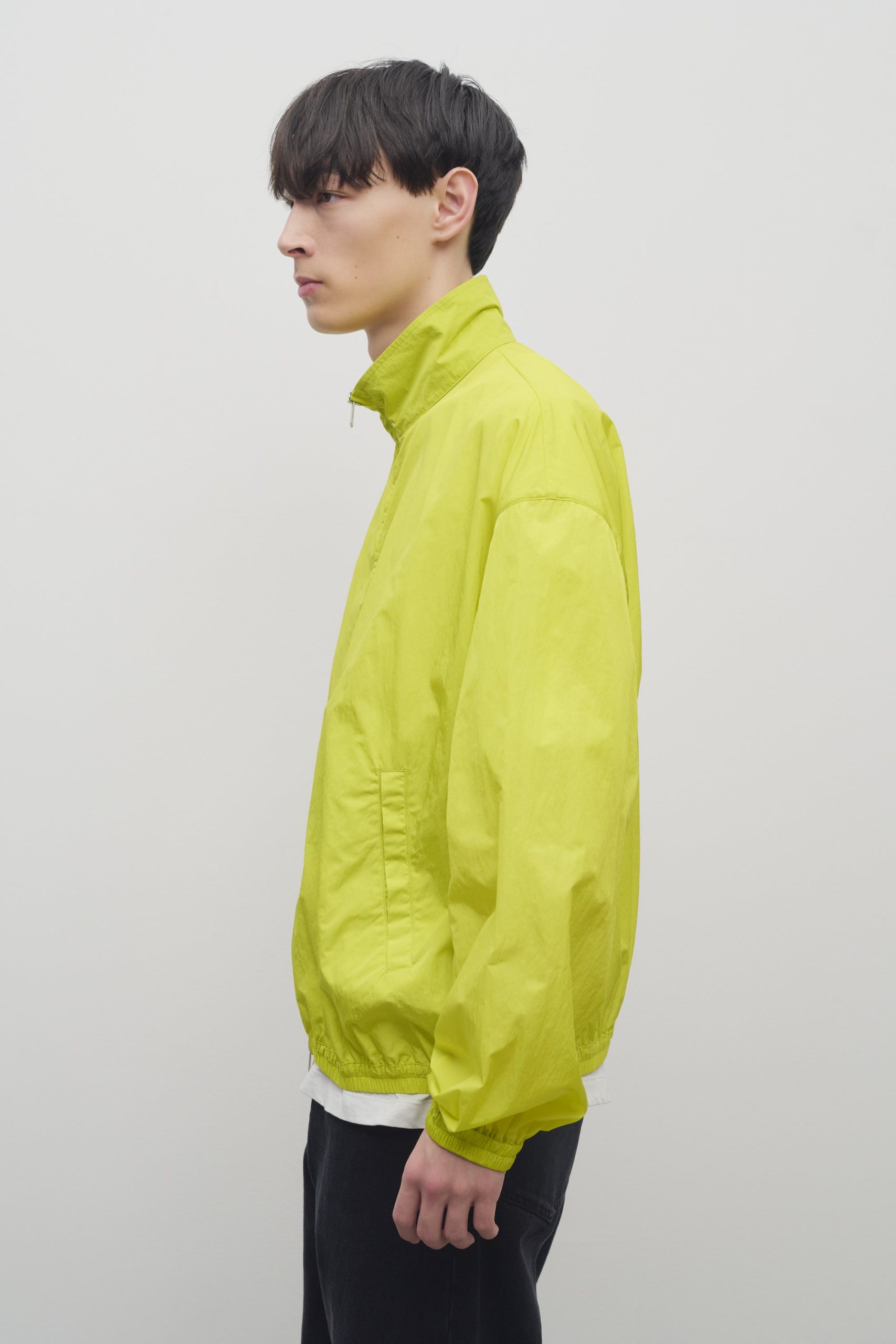 Relaxed bomber jacket in fluid technical nylon with elasticated cuffs and hem. front welt pockets. and front two-way zip closure.