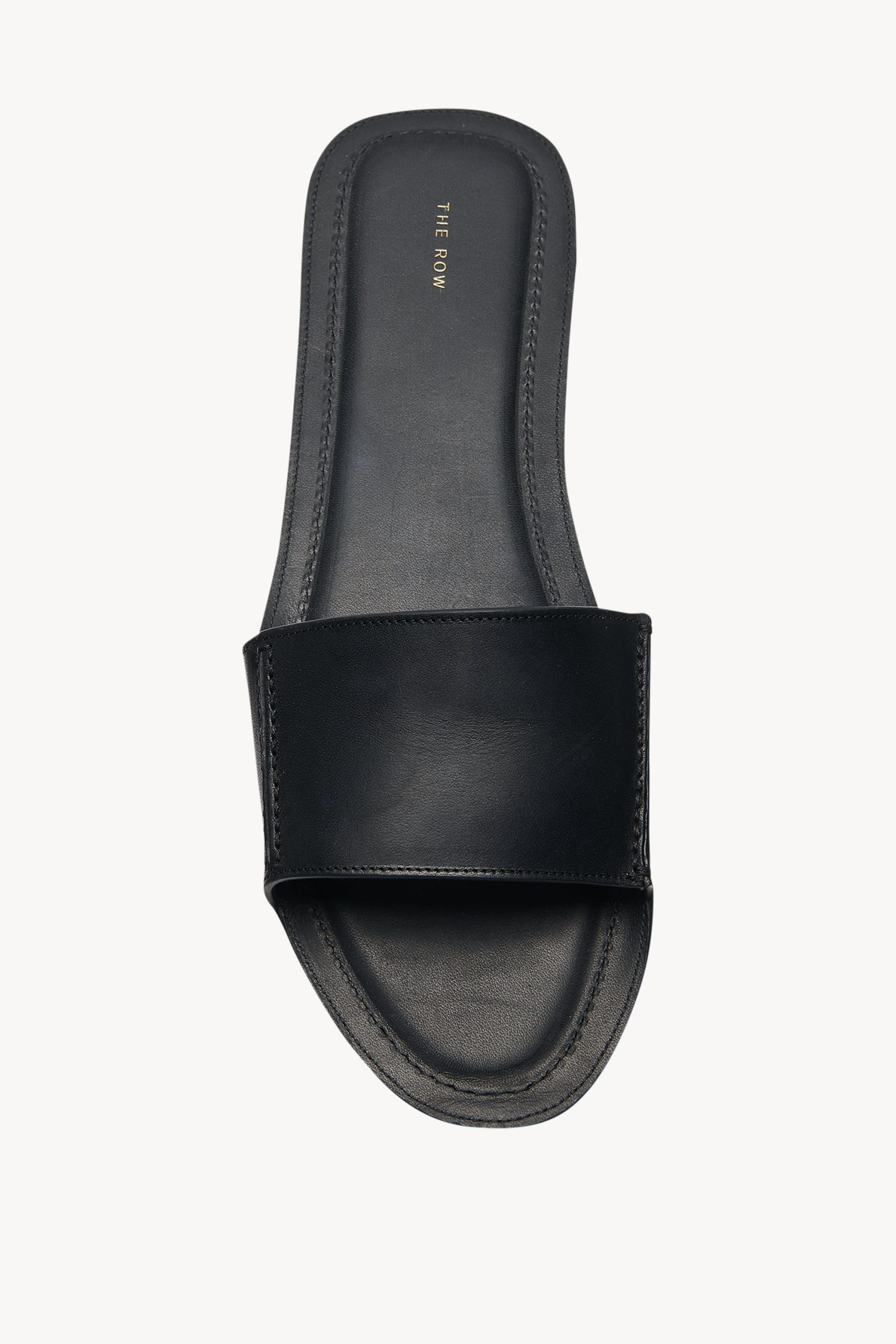 Refined slipper sandal in vegetable tanned calfskin leather with topstitched strap details and slim leather sole.