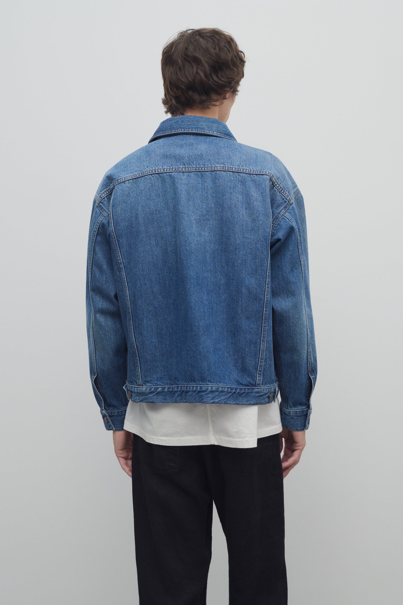 Classic denim jacket in garment treated denim with two front patch pockets. angled front seams. and front button placket.