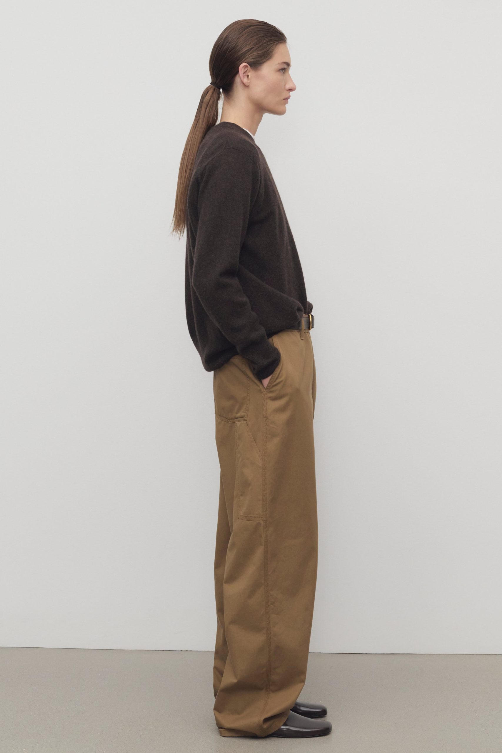 Mid-rise cargo pant in cotton and cashmere gabardine with straight leg. painter’s loop detail. and side seam pockets.
