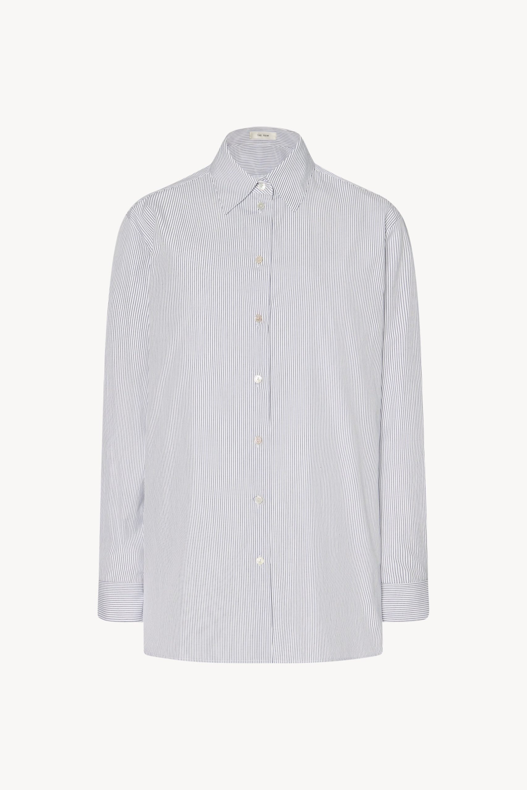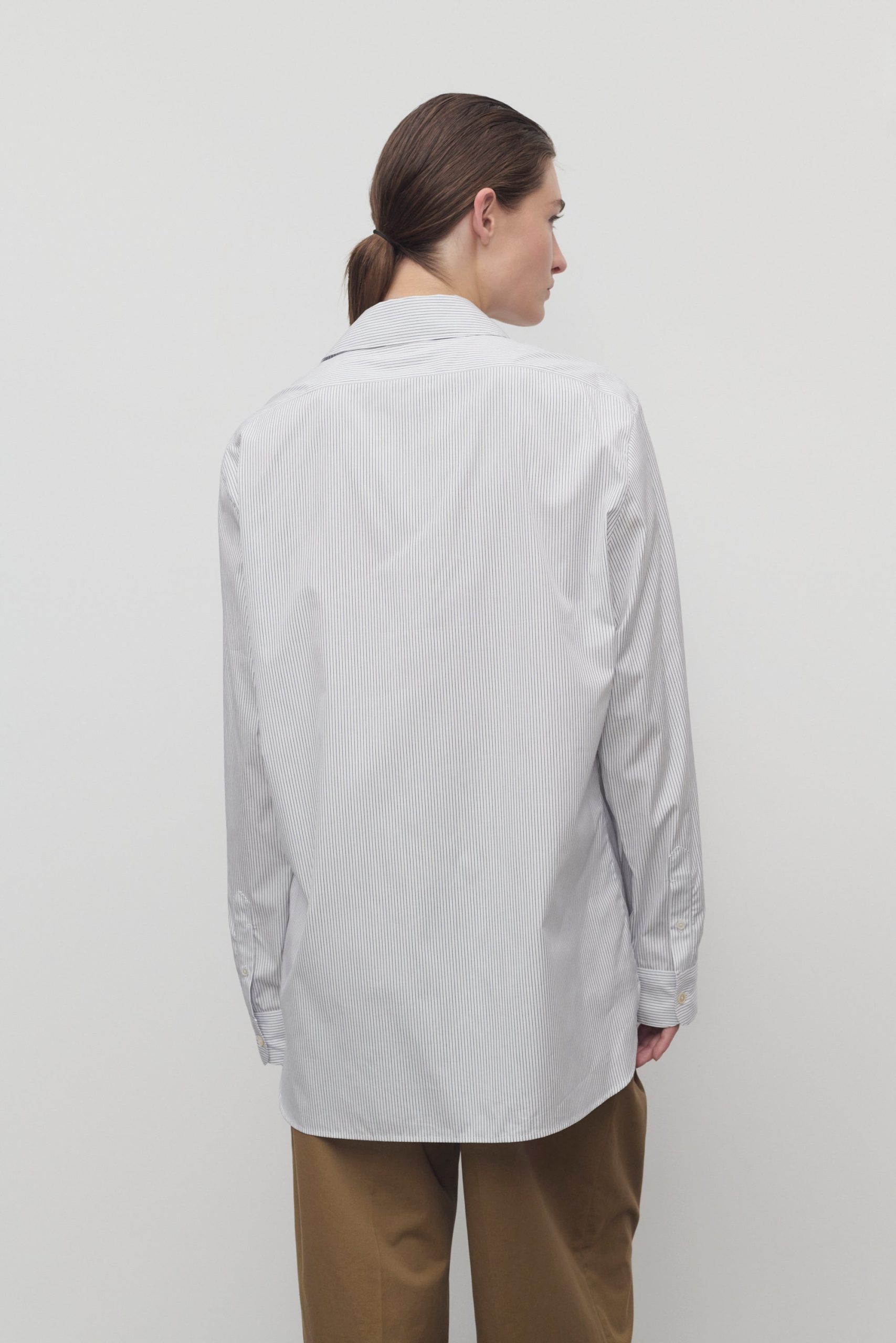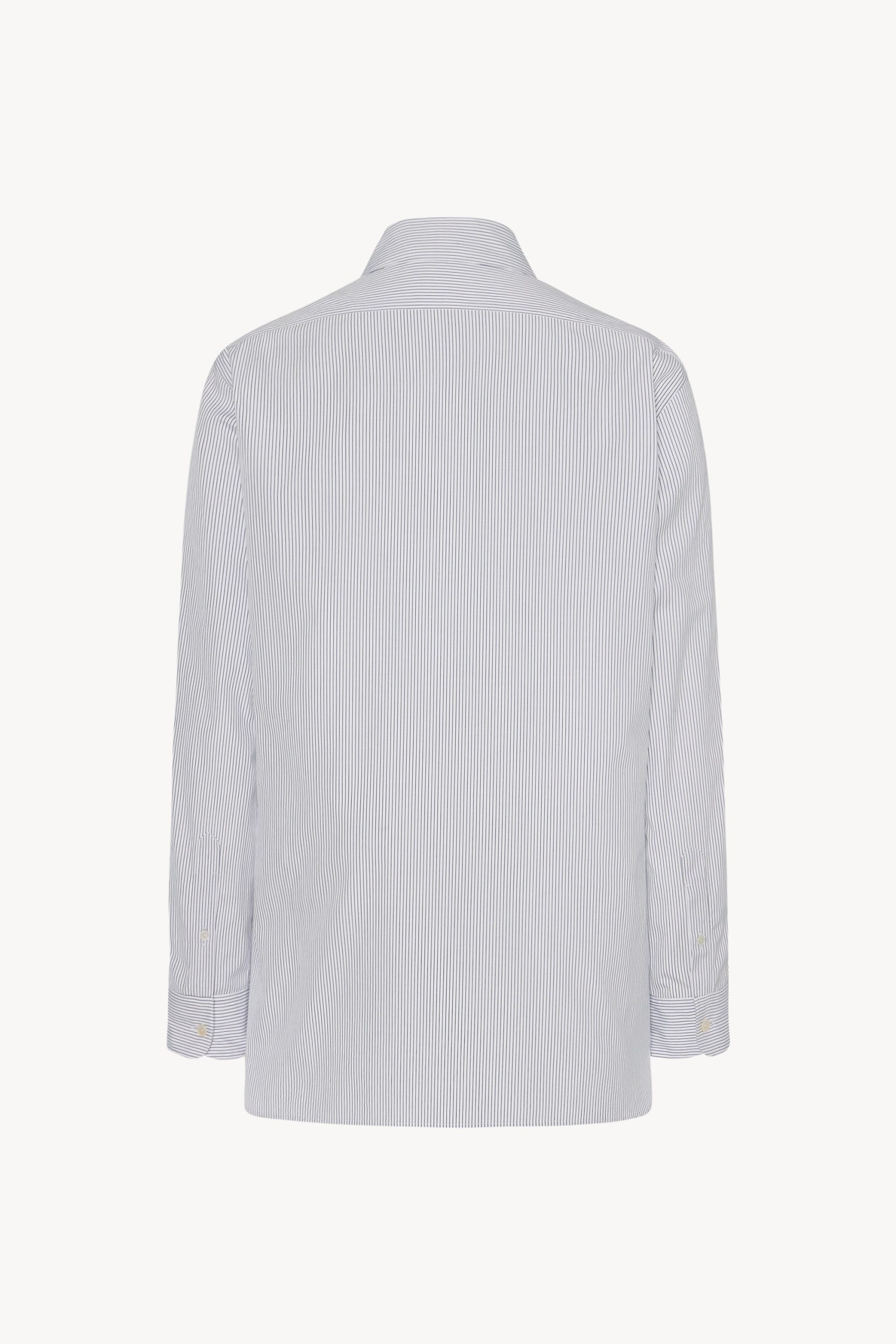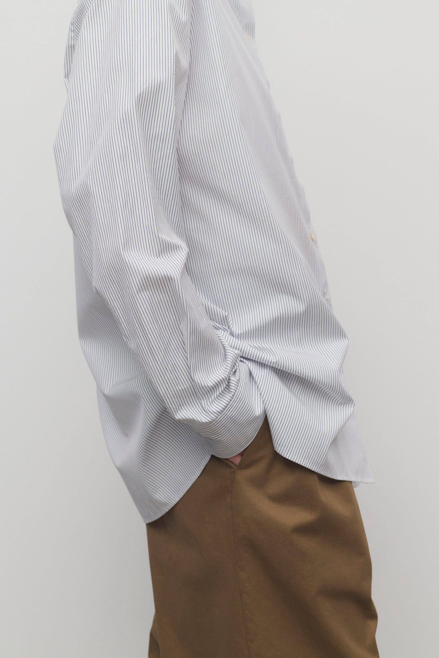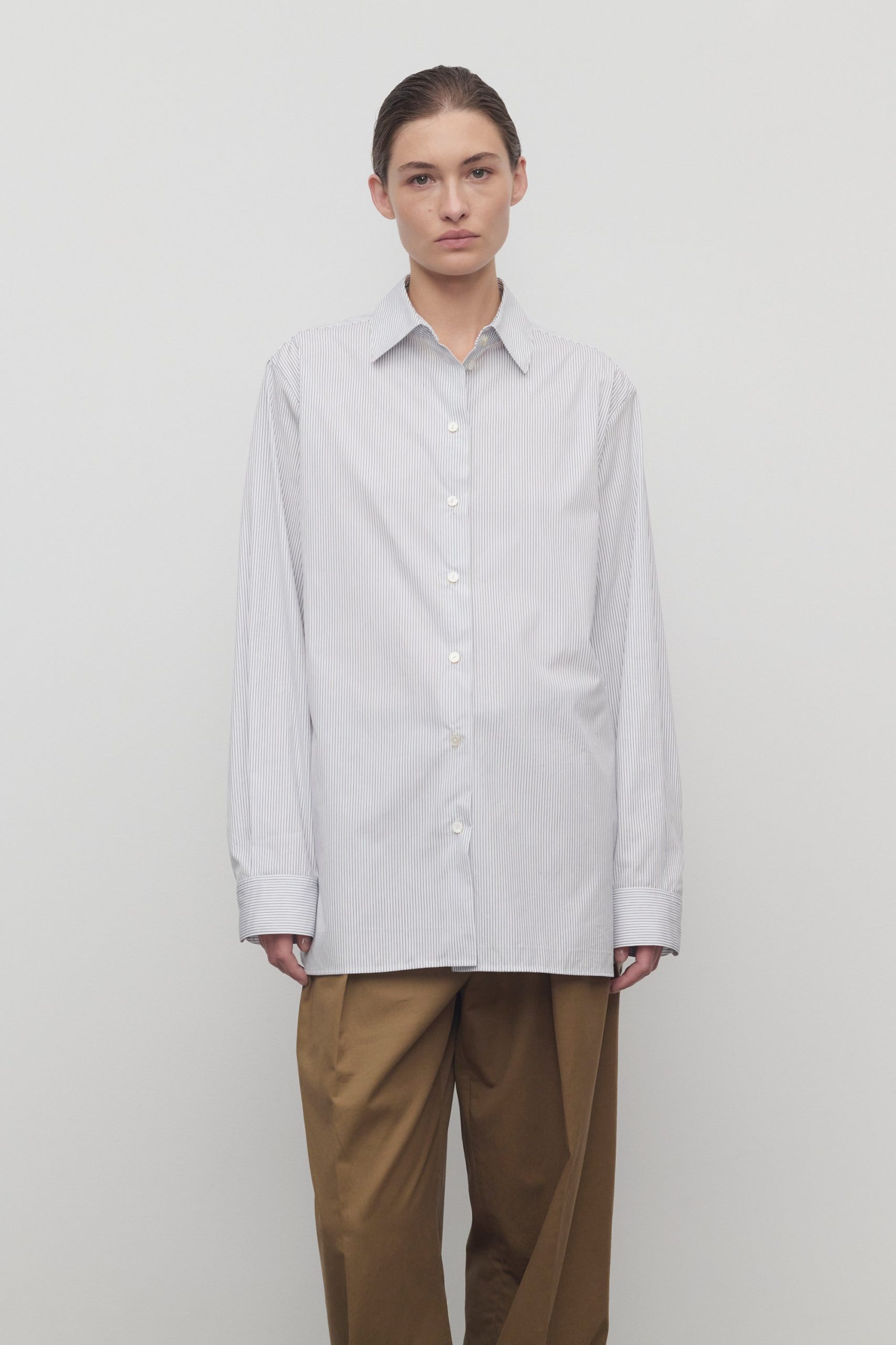 Classic button-up shirt in ultrafine Japanese striped cotton with slim back yoke. straight hem. and exposed front placket with horn button closure.