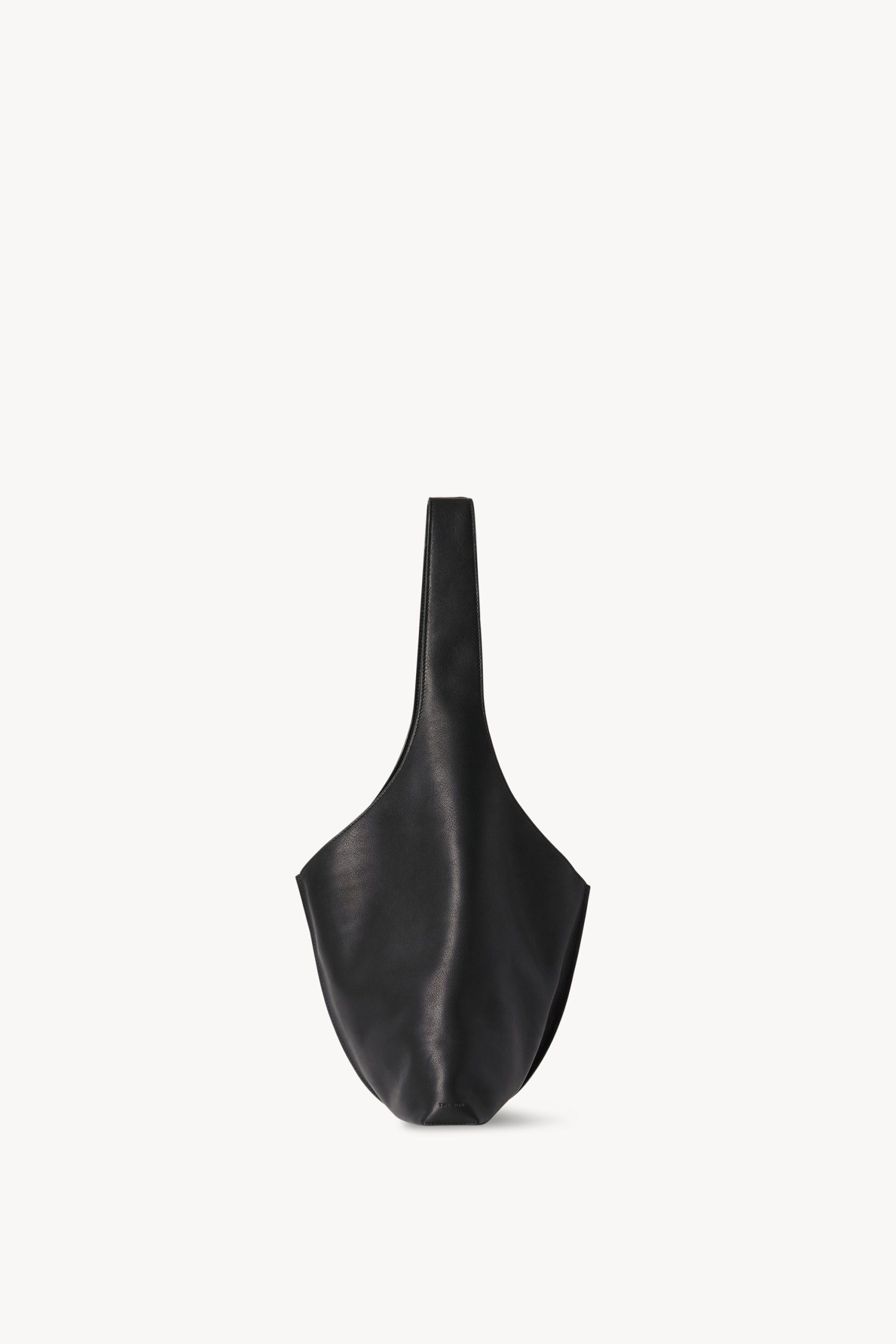 Unstructured handbag in polished saddle leather with draped handle. center seam detail. and detachable zipper pouch.
