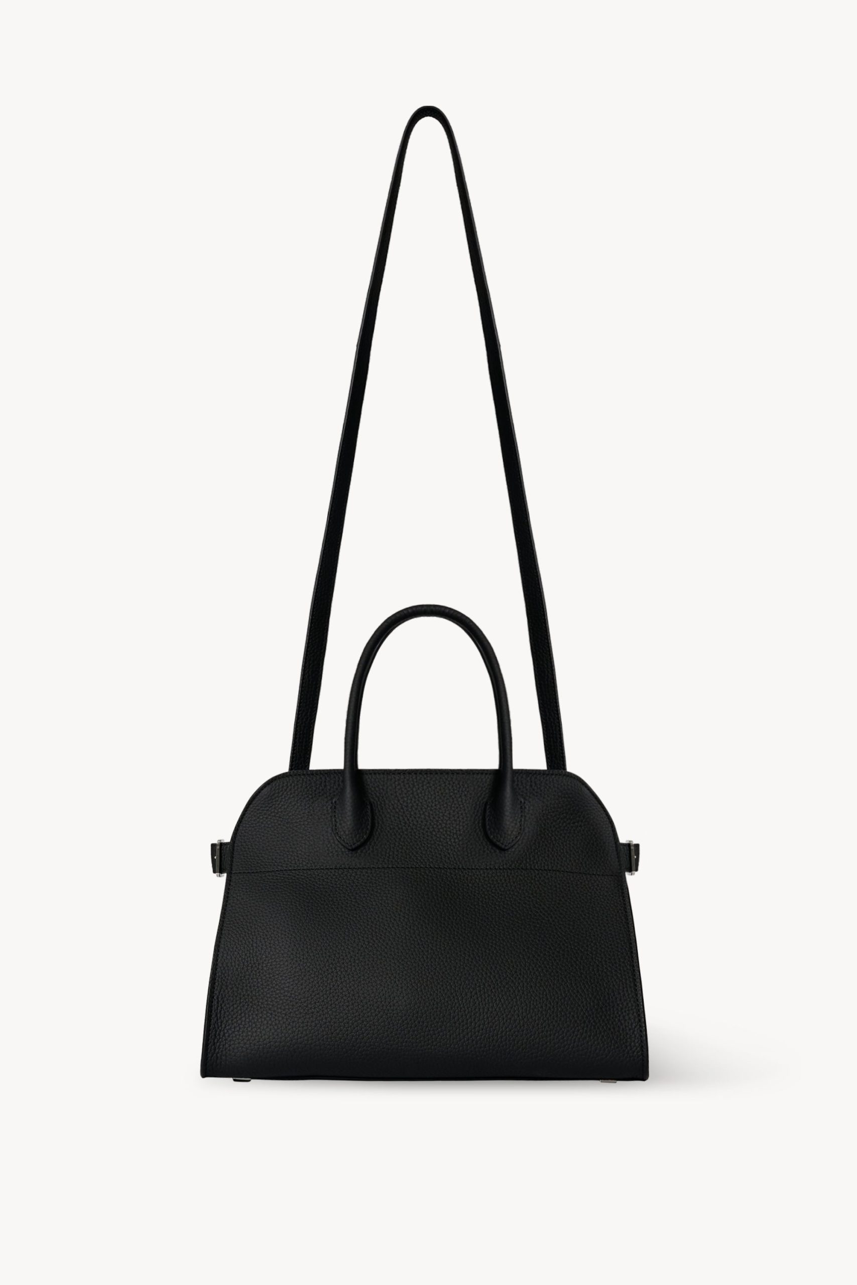 Softly structured top-handle bag in matte grained calfskin leather with belted gusseted side panels and interior toggle closure.