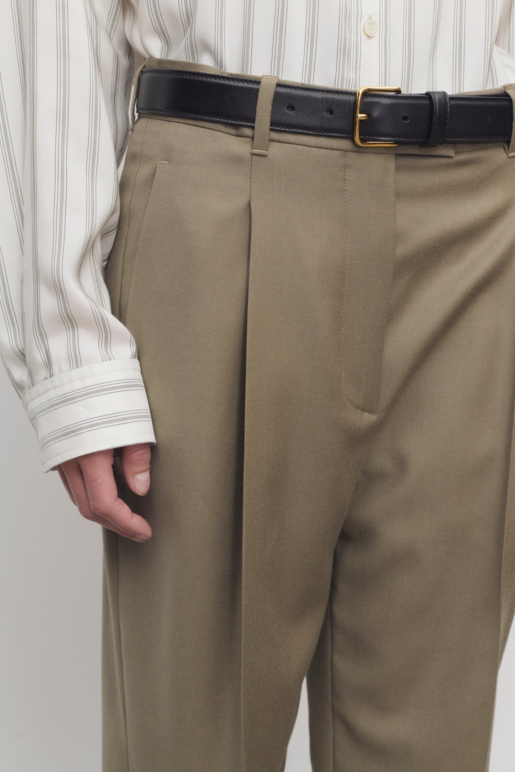 High-rise tailored trouser in virgin wool flannel with stitched front pleats. straight leg with rolled hem. and slanted side pockets.