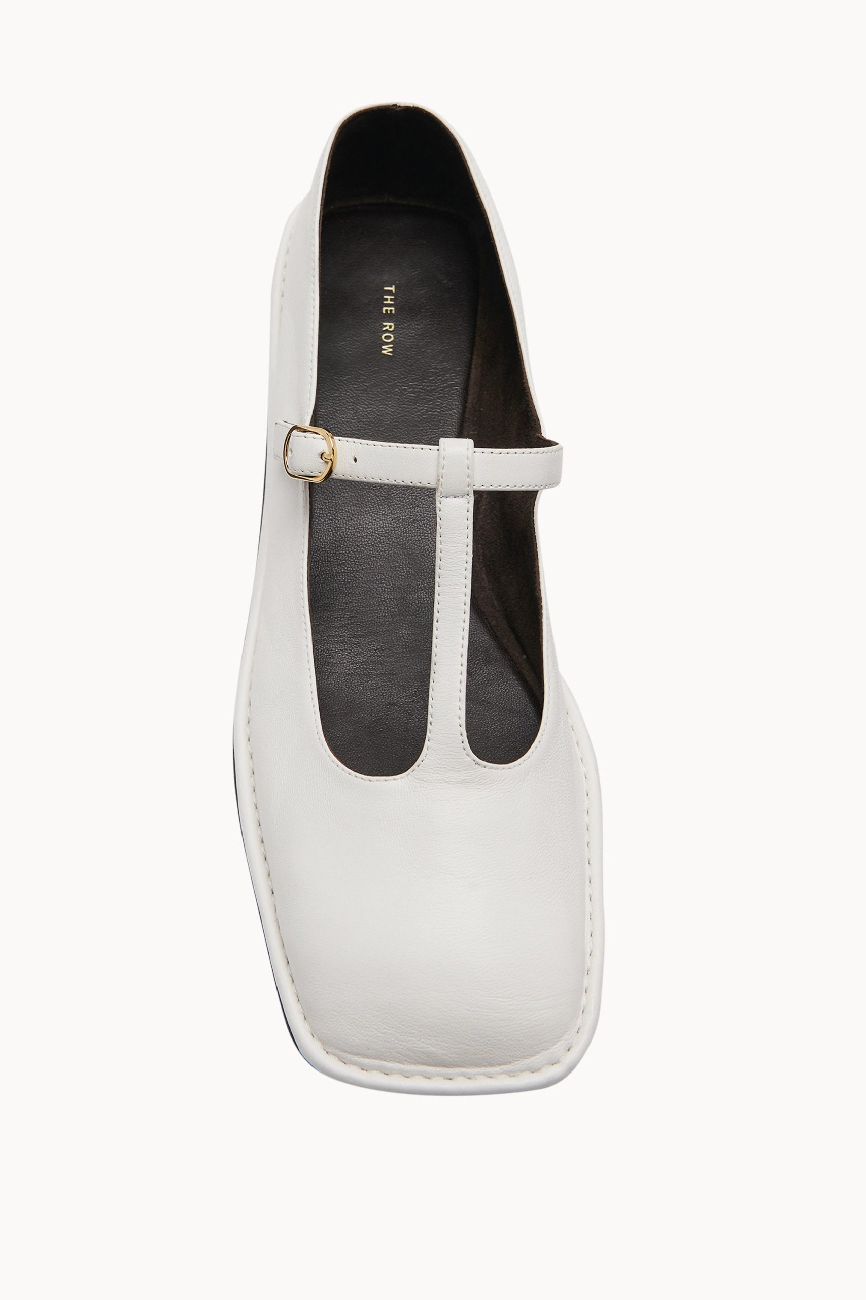 Flat t-strap shoe in soft lightweight leather with squared toe. rubber sole. and adjustable buckle closure.