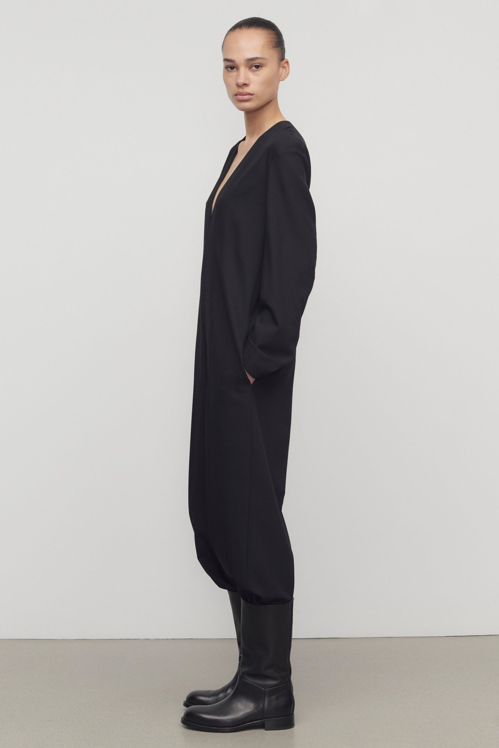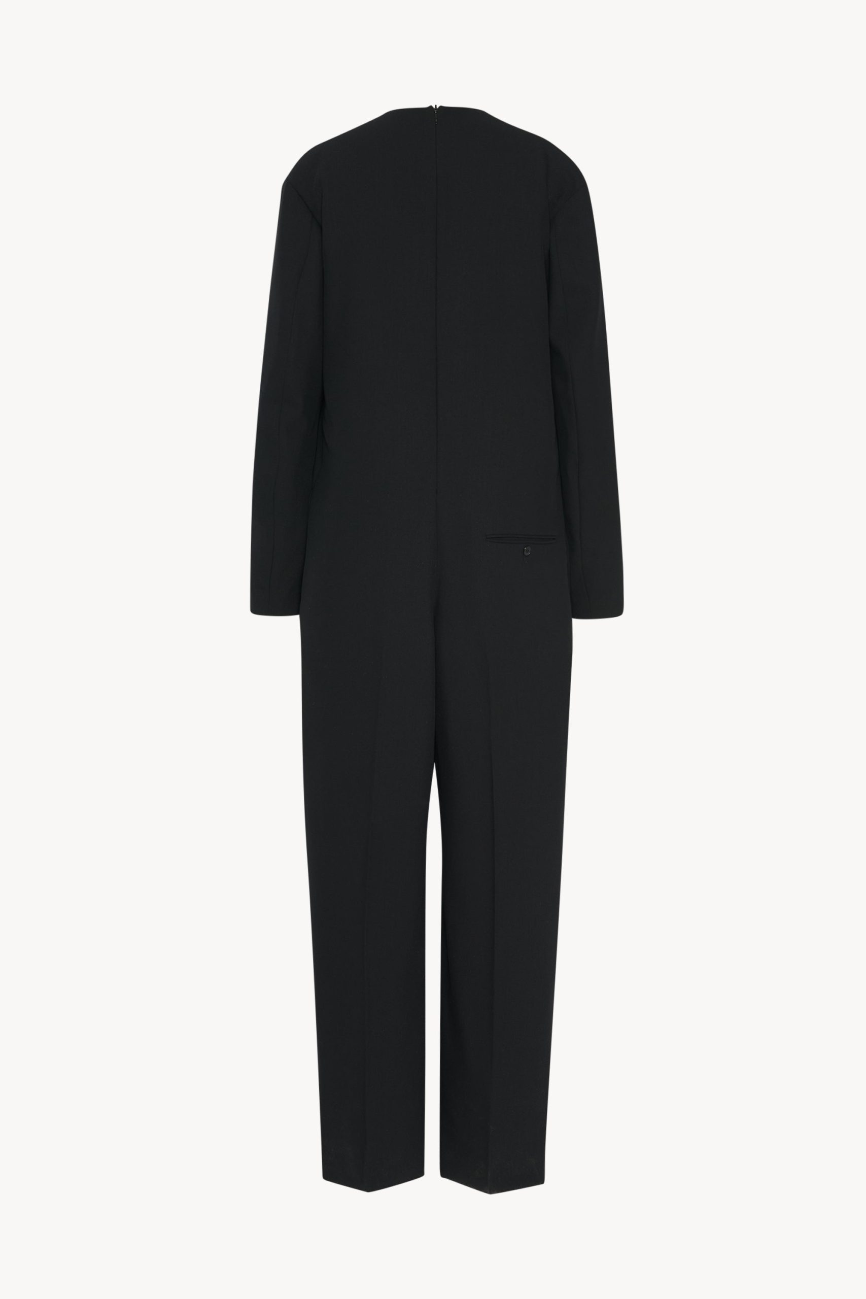 Relaxed tailored jumpsuit in smooth virgin wool gabardine with creased leg. side seam pockets. and center back zip closure.