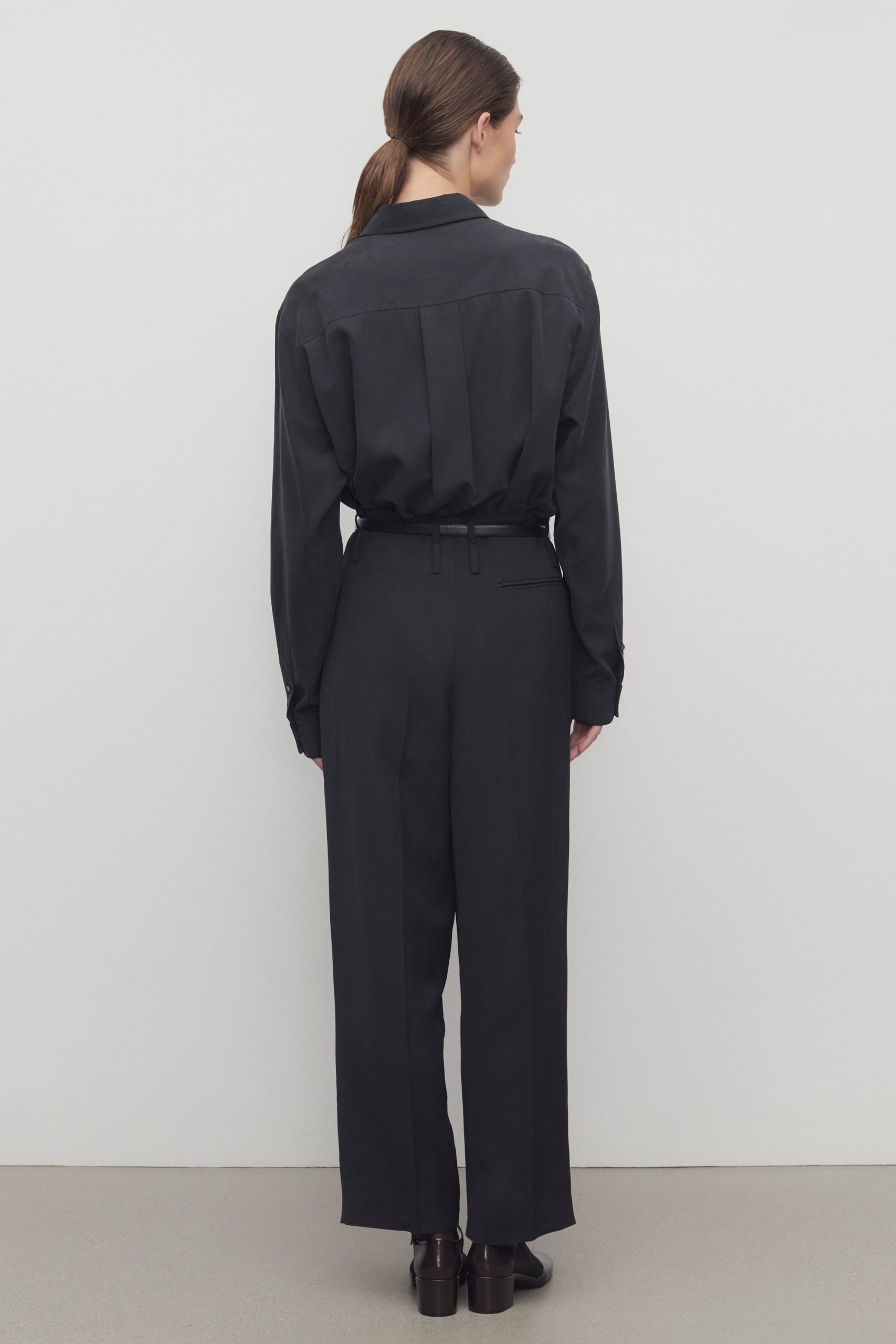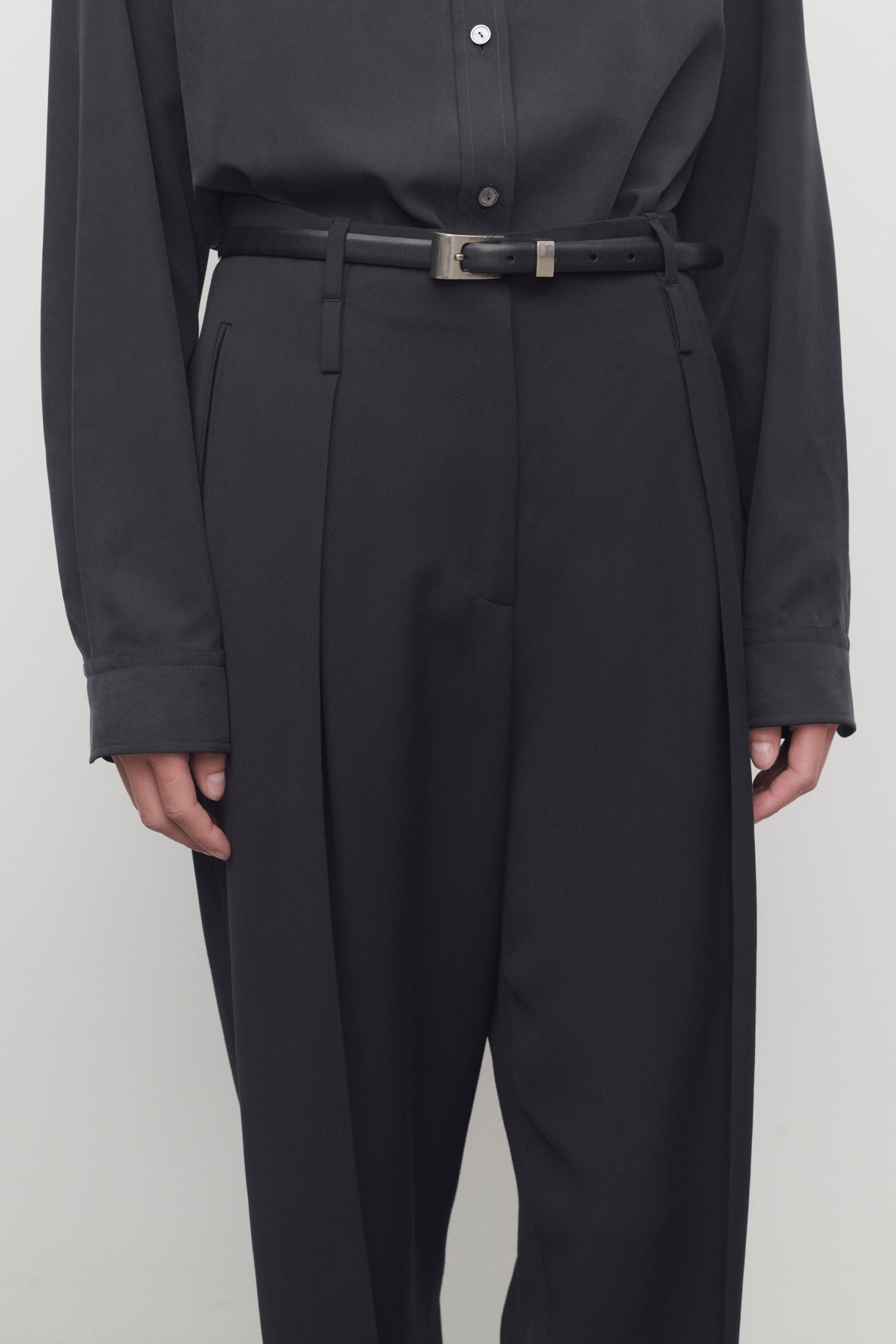 High-rise tailored trouser in lightweight silk twill with tapered hem. pressed front and back creases. and side welt pockets.