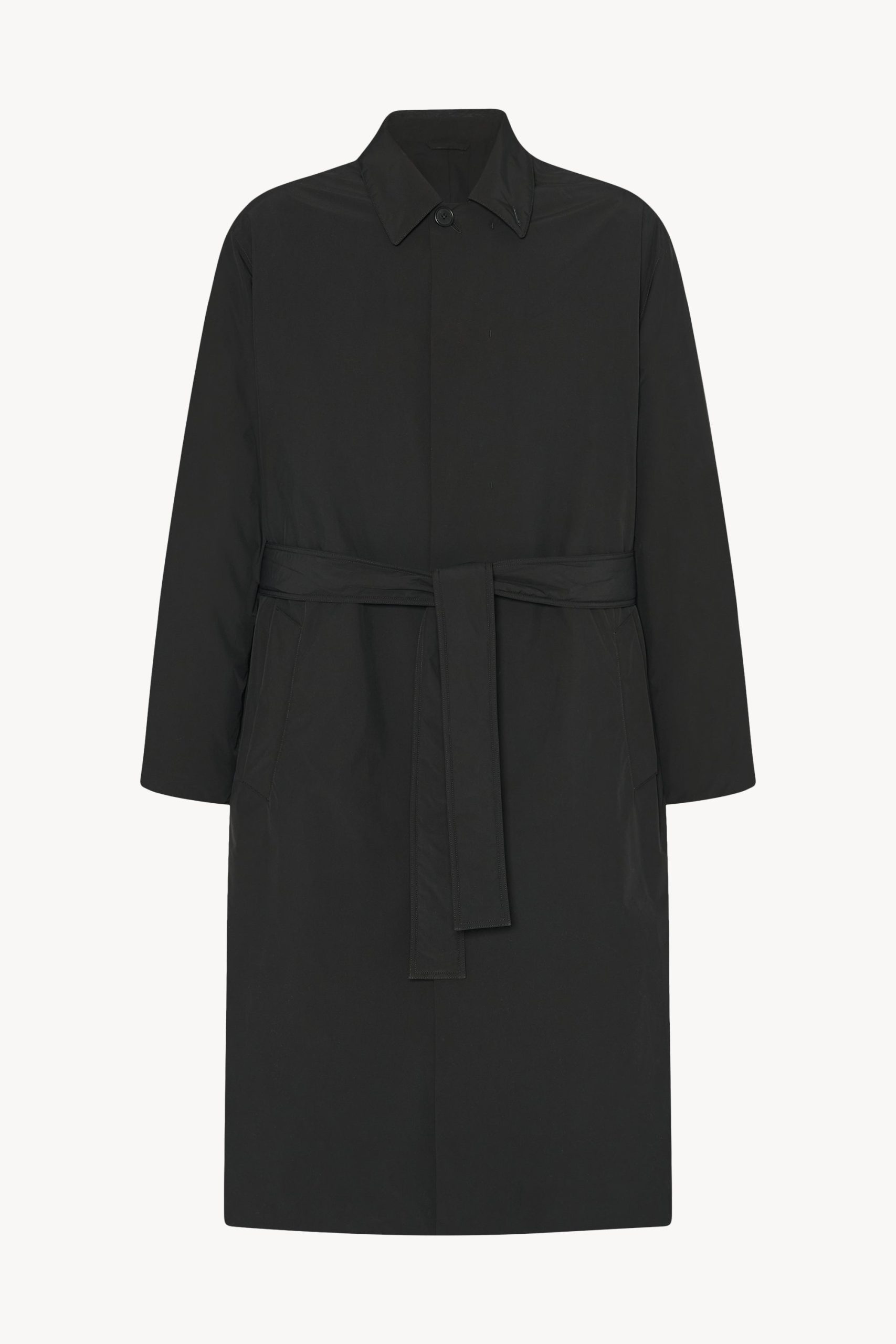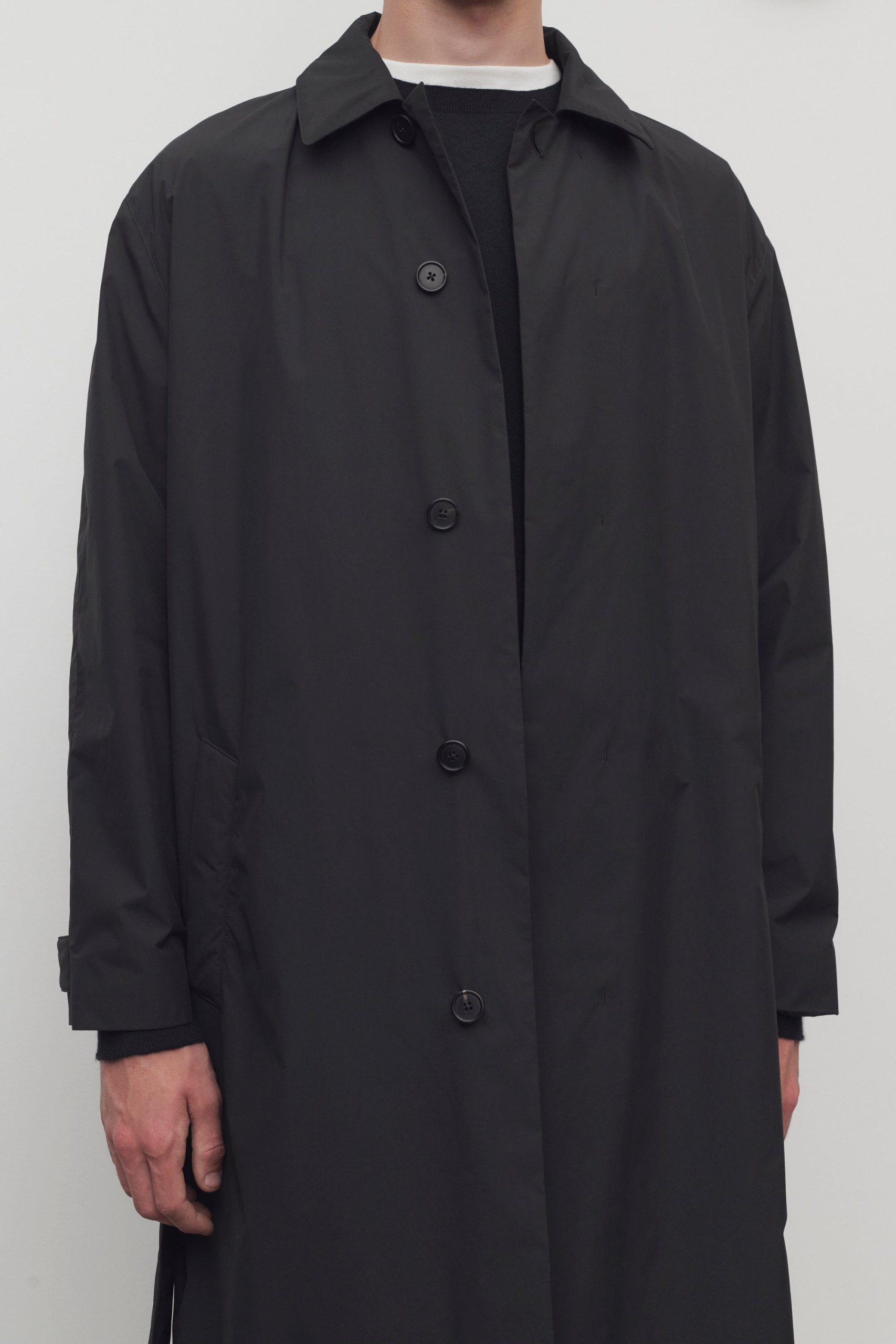 Single-breasted trench coat in water-repellant technical fabric with removable belt. slant welt pockets. and concealed front placket with button closure.