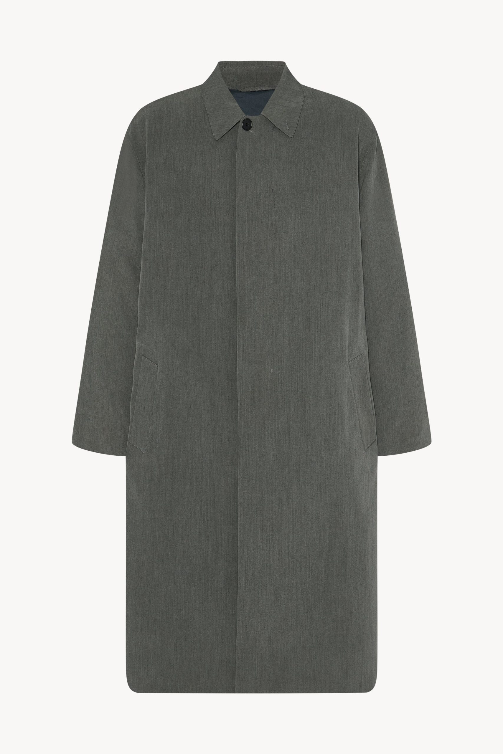 Single-breasted trench coat in double-faced silk and wool with removable belt. slant welt pockets. and concealed front placket with button closure.