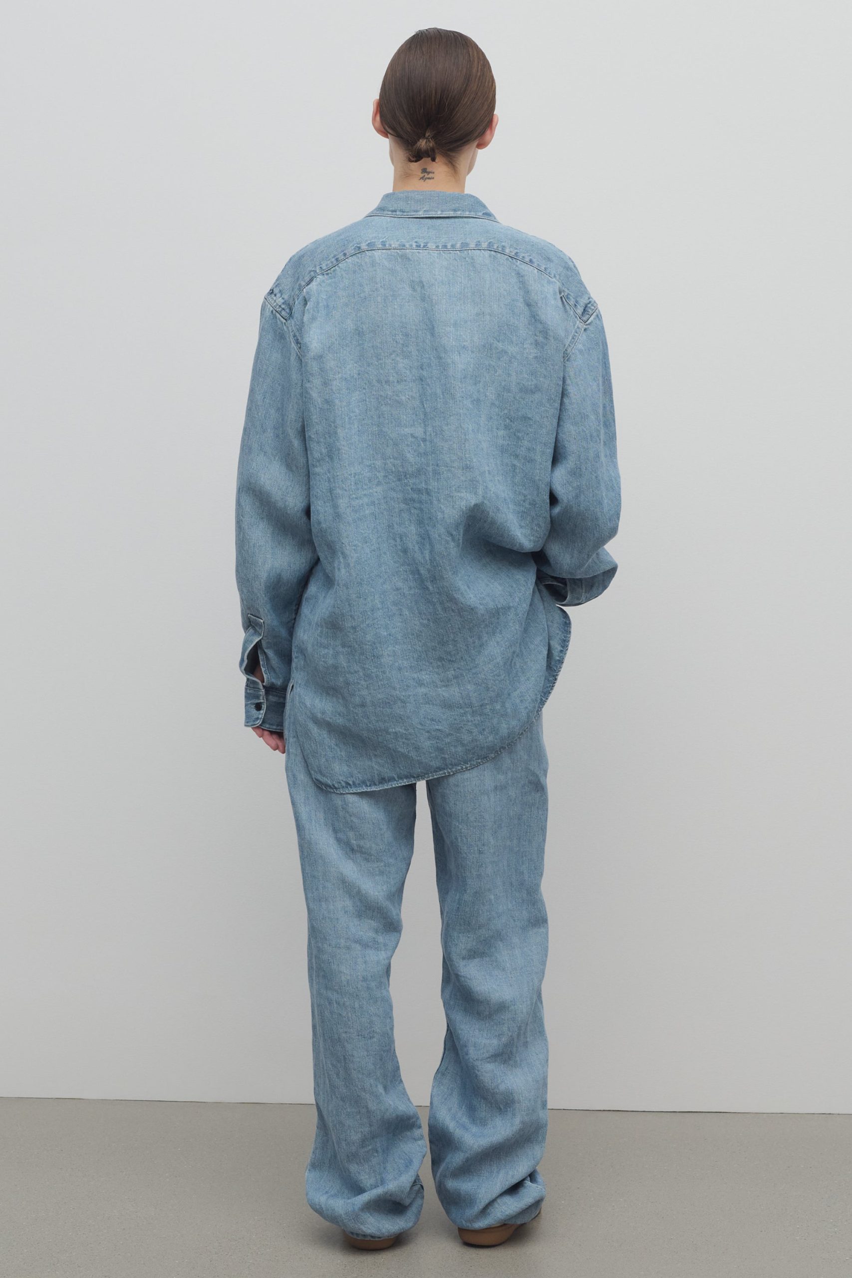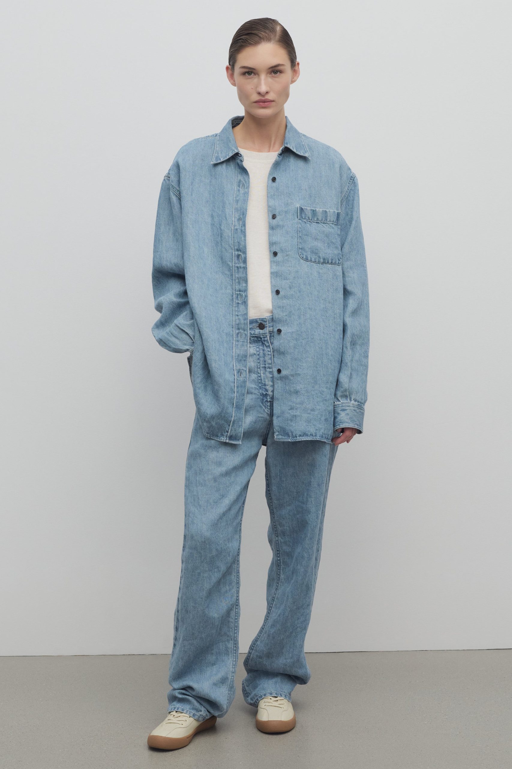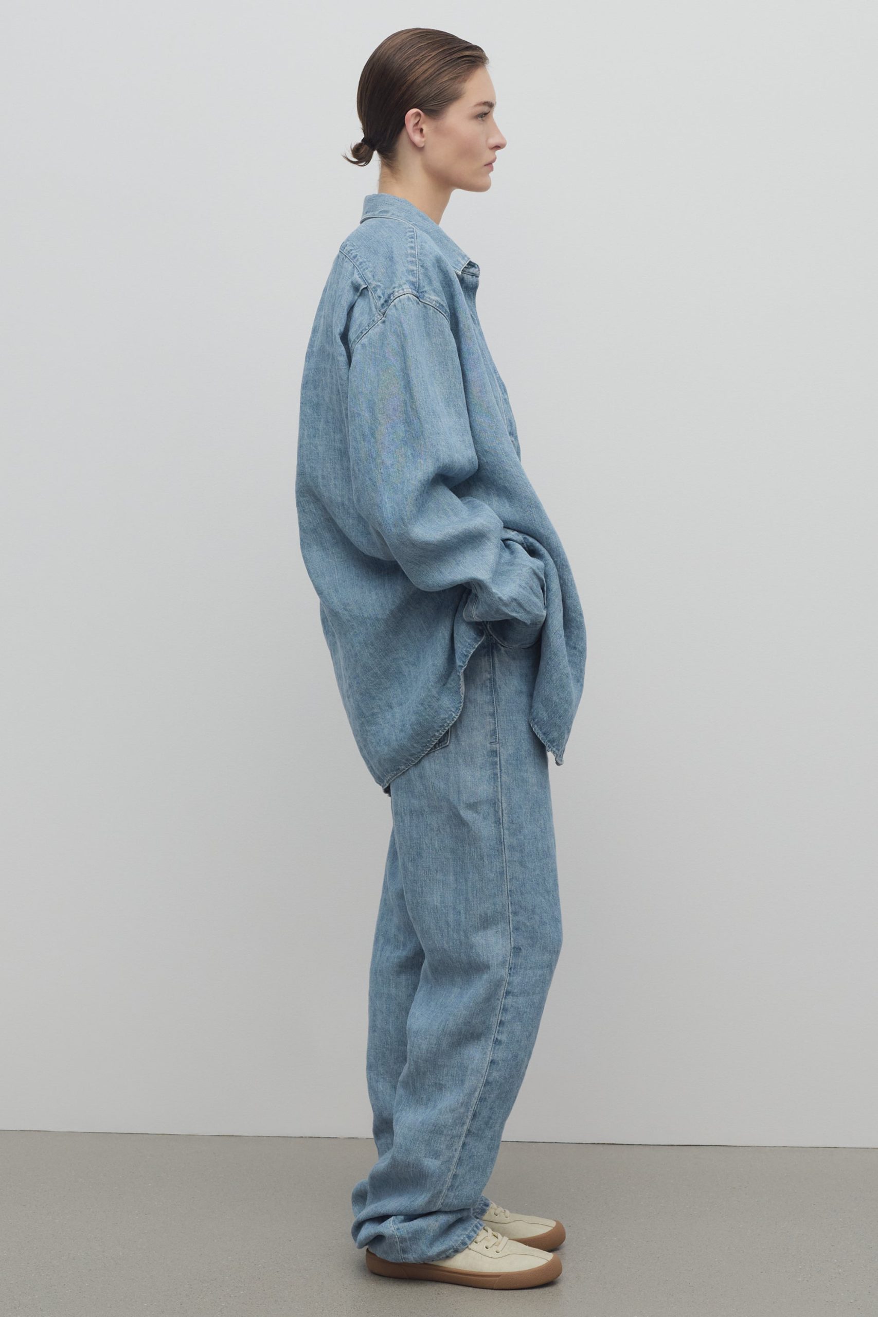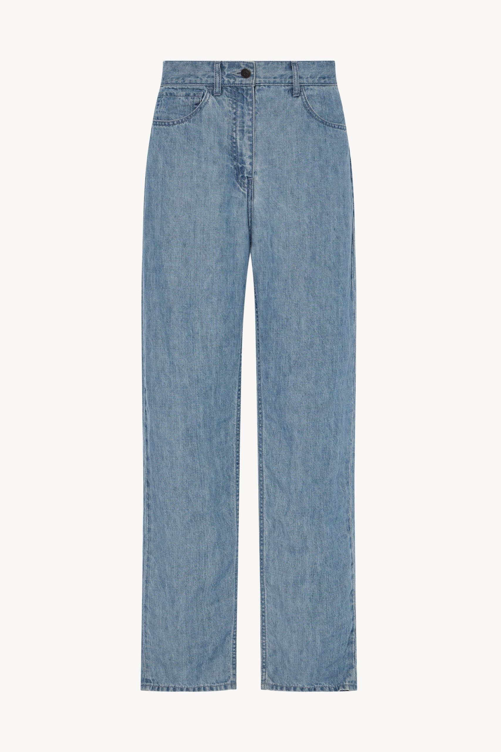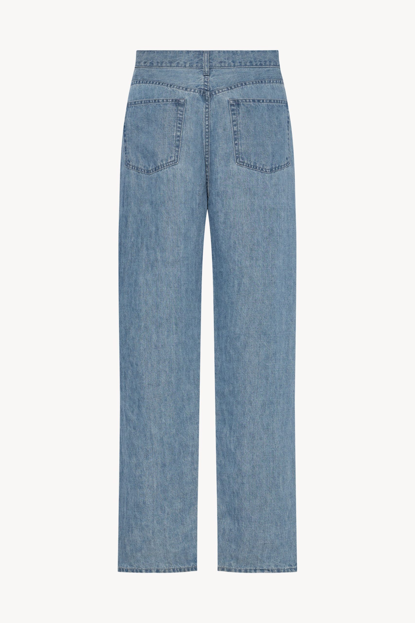 Mid-rise jean in soft linen denim with relaxed fit. tonal topstitching. and classic 5-pocket construction.