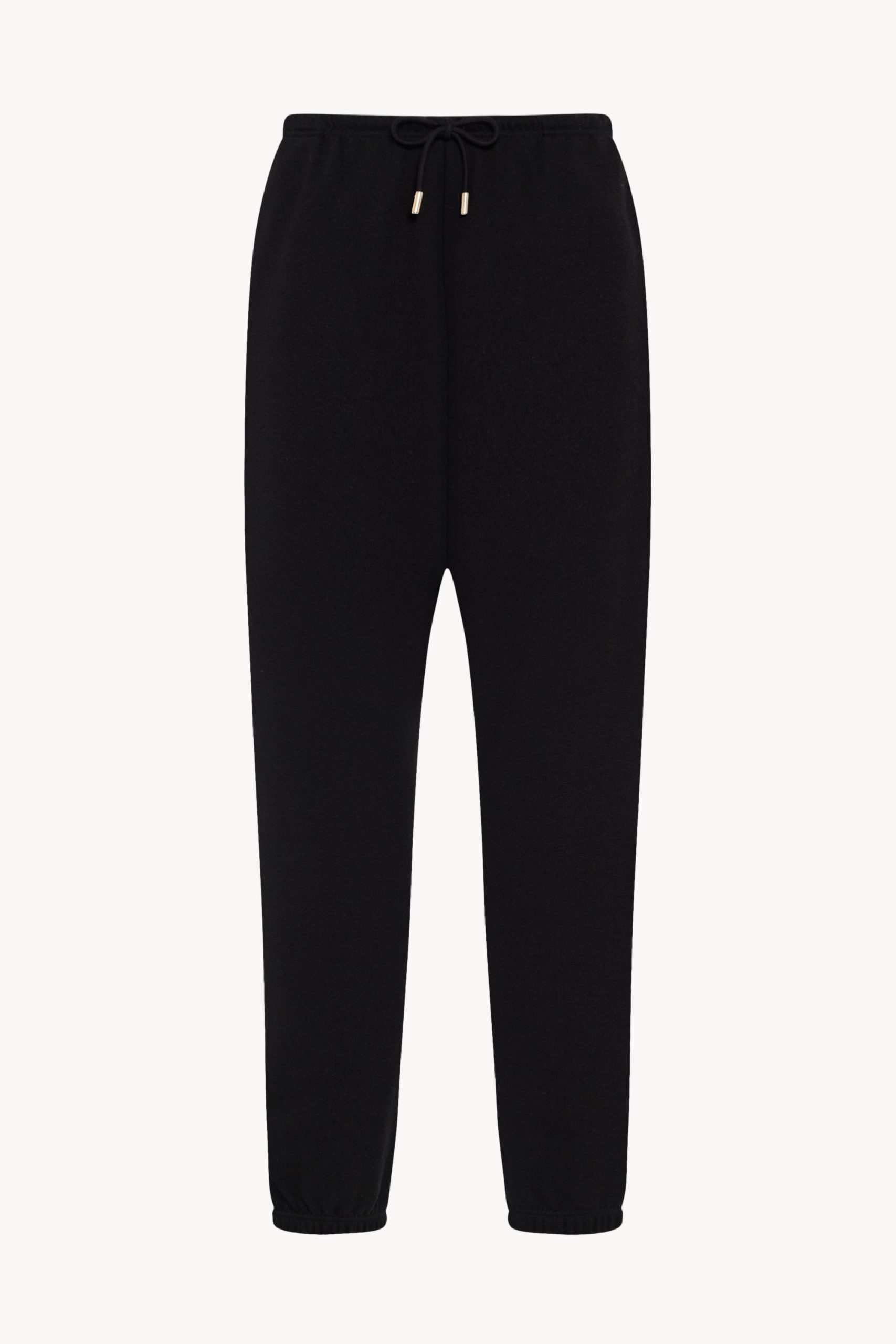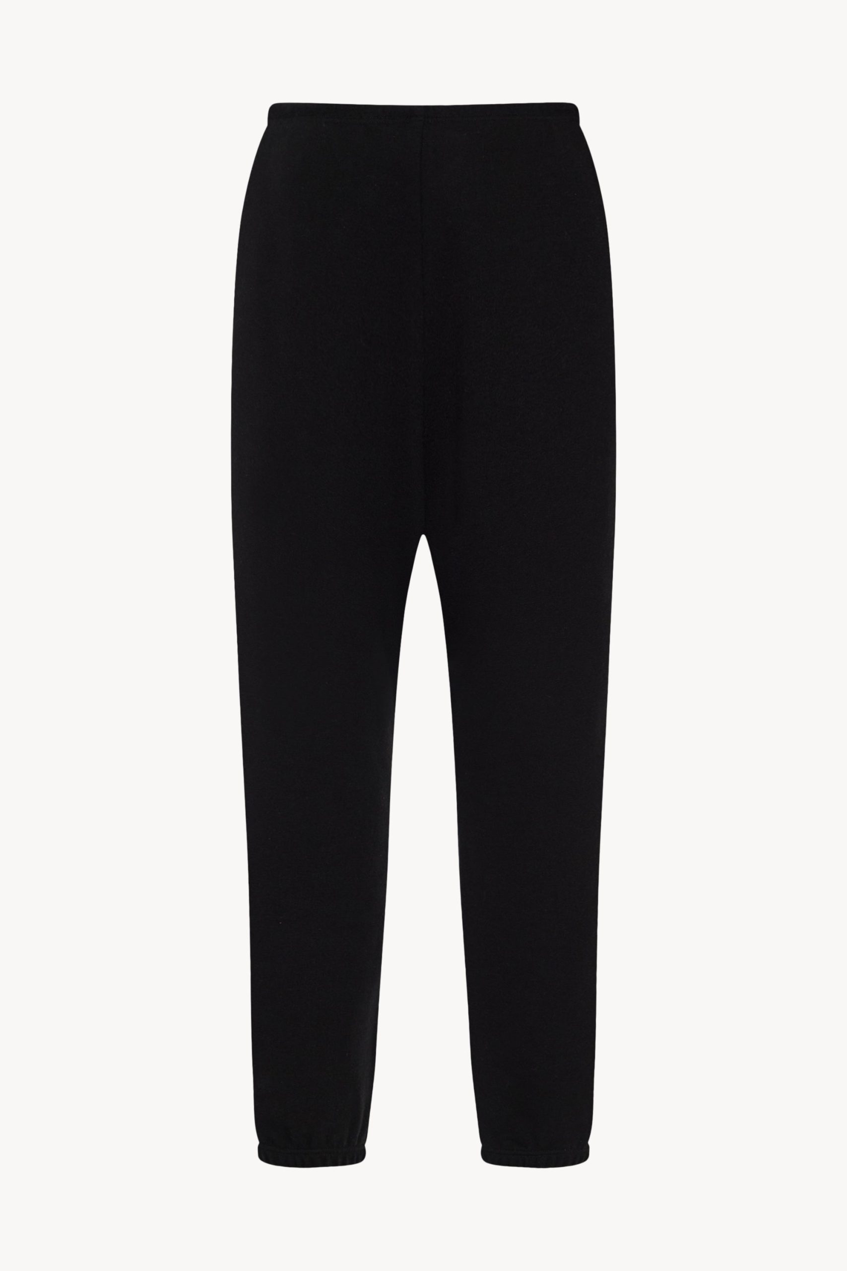 Mid-rise pant in cashmere and cotton French terry with slightly tapered leg. drawstring waist. and side seam pockets.